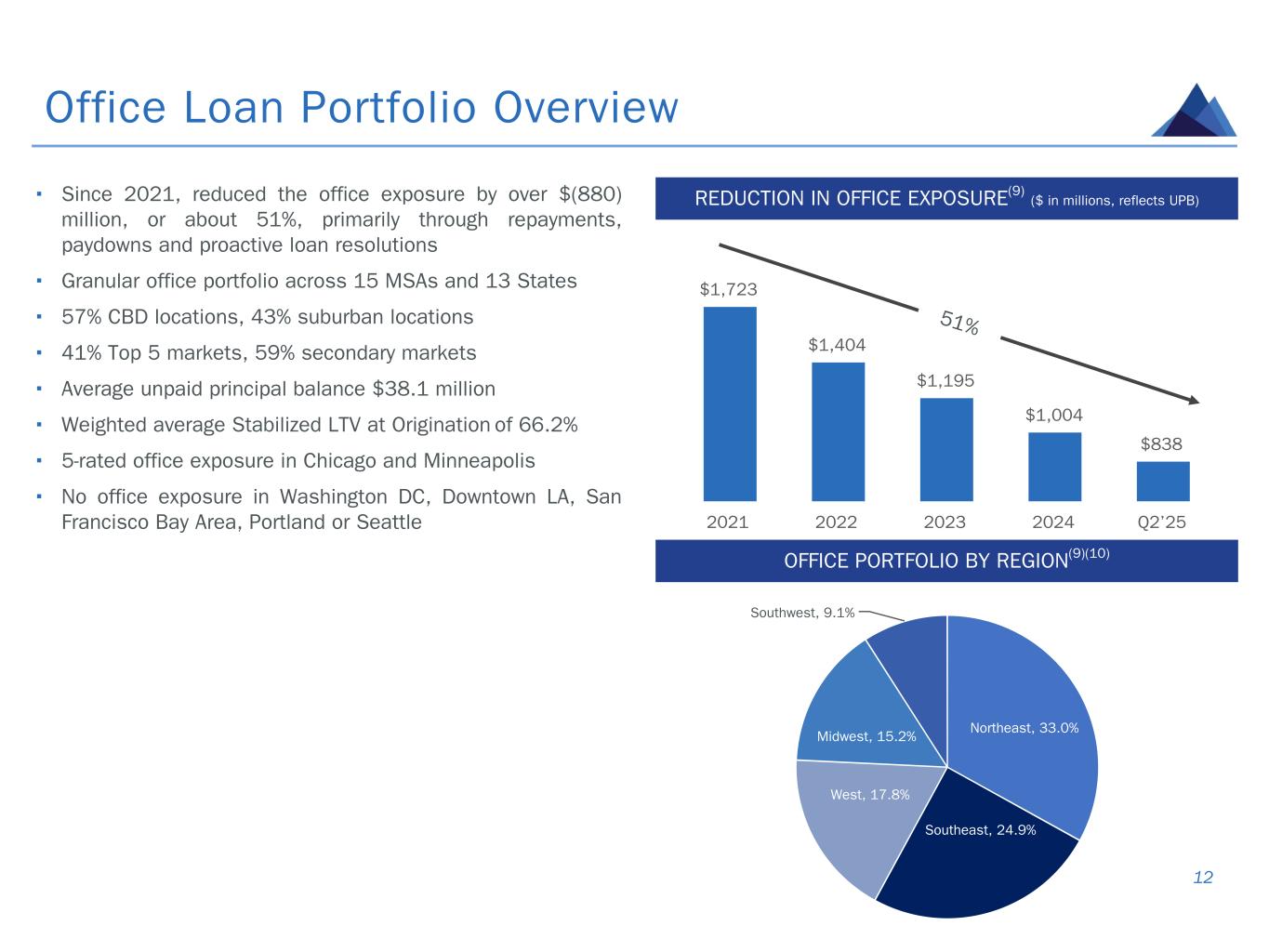 Office Loan Portfolio Overview 12 ▪ Since 2021, reduced the office exposure by over $(880) million, or about 51%, primarily through repayments, paydowns and proactive loan resolutions ▪ Granular office portfolio across 15 MSAs and 13 States ▪ 57% CBD locations, 43% suburban locations ▪ 41% Top 5 markets, 59% secondary markets ▪ Average unpaid principal balance $38.1 million ▪ Weighted average Stabilized LTV at Origination of 66.2% ▪ 5-rated office exposure in Chicago and Minneapolis ▪ No office exposure in Washington DC, Downtown LA, San Francisco Bay Area, Portland or Seattle OFFICE PORTFOLIO BY REGION(9)(10) REDUCTION IN OFFICE EXPOSURE(9) ($ in millions, reflects UPB) $1,723 $1,404 $1,195 $1,004 $838 2021 2022 2023 2024 Q2’25 51% Northeast, 33.0% Southeast, 24.9% West, 17.8% Midwest, 15.2% Southwest, 9.1%