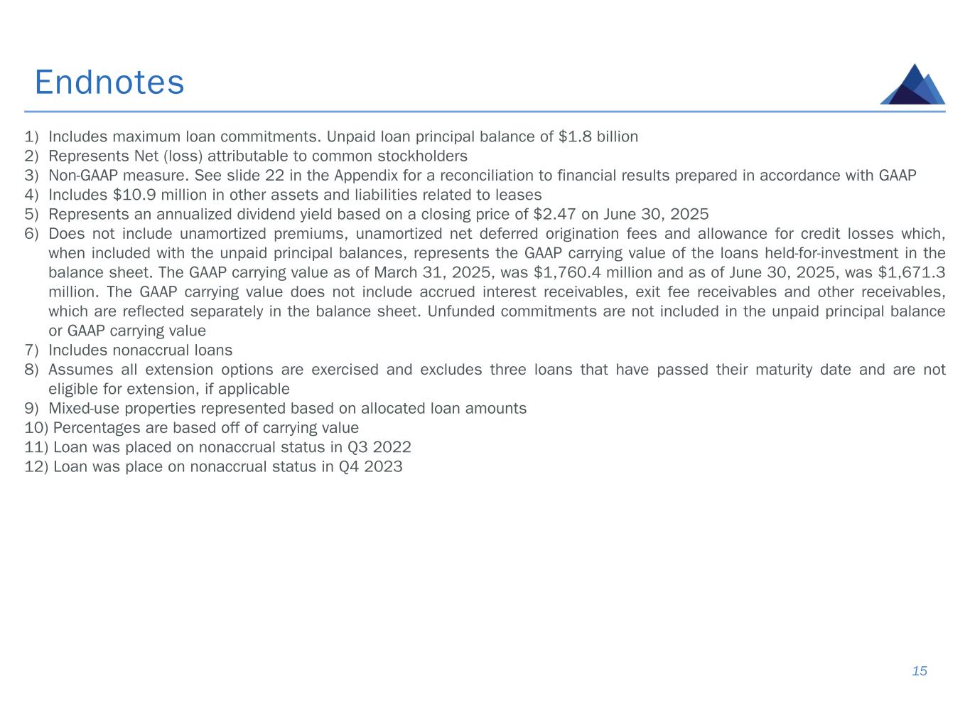 Endnotes 1) Includes maximum loan commitments. Unpaid loan principal balance of $1.8 billion 2) Represents Net (loss) attributable to common stockholders 3) Non-GAAP measure. See slide 22 in the Appendix for a reconciliation to financial results prepared in accordance with GAAP 4) Includes $10.9 million in other assets and liabilities related to leases 5) Represents an annualized dividend yield based on a closing price of $2.47 on June 30, 2025 6) Does not include unamortized premiums, unamortized net deferred origination fees and allowance for credit losses which, when included with the unpaid principal balances, represents the GAAP carrying value of the loans held-for-investment in the balance sheet. The GAAP carrying value as of March 31, 2025, was $1,760.4 million and as of June 30, 2025, was $1,671.3 million. The GAAP carrying value does not include accrued interest receivables, exit fee receivables and other receivables, which are reflected separately in the balance sheet. Unfunded commitments are not included in the unpaid principal balance or GAAP carrying value 7) Includes nonaccrual loans 8) Assumes all extension options are exercised and excludes three loans that have passed their maturity date and are not eligible for extension, if applicable 9) Mixed-use properties represented based on allocated loan amounts 10) Percentages are based off of carrying value 11) Loan was placed on nonaccrual status in Q3 2022 12) Loan was place on nonaccrual status in Q4 2023 15