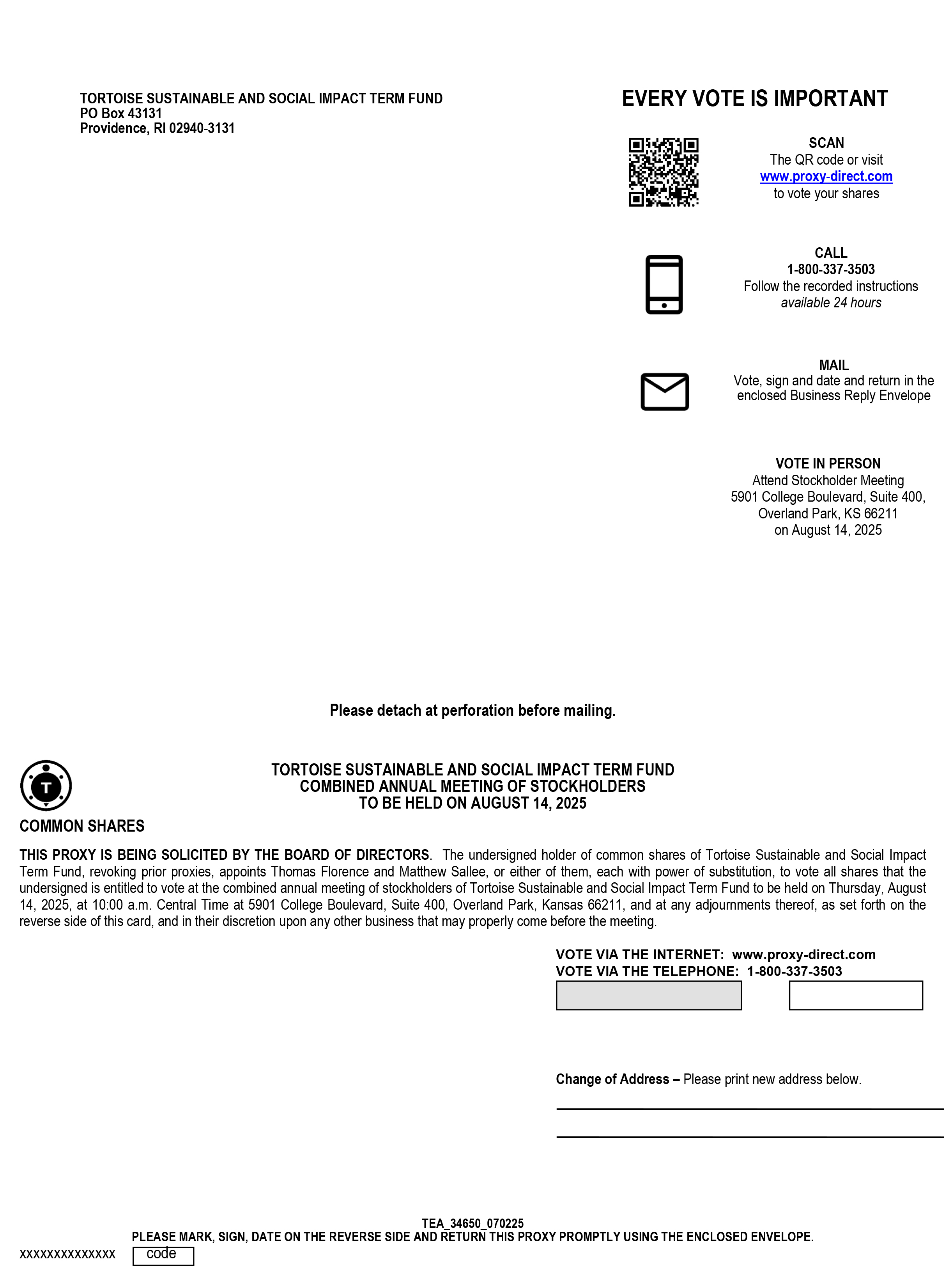 This combined proxy statement is being sent to you by the Boards of Directors of each of Tortoise Energy Infrastructure Corporation (“TYG”) and Tortoise Sustainable and Social Impact Term Fund (“TEAF”) (each a “Company” and collectively, the “Companies”). The Board of Directors of each Company is asking you to complete and return the enclosed proxy card, permitting your shares of the Company to be voted at the annual meeting of stockholders called to be held on August 14, 2025. The Board of Directors of each Company has fixed the close of business on June 25, 2025 as the record date (the “record date”) for the determination of stockholders entitled to notice of and to vote at the meeting and at any adjournment thereof as set forth in this combined proxy statement. This combined proxy statement and the enclosed proxy are first being mailed to stockholders on or about, July 10, 2024.