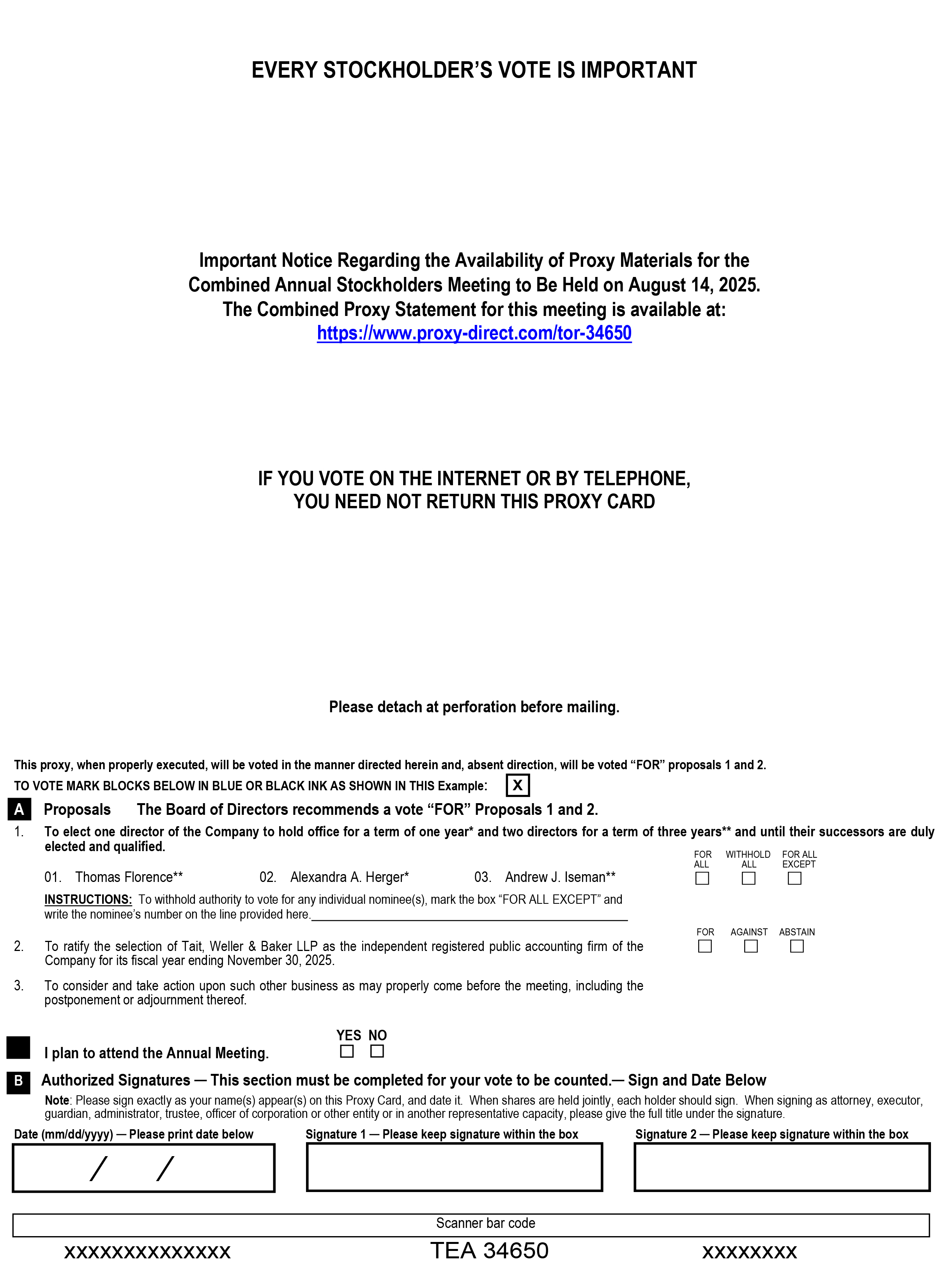 If you return the accompanying proxy card that has been validly executed without indicating how your shares should be voted on a matter and you do not revoke your proxy, your proxy will be voted FOR the election of Thomas Florence and Alexandra Herger (Proposal 1), FOR the ratification and appointment of Tait, Weller & Baker LLP as the Company’s independent registered public accounting firm for its fiscal year ended November 30, 2025 (Proposal 2) and FOR, ABSTAIN, OR AGAINST any other matters acted upon at the meeting in the discretion of the persons named as proxies and as permitted by federal proxy rules and by NYSE rules.