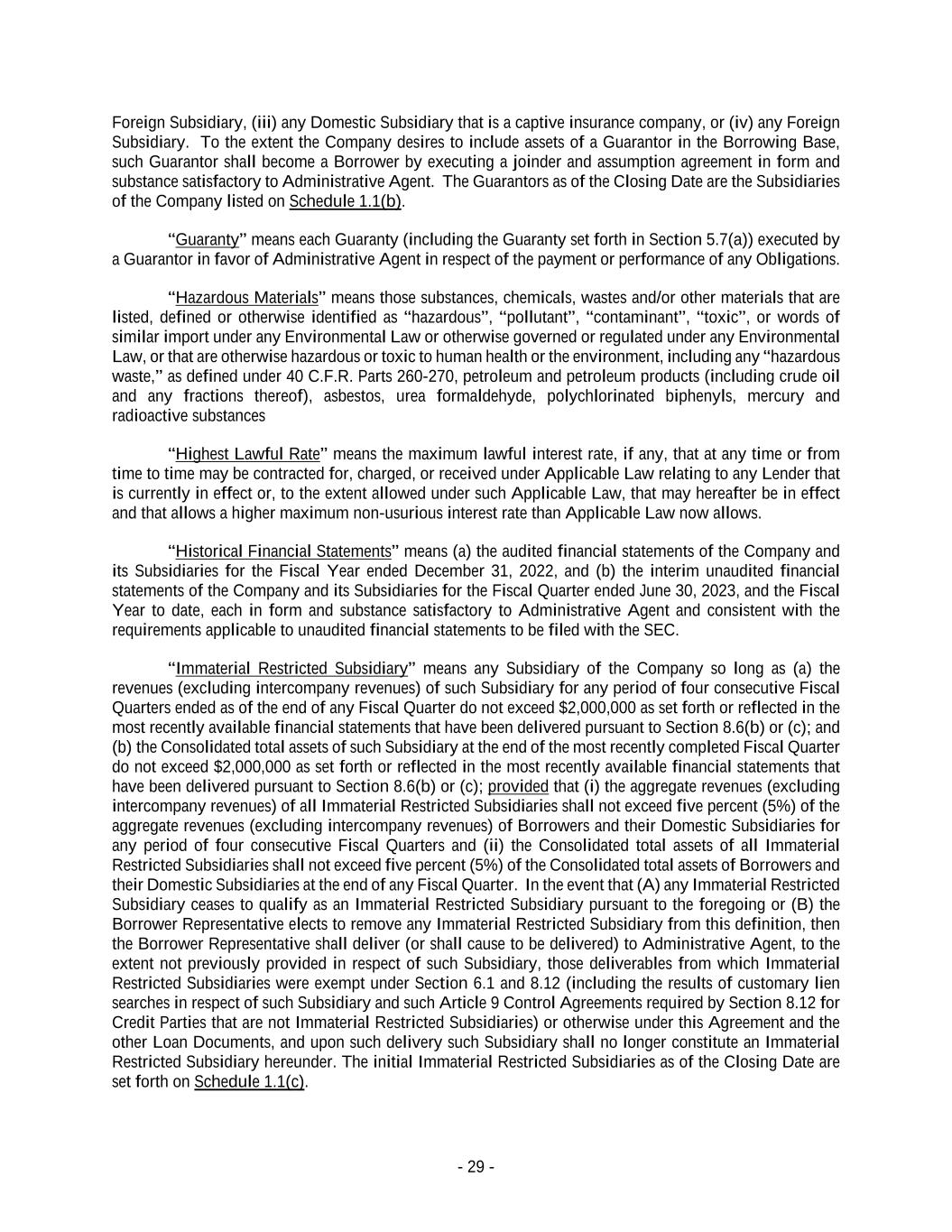 - 29 - Foreign Subsidiary, (iii) any Domestic Subsidiary that is a captive insurance company, or (iv) any Foreign Subsidiary. To the extent the Company desires to include assets of a Guarantor in the Borrowing Base, such Guarantor shall become a Borrower by executing a joinder and assumption agreement in form and substance satisfactory to Administrative Agent. The Guarantors as of the Closing Date are the Subsidiaries of the Company listed on Schedule 1.1(b). “Guaranty” means each Guaranty (including the Guaranty set forth in Section 5.7(a)) executed by a Guarantor in favor of Administrative Agent in respect of the payment or performance of any Obligations. “Hazardous Materials” means those substances, chemicals, wastes and/or other materials that are listed, defined or otherwise identified as “hazardous”, “pollutant”, “contaminant”, “toxic”, or words of similar import under any Environmental Law or otherwise governed or regulated under any Environmental Law, or that are otherwise hazardous or toxic to human health or the environment, including any “hazardous waste,” as defined under 40 C.F.R. Parts 260-270, petroleum and petroleum products (including crude oil and any fractions thereof), asbestos, urea formaldehyde, polychlorinated biphenyls, mercury and radioactive substances “Highest Lawful Rate” means the maximum lawful interest rate, if any, that at any time or from time to time may be contracted for, charged, or received under Applicable Law relating to any Lender that is currently in effect or, to the extent allowed under such Applicable Law, that may hereafter be in effect and that allows a higher maximum non-usurious interest rate than Applicable Law now allows. “Historical Financial Statements” means (a) the audited financial statements of the Company and its Subsidiaries for the Fiscal Year ended December 31, 2022, and (b) the interim unaudited financial statements of the Company and its Subsidiaries for the Fiscal Quarter ended June 30, 2023, and the Fiscal Year to date, each in form and substance satisfactory to Administrative Agent and consistent with the requirements applicable to unaudited financial statements to be filed with the SEC. “Immaterial Restricted Subsidiary” means any Subsidiary of the Company so long as (a) the revenues (excluding intercompany revenues) of such Subsidiary for any period of four consecutive Fiscal Quarters ended as of the end of any Fiscal Quarter do not exceed $2,000,000 as set forth or reflected in the most recently available financial statements that have been delivered pursuant to Section 8.6(b) or (c); and (b) the Consolidated total assets of such Subsidiary at the end of the most recently completed Fiscal Quarter do not exceed $2,000,000 as set forth or reflected in the most recently available financial statements that have been delivered pursuant to Section 8.6(b) or (c); provided that (i) the aggregate revenues (excluding intercompany revenues) of all Immaterial Restricted Subsidiaries shall not exceed five percent (5%) of the aggregate revenues (excluding intercompany revenues) of Borrowers and their Domestic Subsidiaries for any period of four consecutive Fiscal Quarters and (ii) the Consolidated total assets of all Immaterial Restricted Subsidiaries shall not exceed five percent (5%) of the Consolidated total assets of Borrowers and their Domestic Subsidiaries at the end of any Fiscal Quarter. In the event that (A) any Immaterial Restricted Subsidiary ceases to qualify as an Immaterial Restricted Subsidiary pursuant to the foregoing or (B) the Borrower Representative elects to remove any Immaterial Restricted Subsidiary from this definition, then the Borrower Representative shall deliver (or shall cause to be delivered) to Administrative Agent, to the extent not previously provided in respect of such Subsidiary, those deliverables from which Immaterial Restricted Subsidiaries were exempt under Section 6.1 and 8.12 (including the results of customary lien searches in respect of such Subsidiary and such Article 9 Control Agreements required by Section 8.12 for Credit Parties that are not Immaterial Restricted Subsidiaries) or otherwise under this Agreement and the other Loan Documents, and upon such delivery such Subsidiary shall no longer constitute an Immaterial Restricted Subsidiary hereunder. The initial Immaterial Restricted Subsidiaries as of the Closing Date are set forth on Schedule 1.1(c).