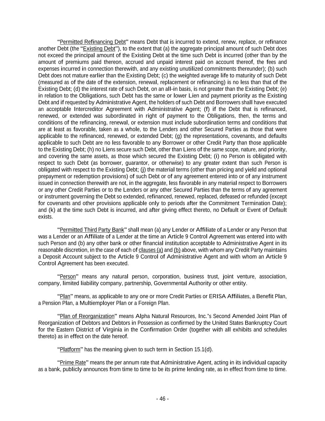 - 46 - “Permitted Refinancing Debt” means Debt that is incurred to extend, renew, replace, or refinance another Debt (the “Existing Debt”), to the extent that (a) the aggregate principal amount of such Debt does not exceed the principal amount of the Existing Debt at the time such Debt is incurred (other than by the amount of premiums paid thereon, accrued and unpaid interest paid on account thereof, the fees and expenses incurred in connection therewith, and any existing unutilized commitments thereunder); (b) such Debt does not mature earlier than the Existing Debt; (c) the weighted average life to maturity of such Debt (measured as of the date of the extension, renewal, replacement or refinancing) is no less than that of the Existing Debt; (d) the interest rate of such Debt, on an all-in basis, is not greater than the Existing Debt; (e) in relation to the Obligations, such Debt has the same or lower Lien and payment priority as the Existing Debt and if requested by Administrative Agent, the holders of such Debt and Borrowers shall have executed an acceptable Intercreditor Agreement with Administrative Agent; (f) if the Debt that is refinanced, renewed, or extended was subordinated in right of payment to the Obligations, then, the terms and conditions of the refinancing, renewal, or extension must include subordination terms and conditions that are at least as favorable, taken as a whole, to the Lenders and other Secured Parties as those that were applicable to the refinanced, renewed, or extended Debt; (g) the representations, covenants, and defaults applicable to such Debt are no less favorable to any Borrower or other Credit Party than those applicable to the Existing Debt; (h) no Liens secure such Debt, other than Liens of the same scope, nature, and priority, and covering the same assets, as those which secured the Existing Debt; (i) no Person is obligated with respect to such Debt (as borrower, guarantor, or otherwise) to any greater extent than such Person is obligated with respect to the Existing Debt; (j) the material terms (other than pricing and yield and optional prepayment or redemption provisions) of such Debt or of any agreement entered into or of any instrument issued in connection therewith are not, in the aggregate, less favorable in any material respect to Borrowers or any other Credit Parties or to the Lenders or any other Secured Parties than the terms of any agreement or instrument governing the Debt so extended, refinanced, renewed, replaced, defeased or refunded (except for covenants and other provisions applicable only to periods after the Commitment Termination Date); and (k) at the time such Debt is incurred, and after giving effect thereto, no Default or Event of Default exists. “Permitted Third Party Bank” shall mean (a) any Lender or Affiliate of a Lender or any Person that was a Lender or an Affiliate of a Lender at the time an Article 9 Control Agreement was entered into with such Person and (b) any other bank or other financial institution acceptable to Administrative Agent in its reasonable discretion, in the case of each of clauses (a) and (b) above, with whom any Credit Party maintains a Deposit Account subject to the Article 9 Control of Administrative Agent and with whom an Article 9 Control Agreement has been executed. “Person” means any natural person, corporation, business trust, joint venture, association, company, limited liability company, partnership, Governmental Authority or other entity. “Plan” means, as applicable to any one or more Credit Parties or ERISA Affiliates, a Benefit Plan, a Pension Plan, a Multiemployer Plan or a Foreign Plan. “Plan of Reorganization” means Alpha Natural Resources, Inc.’s Second Amended Joint Plan of Reorganization of Debtors and Debtors in Possession as confirmed by the United States Bankruptcy Court for the Eastern District of Virginia in the Confirmation Order (together with all exhibits and schedules thereto) as in effect on the date hereof. “Platform” has the meaning given to such term in Section 15.1(d). “Prime Rate” means the per annum rate that Administrative Agent, acting in its individual capacity as a bank, publicly announces from time to time to be its prime lending rate, as in effect from time to time.