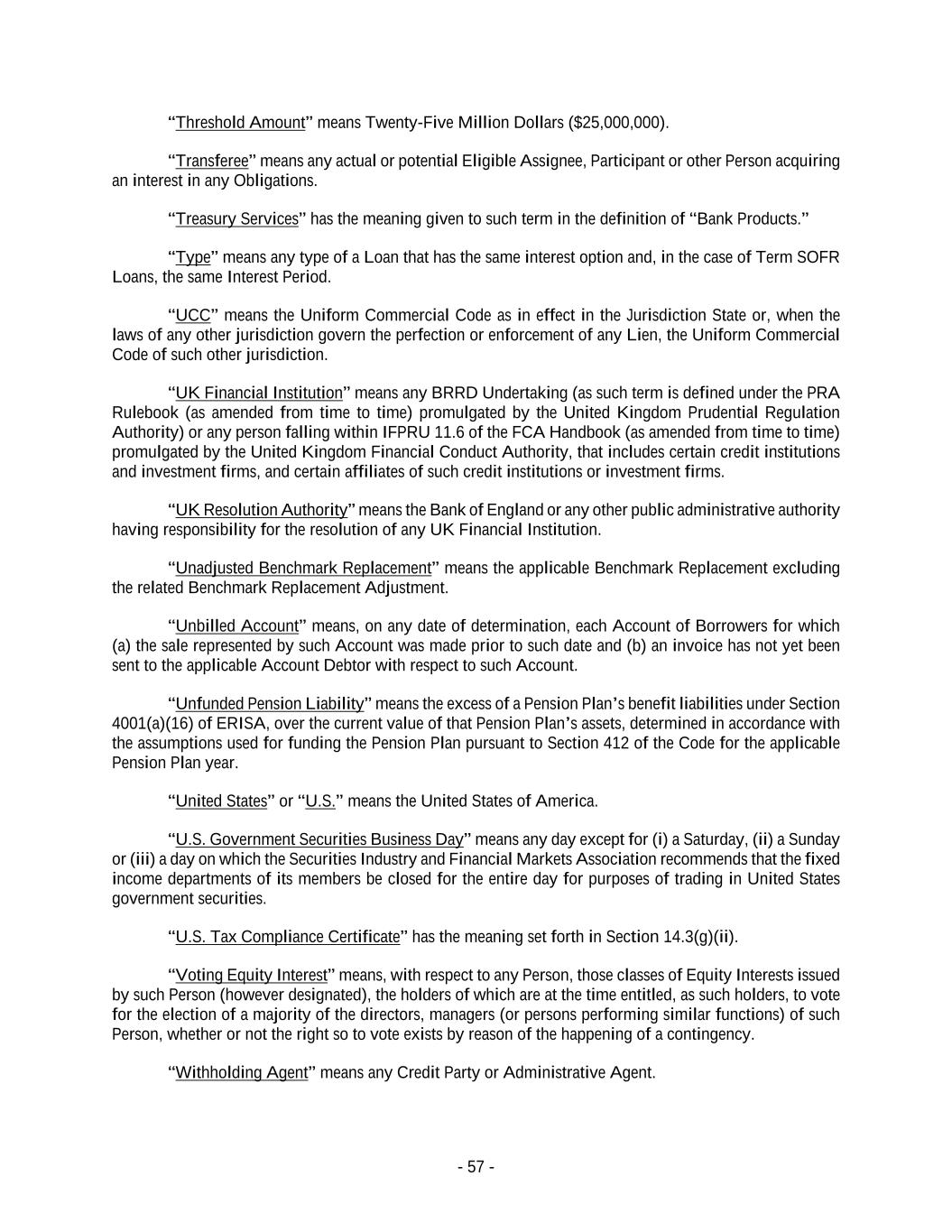 - 57 - “Threshold Amount” means Twenty-Five Million Dollars ($25,000,000). “Transferee” means any actual or potential Eligible Assignee, Participant or other Person acquiring an interest in any Obligations. “Treasury Services” has the meaning given to such term in the definition of “Bank Products.” “Type” means any type of a Loan that has the same interest option and, in the case of Term SOFR Loans, the same Interest Period. “UCC” means the Uniform Commercial Code as in effect in the Jurisdiction State or, when the laws of any other jurisdiction govern the perfection or enforcement of any Lien, the Uniform Commercial Code of such other jurisdiction. “UK Financial Institution” means any BRRD Undertaking (as such term is defined under the PRA Rulebook (as amended from time to time) promulgated by the United Kingdom Prudential Regulation Authority) or any person falling within IFPRU 11.6 of the FCA Handbook (as amended from time to time) promulgated by the United Kingdom Financial Conduct Authority, that includes certain credit institutions and investment firms, and certain affiliates of such credit institutions or investment firms. “UK Resolution Authority” means the Bank of England or any other public administrative authority having responsibility for the resolution of any UK Financial Institution. “Unadjusted Benchmark Replacement” means the applicable Benchmark Replacement excluding the related Benchmark Replacement Adjustment. “Unbilled Account” means, on any date of determination, each Account of Borrowers for which (a) the sale represented by such Account was made prior to such date and (b) an invoice has not yet been sent to the applicable Account Debtor with respect to such Account. “Unfunded Pension Liability” means the excess of a Pension Plan’s benefit liabilities under Section 4001(a)(16) of ERISA, over the current value of that Pension Plan’s assets, determined in accordance with the assumptions used for funding the Pension Plan pursuant to Section 412 of the Code for the applicable Pension Plan year. “United States” or “U.S.” means the United States of America. “U.S. Government Securities Business Day” means any day except for (i) a Saturday, (ii) a Sunday or (iii) a day on which the Securities Industry and Financial Markets Association recommends that the fixed income departments of its members be closed for the entire day for purposes of trading in United States government securities. “U.S. Tax Compliance Certificate” has the meaning set forth in Section 14.3(g)(ii). “Voting Equity Interest” means, with respect to any Person, those classes of Equity Interests issued by such Person (however designated), the holders of which are at the time entitled, as such holders, to vote for the election of a majority of the directors, managers (or persons performing similar functions) of such Person, whether or not the right so to vote exists by reason of the happening of a contingency. “Withholding Agent” means any Credit Party or Administrative Agent.