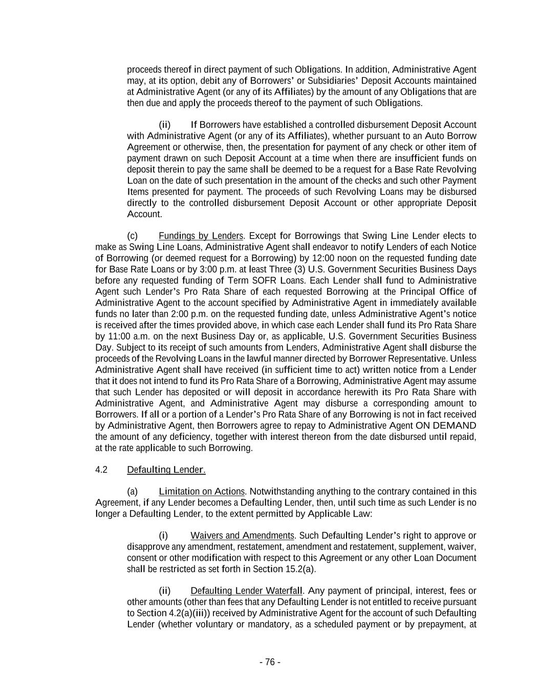 - 76 - proceeds thereof in direct payment of such Obligations. In addition, Administrative Agent may, at its option, debit any of Borrowers’ or Subsidiaries’ Deposit Accounts maintained at Administrative Agent (or any of its Affiliates) by the amount of any Obligations that are then due and apply the proceeds thereof to the payment of such Obligations. (ii) If Borrowers have established a controlled disbursement Deposit Account with Administrative Agent (or any of its Affiliates), whether pursuant to an Auto Borrow Agreement or otherwise, then, the presentation for payment of any check or other item of payment drawn on such Deposit Account at a time when there are insufficient funds on deposit therein to pay the same shall be deemed to be a request for a Base Rate Revolving Loan on the date of such presentation in the amount of the checks and such other Payment Items presented for payment. The proceeds of such Revolving Loans may be disbursed directly to the controlled disbursement Deposit Account or other appropriate Deposit Account. (c) Fundings by Lenders. Except for Borrowings that Swing Line Lender elects to make as Swing Line Loans, Administrative Agent shall endeavor to notify Lenders of each Notice of Borrowing (or deemed request for a Borrowing) by 12:00 noon on the requested funding date for Base Rate Loans or by 3:00 p.m. at least Three (3) U.S. Government Securities Business Days before any requested funding of Term SOFR Loans. Each Lender shall fund to Administrative Agent such Lender’s Pro Rata Share of each requested Borrowing at the Principal Office of Administrative Agent to the account specified by Administrative Agent in immediately available funds no later than 2:00 p.m. on the requested funding date, unless Administrative Agent’s notice is received after the times provided above, in which case each Lender shall fund its Pro Rata Share by 11:00 a.m. on the next Business Day or, as applicable, U.S. Government Securities Business Day. Subject to its receipt of such amounts from Lenders, Administrative Agent shall disburse the proceeds of the Revolving Loans in the lawful manner directed by Borrower Representative. Unless Administrative Agent shall have received (in sufficient time to act) written notice from a Lender that it does not intend to fund its Pro Rata Share of a Borrowing, Administrative Agent may assume that such Lender has deposited or will deposit in accordance herewith its Pro Rata Share with Administrative Agent, and Administrative Agent may disburse a corresponding amount to Borrowers. If all or a portion of a Lender’s Pro Rata Share of any Borrowing is not in fact received by Administrative Agent, then Borrowers agree to repay to Administrative Agent ON DEMAND the amount of any deficiency, together with interest thereon from the date disbursed until repaid, at the rate applicable to such Borrowing. 4.2 Defaulting Lender. (a) Limitation on Actions. Notwithstanding anything to the contrary contained in this Agreement, if any Lender becomes a Defaulting Lender, then, until such time as such Lender is no longer a Defaulting Lender, to the extent permitted by Applicable Law: (i) Waivers and Amendments. Such Defaulting Lender’s right to approve or disapprove any amendment, restatement, amendment and restatement, supplement, waiver, consent or other modification with respect to this Agreement or any other Loan Document shall be restricted as set forth in Section 15.2(a). (ii) Defaulting Lender Waterfall. Any payment of principal, interest, fees or other amounts (other than fees that any Defaulting Lender is not entitled to receive pursuant to Section 4.2(a)(iii)) received by Administrative Agent for the account of such Defaulting Lender (whether voluntary or mandatory, as a scheduled payment or by prepayment, at
