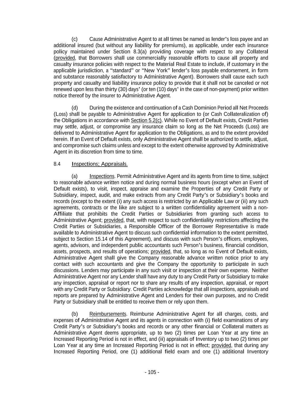 - 165 - resulted solely from the gross negligence, bad faith or willful misconduct or a material breach of its obligations under the Loan Documents of such Indemnitee. In addition to all other Obligations, the obligations and liabilities described in this Section 15.3 shall (a) constitute Obligations; (b) be in addition to, and cumulative with, any other indemnification provisions set forth elsewhere in this Agreement or any other Loan Document; (c) be secured by the Collateral; (d) be due and payable by Credit Parties ON DEMAND; (e) be chargeable against Borrowers’ in the manner set forth in Section 4.1(b) (provided, however, that Administrative Agent shall have no obligation to charge such amounts in such manner); and (f) survive termination of this Agreement and the other Loan Documents. In addition to the foregoing, Administrative Agent shall have the right at any time or from time to time while any Event of Default is continuing, to require that the obligations and liabilities described in this Section 15.3 be Cash Collateralized. This Section 15.3 shall not apply with respect to Taxes other than any Taxes that represent claims, damages or losses arising from any non-Tax claim. 15.4 Reimbursement Obligations. Without limiting the terms of Section 15.3, Credit Parties shall reimburse Administrative Agent for all Extraordinary Expenses and for all reasonable and documented legal, accounting, appraisal, consulting, and other fees and costs and expenses incurred by it in connection with (a) negotiation and preparation of this Agreement and the other Loan Documents, including any amendment, forbearance, waiver, restatement, supplement, waiver, consent or other modification thereof; (b) administration of and actions relating to any Collateral, this Agreement, any Loan Document, and the transactions contemplated hereby and thereby (including any actions taken to establish, perfect or maintain priority of Administrative Agent’s Liens in and to any Collateral, to maintain any insurance required hereunder, or to verify (or preserve) the existence or value of Collateral); (c) use of any Platform or Register, (d) credit investigations and background checks; and (e) subject to the limits of Section 8.4(b), each inspection, field audit, field examination, or appraisal with respect to any Credit Party, Subsidiary, or Collateral, whether prepared by Administrative Agent’s personnel or a third party. Credit Parties also shall pay all Extraordinary Expenses of Administrative Agent and all reasonable and documented legal, accounting, appraisal, consulting, and other fees and costs and expenses incurred by Administrative Agent (and, subject to the limitations set forth below in this sentence, legal fees and expenses incurred by one primary counsel to the Lenders) in connection with the enforcement of, or any “workout,” “restructuring,” or an Insolvency Proceeding concerning any Credit Party or any of its Subsidiaries or in exercising rights or remedies under the Loan Documents, or defending any of the Loan Documents, irrespective of whether a lawsuit or other Adverse Proceeding is brought, or in taking any enforcement action or any remedial action with respect to any Collateral (provided, that, the fees and expenses of counsel that are reimbursable pursuant hereto shall in any event be limited to one primary counsel to Administrative Agent and one primary counsel to the Lenders, one local counsel to Administrative Agent in each jurisdiction, that it determines to be necessary, one specialty counsel to Administrative Agent in each specialty area that it determines to be necessary (including insolvency law), and one or more additional counsel to Lenders in the case of an actual or potential conflict of interest). The parties agree that the costs and expenses indemnified by the Credit Parties hereunder shall not include expenses relating to disputes solely between or among the Lenders, in their respective capacities as such, or any dispute solely between or among a Lender, in its capacity as such, and its Affiliates (excluding, for the avoidance of doubt, expenses arising (i) in connection with disputes involving Administrative Agent (in its capacity as such) or the LC Issuer (in its capacity as such) on the one hand, and one or more Lenders, or one or more of their Affiliates, on the other hand) or (ii) from acts or omissions of any Credit Parties or their Subsidiaries. 15.5 Performance of Credit Parties’ Obligations. Administrative Agent may, in its discretion at any time and from time to time, at Credit Parties’ expense, pay any amount or do any act required of a Credit Party under any Loan Document or otherwise requested by Administrative Agent to (a) enforce any Loan Documents or collect any Obligations; (b) protect, insure, maintain or realize upon any Collateral; or (c) defend or maintain the validity or priority of Administrative Agent’s Liens in any Collateral, including any payment of any claim by any Third Party Claimant (including any judgment, insurance premium,