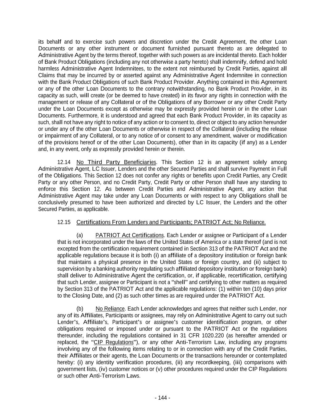 - 144 - its behalf and to exercise such powers and discretion under the Credit Agreement, the other Loan Documents or any other instrument or document furnished pursuant thereto as are delegated to Administrative Agent by the terms thereof, together with such powers as are incidental thereto. Each holder of Bank Product Obligations (including any not otherwise a party hereto) shall indemnify, defend and hold harmless Administrative Agent Indemnitees, to the extent not reimbursed by Credit Parties, against all Claims that may be incurred by or asserted against any Administrative Agent Indemnitee in connection with the Bank Product Obligations of such Bank Product Provider. Anything contained in this Agreement or any of the other Loan Documents to the contrary notwithstanding, no Bank Product Provider, in its capacity as such, will create (or be deemed to have created) in its favor any rights in connection with the management or release of any Collateral or of the Obligations of any Borrower or any other Credit Party under the Loan Documents except as otherwise may be expressly provided herein or in the other Loan Documents. Furthermore, it is understood and agreed that each Bank Product Provider, in its capacity as such, shall not have any right to notice of any action or to consent to, direct or object to any action hereunder or under any of the other Loan Documents or otherwise in respect of the Collateral (including the release or impairment of any Collateral, or to any notice of or consent to any amendment, waiver or modification of the provisions hereof or of the other Loan Documents), other than in its capacity (if any) as a Lender and, in any event, only as expressly provided herein or therein. 12.14 No Third Party Beneficiaries. This Section 12 is an agreement solely among Administrative Agent, LC Issuer, Lenders and the other Secured Parties and shall survive Payment in Full of the Obligations. This Section 12 does not confer any rights or benefits upon Credit Parties, any Credit Party or any other Person, and no Credit Party, Credit Party or other Person shall have any standing to enforce this Section 12. As between Credit Parties and Administrative Agent, any action that Administrative Agent may take under any Loan Documents or with respect to any Obligations shall be conclusively presumed to have been authorized and directed by LC Issuer, the Lenders and the other Secured Parties, as applicable. 12.15 Certifications From Lenders and Participants; PATRIOT Act; No Reliance. (a) PATRIOT Act Certifications. Each Lender or assignee or Participant of a Lender that is not incorporated under the laws of the United States of America or a state thereof (and is not excepted from the certification requirement contained in Section 313 of the PATRIOT Act and the applicable regulations because it is both (i) an affiliate of a depository institution or foreign bank that maintains a physical presence in the United States or foreign country, and (ii) subject to supervision by a banking authority regulating such affiliated depository institution or foreign bank) shall deliver to Administrative Agent the certification, or, if applicable, recertification, certifying that such Lender, assignee or Participant is not a “shell” and certifying to other matters as required by Section 313 of the PATRIOT Act and the applicable regulations: (1) within ten (10) days prior to the Closing Date, and (2) as such other times as are required under the PATRIOT Act. (b) No Reliance. Each Lender acknowledges and agrees that neither such Lender, nor any of its Affiliates, Participants or assignees, may rely on Administrative Agent to carry out such Lender’s, Affiliate’s, Participant’s or assignee’s customer identification program, or other obligations required or imposed under or pursuant to the PATRIOT Act or the regulations thereunder, including the regulations contained in 31 CFR 1020.220 (as hereafter amended or replaced, the “CIP Regulations”), or any other Anti-Terrorism Law, including any programs involving any of the following items relating to or in connection with any of the Credit Parties, their Affiliates or their agents, the Loan Documents or the transactions hereunder or contemplated hereby: (i) any identity verification procedures, (ii) any recordkeeping, (iii) comparisons with government lists, (iv) customer notices or (v) other procedures required under the CIP Regulations or such other Anti-Terrorism Laws.