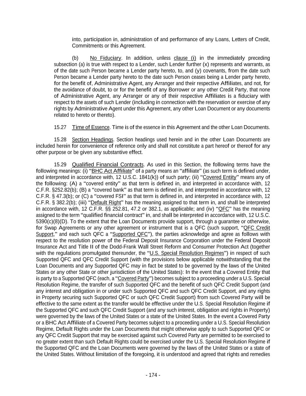 - 174 - into, participation in, administration of and performance of any Loans, Letters of Credit, Commitments or this Agreement. (b) No Fiduciary. In addition, unless clause (i) in the immediately preceding subsection (a) is true with respect to a Lender, such Lender further (x) represents and warrants, as of the date such Person became a Lender party hereto, to, and (y) covenants, from the date such Person became a Lender party hereto to the date such Person ceases being a Lender party hereto, for the benefit of, Administrative Agent, any Arranger and their respective Affiliates, and not, for the avoidance of doubt, to or for the benefit of any Borrower or any other Credit Party, that none of Administrative Agent, any Arranger or any of their respective Affiliates is a fiduciary with respect to the assets of such Lender (including in connection with the reservation or exercise of any rights by Administrative Agent under this Agreement, any other Loan Document or any documents related to hereto or thereto). 15.27 Time of Essence. Time is of the essence in this Agreement and the other Loan Documents. 15.28 Section Headings. Section headings used herein and in the other Loan Documents are included herein for convenience of reference only and shall not constitute a part hereof or thereof for any other purpose or be given any substantive effect. 15.29 Qualified Financial Contracts. As used in this Section, the following terms have the following meanings: (i) “BHC Act Affiliate” of a party means an “affiliate” (as such term is defined under, and interpreted in accordance with, 12 U.S.C. 1841(k)) of such party; (ii) “Covered Entity” means any of the following: (A) a “covered entity” as that term is defined in, and interpreted in accordance with, 12 C.F.R. §252.82(b); (B) a “covered bank” as that term is defined in, and interpreted in accordance with, 12 C.F.R. § 47.3(b); or (C) a “covered FSI” as that term is defined in, and interpreted in accordance with, 12 C.F.R. § 382.2(b); (iii) “Default Right” has the meaning assigned to that term in, and shall be interpreted in accordance with, 12 C.F.R. §§ 252.81, 47.2 or 382.1, as applicable; and (iv) “QFC” has the meaning assigned to the term “qualified financial contract” in, and shall be interpreted in accordance with, 12 U.S.C. 5390(c)(8)(D). To the extent that the Loan Documents provide support, through a guarantee or otherwise, for Swap Agreements or any other agreement or instrument that is a QFC (such support, “QFC Credit Support,” and each such QFC a “Supported QFC”), the parties acknowledge and agree as follows with respect to the resolution power of the Federal Deposit Insurance Corporation under the Federal Deposit Insurance Act and Title II of the Dodd-Frank Wall Street Reform and Consumer Protection Act (together with the regulations promulgated thereunder, the “U.S. Special Resolution Regimes”) in respect of such Supported QFC and QFC Credit Support (with the provisions below applicable notwithstanding that the Loan Documents and any Supported QFC may in fact be stated to be governed by the laws of the United States or any other State or other jurisdiction of the United States): In the event that a Covered Entity that is party to a Supported QFC (each, a “Covered Party”) becomes subject to a proceeding under a U.S. Special Resolution Regime, the transfer of such Supported QFC and the benefit of such QFC Credit Support (and any interest and obligation in or under such Supported QFC and such QFC Credit Support, and any rights in Property securing such Supported QFC or such QFC Credit Support) from such Covered Party will be effective to the same extent as the transfer would be effective under the U.S. Special Resolution Regime if the Supported QFC and such QFC Credit Support (and any such interest, obligation and rights in Property) were governed by the laws of the United States or a state of the United States. In the event a Covered Party or a BHC Act Affiliate of a Covered Party becomes subject to a proceeding under a U.S. Special Resolution Regime, Default Rights under the Loan Documents that might otherwise apply to such Supported QFC or any QFC Credit Support that may be exercised against such Covered Party are permitted to be exercised to no greater extent than such Default Rights could be exercised under the U.S. Special Resolution Regime if the Supported QFC and the Loan Documents were governed by the laws of the United States or a state of the United States. Without limitation of the foregoing, it is understood and agreed that rights and remedies