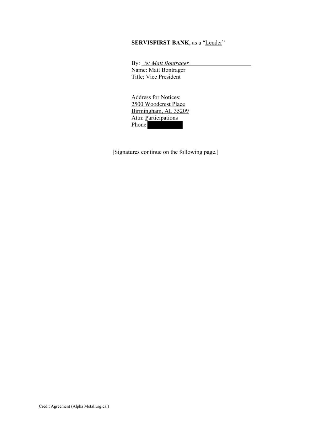 Credit Agreement (Alpha Metallurgical) SERVISFIRST BANK, as a “Lender” By: /s/ Matt Bontrager Name: Matt Bontrager Title: Vice President Address for Notices: 2500 Woodcrest Place Birmingham, AL 35209 Attn: Participations Phone [Signatures continue on the following page.]