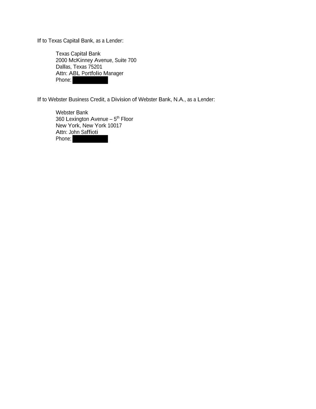 If to Texas Capital Bank, as a Lender: Texas Capital Bank 2000 McKinney Avenue, Suite 700 Dallas, Texas 75201 Attn: ABL Portfolio Manager Phone: If to Webster Business Credit, a Division of Webster Bank, N.A., as a Lender: Webster Bank 360 Lexington Avenue – 5th Floor New York, New York 10017 Attn: John Saffioti Phone: