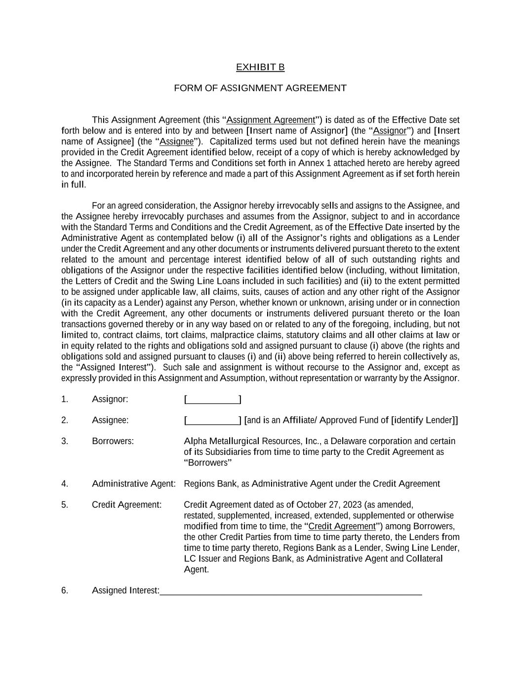 EXHIBIT B FORM OF ASSIGNMENT AGREEMENT This Assignment Agreement (this “Assignment Agreement”) is dated as of the Effective Date set forth below and is entered into by and between [Insert name of Assignor] (the “Assignor”) and [Insert name of Assignee] (the “Assignee”). Capitalized terms used but not defined herein have the meanings provided in the Credit Agreement identified below, receipt of a copy of which is hereby acknowledged by the Assignee. The Standard Terms and Conditions set forth in Annex 1 attached hereto are hereby agreed to and incorporated herein by reference and made a part of this Assignment Agreement as if set forth herein in full. For an agreed consideration, the Assignor hereby irrevocably sells and assigns to the Assignee, and the Assignee hereby irrevocably purchases and assumes from the Assignor, subject to and in accordance with the Standard Terms and Conditions and the Credit Agreement, as of the Effective Date inserted by the Administrative Agent as contemplated below (i) all of the Assignor’s rights and obligations as a Lender under the Credit Agreement and any other documents or instruments delivered pursuant thereto to the extent related to the amount and percentage interest identified below of all of such outstanding rights and obligations of the Assignor under the respective facilities identified below (including, without limitation, the Letters of Credit and the Swing Line Loans included in such facilities) and (ii) to the extent permitted to be assigned under applicable law, all claims, suits, causes of action and any other right of the Assignor (in its capacity as a Lender) against any Person, whether known or unknown, arising under or in connection with the Credit Agreement, any other documents or instruments delivered pursuant thereto or the loan transactions governed thereby or in any way based on or related to any of the foregoing, including, but not limited to, contract claims, tort claims, malpractice claims, statutory claims and all other claims at law or in equity related to the rights and obligations sold and assigned pursuant to clause (i) above (the rights and obligations sold and assigned pursuant to clauses (i) and (ii) above being referred to herein collectively as, the “Assigned Interest”). Such sale and assignment is without recourse to the Assignor and, except as expressly provided in this Assignment and Assumption, without representation or warranty by the Assignor. 1. Assignor: [___________] 2. Assignee: [___________] [and is an Affiliate/ Approved Fund of [identify Lender]] 3. Borrowers: Alpha Metallurgical Resources, Inc., a Delaware corporation and certain of its Subsidiaries from time to time party to the Credit Agreement as “Borrowers” 4. Administrative Agent: Regions Bank, as Administrative Agent under the Credit Agreement 5. Credit Agreement: Credit Agreement dated as of October 27, 2023 (as amended, restated, supplemented, increased, extended, supplemented or otherwise modified from time to time, the “Credit Agreement”) among Borrowers, the other Credit Parties from time to time party thereto, the Lenders from time to time party thereto, Regions Bank as a Lender, Swing Line Lender, LC Issuer and Regions Bank, as Administrative Agent and Collateral Agent. 6. Assigned Interest:________________________________________________________