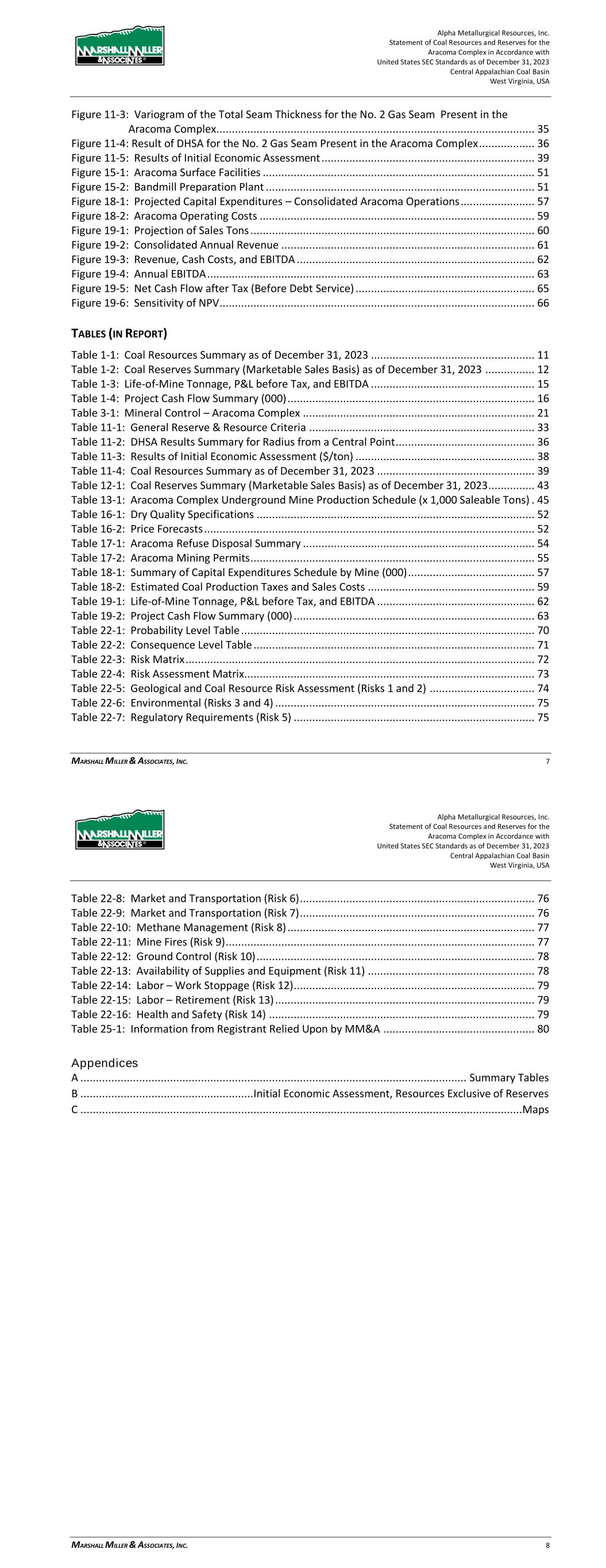 Alpha Metallurgical Resources, Inc. Statement of Coal Resources and Reserves for the Aracoma Complex in Accordance with United States SEC Standards as of December 31, 2023 Central Appalachian Coal Basin West Virginia, USA MARSHALL MILLER & ASSOCIATES, INC. 7 Figure 11-3: Variogram of the Total Seam Thickness for the No. 2 Gas Seam Present in the Aracoma Complex....................................................................................................... 35 Figure 11-4: Result of DHSA for the No. 2 Gas Seam Present in the Aracoma Complex .................. 36 Figure 11-5: Results of Initial Economic Assessment ..................................................................... 39 Figure 15-1: Aracoma Surface Facilities ........................................................................................ 51 Figure 15-2: Bandmill Preparation Plant ....................................................................................... 51 Figure 18-1: Projected Capital Expenditures – Consolidated Aracoma Operations ........................ 57 Figure 18-2: Aracoma Operating Costs ......................................................................................... 59 Figure 19-1: Projection of Sales Tons ............................................................................................ 60 Figure 19-2: Consolidated Annual Revenue .................................................................................. 61 Figure 19-3: Revenue, Cash Costs, and EBITDA ............................................................................. 62 Figure 19-4: Annual EBITDA .......................................................................................................... 63 Figure 19-5: Net Cash Flow after Tax (Before Debt Service) .......................................................... 65 Figure 19-6: Sensitivity of NPV...................................................................................................... 66 TABLES (IN REPORT) Table 1-1: Coal Resources Summary as of December 31, 2023 ..................................................... 11 Table 1-2: Coal Reserves Summary (Marketable Sales Basis) as of December 31, 2023 ................ 12 Table 1-3: Life-of-Mine Tonnage, P&L before Tax, and EBITDA ..................................................... 15 Table 1-4: Project Cash Flow Summary (000) ................................................................................ 16 Table 3-1: Mineral Control – Aracoma Complex ........................................................................... 21 Table 11-1: General Reserve & Resource Criteria ......................................................................... 33 Table 11-2: DHSA Results Summary for Radius from a Central Point ............................................. 36 Table 11-3: Results of Initial Economic Assessment ($/ton) .......................................................... 38 Table 11-4: Coal Resources Summary as of December 31, 2023 ................................................... 39 Table 12-1: Coal Reserves Summary (Marketable Sales Basis) as of December 31, 2023............... 43 Table 13-1: Aracoma Complex Underground Mine Production Schedule (x 1,000 Saleable Tons) . 45 Table 16-1: Dry Quality Specifications .......................................................................................... 52 Table 16-2: Price Forecasts ........................................................................................................... 52 Table 17-1: Aracoma Refuse Disposal Summary ........................................................................... 54 Table 17-2: Aracoma Mining Permits ............................................................................................ 55 Table 18-1: Summary of Capital Expenditures Schedule by Mine (000) ......................................... 57 Table 18-2: Estimated Coal Production Taxes and Sales Costs ...................................................... 59 Table 19-1: Life-of-Mine Tonnage, P&L before Tax, and EBITDA ................................................... 62 Table 19-2: Project Cash Flow Summary (000) .............................................................................. 63 Table 22-1: Probability Level Table ............................................................................................... 70 Table 22-2: Consequence Level Table ........................................................................................... 71 Table 22-3: Risk Matrix ................................................................................................................. 72 Table 22-4: Risk Assessment Matrix.............................................................................................. 73 Table 22-5: Geological and Coal Resource Risk Assessment (Risks 1 and 2) .................................. 74 Table 22-6: Environmental (Risks 3 and 4) .................................................................................... 75 Table 22-7: Regulatory Requirements (Risk 5) .............................................................................. 75 Alpha Metallurgical Resources, Inc. Statement of Coal Resources and Reserves for the Aracoma Complex in Accordance with United States SEC Standards as of December 31, 2023 Central Appalachian Coal Basin West Virginia, USA MARSHALL MILLER & ASSOCIATES, INC. 8 Table 22-8: Market and Transportation (Risk 6) ............................................................................ 76 Table 22-9: Market and Transportation (Risk 7) ............................................................................ 76 Table 22-10: Methane Management (Risk 8) ................................................................................ 77 Table 22-11: Mine Fires (Risk 9) .................................................................................................... 77 Table 22-12: Ground Control (Risk 10) .........................