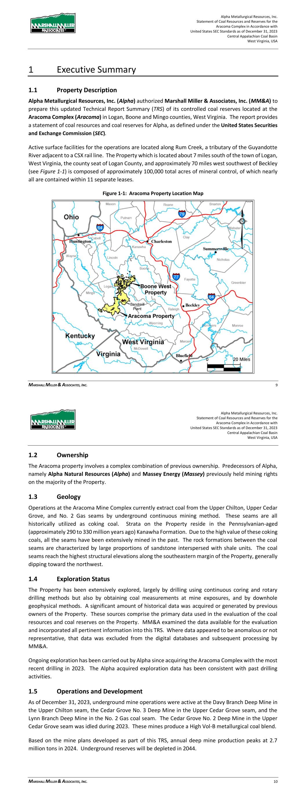 Alpha Metallurgical Resources, Inc. Statement of Coal Resources and Reserves for the Aracoma Complex in Accordance with United States SEC Standards as of December 31, 2023 Central Appalachian Coal Basin West Virginia, USA MARSHALL MILLER & ASSOCIATES, INC. 9 1 Executive Summary 1.1 Property Description Alpha Metallurgical Resources, Inc. (Alpha) authorized Marshall Miller & Associates, Inc. (MM&A) to prepare this updated Technical Report Summary (TRS) of its controlled coal reserves located at the Aracoma Complex (Aracoma) in Logan, Boone and Mingo counties, West Virginia. The report provides a statement of coal resources and coal reserves for Alpha, as defined under the United States Securities and Exchange Commission (SEC). Active surface facilities for the operations are located along Rum Creek, a tributary of the Guyandotte River adjacent to a CSX rail line. The Property which is located about 7 miles south of the town of Logan, West Virginia, the county seat of Logan County, and approximately 70 miles west southwest of Beckley (see Figure 1-1) is composed of approximately 100,000 total acres of mineral control, of which nearly all are contained within 11 separate leases. Figure 1-1: Aracoma Property Location Map Alpha Metallurgical Resources, Inc. Statement of Coal Resources and Reserves for the Aracoma Complex in Accordance with United States SEC Standards as of December 31, 2023 Central Appalachian Coal Basin West Virginia, USA MARSHALL MILLER & ASSOCIATES, INC. 10 1.2 Ownership The Aracoma property involves a complex combination of previous ownership. Predecessors of Alpha, namely Alpha Natural Resources (Alpha) and Massey Energy (Massey) previously held mining rights on the majority of the Property. 1.3 Geology Operations at the Aracoma Mine Complex currently extract coal from the Upper Chilton, Upper Cedar Grove, and No. 2 Gas seams by underground continuous mining method. These seams are all historically utilized as coking coal. Strata on the Property reside in the Pennsylvanian-aged (approximately 290 to 330 million years ago) Kanawha Formation. Due to the high value of these coking coals, all the seams have been extensively mined in the past. The rock formations between the coal seams are characterized by large proportions of sandstone interspersed with shale units. The coal seams reach the highest structural elevations along the southeastern margin of the Property, generally dipping toward the northwest. 1.4 Exploration Status The Property has been extensively explored, largely by drilling using continuous coring and rotary drilling methods but also by obtaining coal measurements at mine exposures, and by downhole geophysical methods. A significant amount of historical data was acquired or generated by previous owners of the Property. These sources comprise the primary data used in the evaluation of the coal resources and coal reserves on the Property. MM&A examined the data available for the evaluation and incorporated all pertinent information into this TRS. Where data appeared to be anomalous or not representative, that data was excluded from the digital databases and subsequent processing by MM&A. Ongoing exploration has been carried out by Alpha since acquiring the Aracoma Complex with the most recent drilling in 2023. The Alpha acquired exploration data has been consistent with past drilling activities. 1.5 Operations and Development As of December 31, 2023, underground mine operations were active at the Davy Branch Deep Mine in the Upper Chilton seam, the Cedar Grove No. 3 Deep Mine in the Upper Cedar Grove seam, and the Lynn Branch Deep Mine in the No. 2 Gas coal seam. The Cedar Grove No. 2 Deep Mine in the Upper Cedar Grove seam was idled during 2023. These mines produce a High Vol-B metallurgical coal blend. Based on the mine plans developed as part of this TRS, annual deep mine production peaks at 2.7 million tons in 2024. Underground reserves will be depleted in 2044.