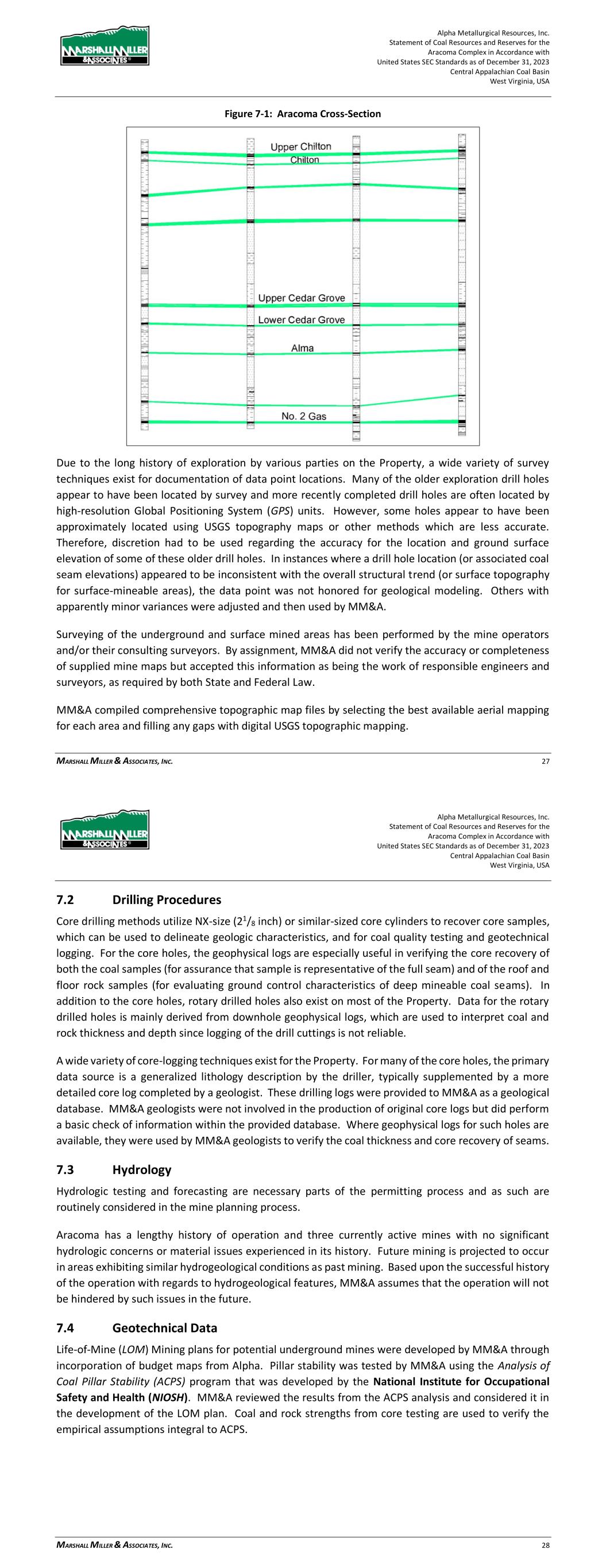 Alpha Metallurgical Resources, Inc. Statement of Coal Resources and Reserves for the Aracoma Complex in Accordance with United States SEC Standards as of December 31, 2023 Central Appalachian Coal Basin West Virginia, USA MARSHALL MILLER & ASSOCIATES, INC. 27 Figure 7-1: Aracoma Cross-Section Due to the long history of exploration by various parties on the Property, a wide variety of survey techniques exist for documentation of data point locations. Many of the older exploration drill holes appear to have been located by survey and more recently completed drill holes are often located by high-resolution Global Positioning System (GPS) units. However, some holes appear to have been approximately located using USGS topography maps or other methods which are less accurate. Therefore, discretion had to be used regarding the accuracy for the location and ground surface elevation of some of these older drill holes. In instances where a drill hole location (or associated coal seam elevations) appeared to be inconsistent with the overall structural trend (or surface topography for surface-mineable areas), the data point was not honored for geological modeling. Others with apparently minor variances were adjusted and then used by MM&A. Surveying of the underground and surface mined areas has been performed by the mine operators and/or their consulting surveyors. By assignment, MM&A did not verify the accuracy or completeness of supplied mine maps but accepted this information as being the work of responsible engineers and surveyors, as required by both State and Federal Law. MM&A compiled comprehensive topographic map files by selecting the best available aerial mapping for each area and filling any gaps with digital USGS topographic mapping. Alpha Metallurgical Resources, Inc. Statement of Coal Resources and Reserves for the Aracoma Complex in Accordance with United States SEC Standards as of December 31, 2023 Central Appalachian Coal Basin West Virginia, USA MARSHALL MILLER & ASSOCIATES, INC. 28 7.2 Drilling Procedures Core drilling methods utilize NX-size (21/8 inch) or similar-sized core cylinders to recover core samples, which can be used to delineate geologic characteristics, and for coal quality testing and geotechnical logging. For the core holes, the geophysical logs are especially useful in verifying the core recovery of both the coal samples (for assurance that sample is representative of the full seam) and of the roof and floor rock samples (for evaluating ground control characteristics of deep mineable coal seams). In addition to the core holes, rotary drilled holes also exist on most of the Property. Data for the rotary drilled holes is mainly derived from downhole geophysical logs, which are used to interpret coal and rock thickness and depth since logging of the drill cuttings is not reliable. A wide variety of core-logging techniques exist for the Property. For many of the core holes, the primary data source is a generalized lithology description by the driller, typically supplemented by a more detailed core log completed by a geologist. These drilling logs were provided to MM&A as a geological database. MM&A geologists were not involved in the production of original core logs but did perform a basic check of information within the provided database. Where geophysical logs for such holes are available, they were used by MM&A geologists to verify the coal thickness and core recovery of seams. 7.3 Hydrology Hydrologic testing and forecasting are necessary parts of the permitting process and as such are routinely considered in the mine planning process. Aracoma has a lengthy history of operation and three currently active mines with no significant hydrologic concerns or material issues experienced in its history. Future mining is projected to occur in areas exhibiting similar hydrogeological conditions as past mining. Based upon the successful history of the operation with regards to hydrogeological features, MM&A assumes that the operation will not be hindered by such issues in the future. 7.4 Geotechnical Data Life-of-Mine (LOM) Mining plans for potential underground mines were developed by MM&A through incorporation of budget maps from Alpha. Pillar stability was tested by MM&A using the Analysis of Coal Pillar Stability (ACPS) program that was developed by the National Institute for Occupational Safety and Health (NIOSH). MM&A reviewed the results from the ACPS analysis and considered it in the development of the LOM plan. Coal and rock strengths from core testing are used to verify the empirical assumptions integral to ACPS.