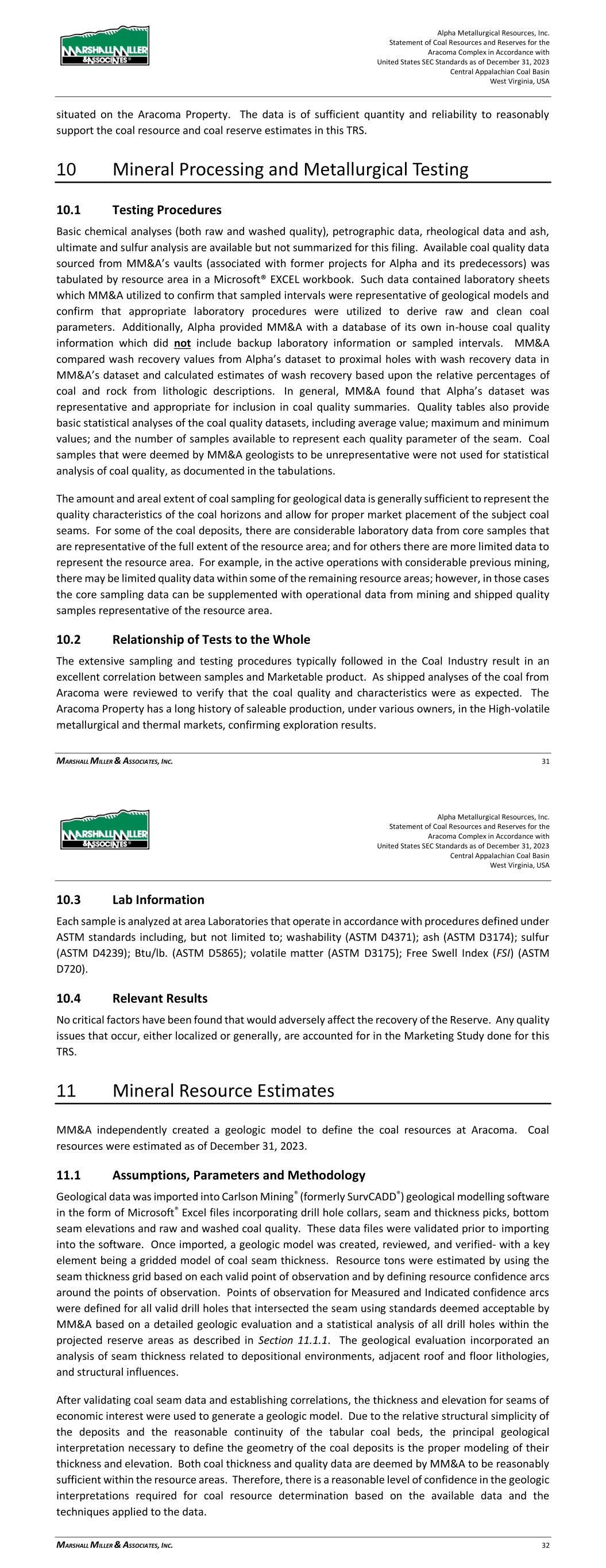 Alpha Metallurgical Resources, Inc. Statement of Coal Resources and Reserves for the Aracoma Complex in Accordance with United States SEC Standards as of December 31, 2023 Central Appalachian Coal Basin West Virginia, USA MARSHALL MILLER & ASSOCIATES, INC. 31 situated on the Aracoma Property. The data is of sufficient quantity and reliability to reasonably support the coal resource and coal reserve estimates in this TRS. 10 Mineral Processing and Metallurgical Testing 10.1 Testing Procedures Basic chemical analyses (both raw and washed quality), petrographic data, rheological data and ash, ultimate and sulfur analysis are available but not summarized for this filing. Available coal quality data sourced from MM&A’s vaults (associated with former projects for Alpha and its predecessors) was tabulated by resource area in a Microsoft® EXCEL workbook. Such data contained laboratory sheets which MM&A utilized to confirm that sampled intervals were representative of geological models and confirm that appropriate laboratory procedures were utilized to derive raw and clean coal parameters. Additionally, Alpha provided MM&A with a database of its own in-house coal quality information which did not include backup laboratory information or sampled intervals. MM&A compared wash recovery values from Alpha’s dataset to proximal holes with wash recovery data in MM&A’s dataset and calculated estimates of wash recovery based upon the relative percentages of coal and rock from lithologic descriptions. In general, MM&A found that Alpha’s dataset was representative and appropriate for inclusion in coal quality summaries. Quality tables also provide basic statistical analyses of the coal quality datasets, including average value; maximum and minimum values; and the number of samples available to represent each quality parameter of the seam. Coal samples that were deemed by MM&A geologists to be unrepresentative were not used for statistical analysis of coal quality, as documented in the tabulations. The amount and areal extent of coal sampling for geological data is generally sufficient to represent the quality characteristics of the coal horizons and allow for proper market placement of the subject coal seams. For some of the coal deposits, there are considerable laboratory data from core samples that are representative of the full extent of the resource area; and for others there are more limited data to represent the resource area. For example, in the active operations with considerable previous mining, there may be limited quality data within some of the remaining resource areas; however, in those cases the core sampling data can be supplemented with operational data from mining and shipped quality samples representative of the resource area. 10.2 Relationship of Tests to the Whole The extensive sampling and testing procedures typically followed in the Coal Industry result in an excellent correlation between samples and Marketable product. As shipped analyses of the coal from Aracoma were reviewed to verify that the coal quality and characteristics were as expected. The Aracoma Property has a long history of saleable production, under various owners, in the High-volatile metallurgical and thermal markets, confirming exploration results. Alpha Metallurgical Resources, Inc. Statement of Coal Resources and Reserves for the Aracoma Complex in Accordance with United States SEC Standards as of December 31, 2023 Central Appalachian Coal Basin West Virginia, USA MARSHALL MILLER & ASSOCIATES, INC. 32 10.3 Lab Information Each sample is analyzed at area Laboratories that operate in accordance with procedures defined under ASTM standards including, but not limited to; washability (ASTM D4371); ash (ASTM D3174); sulfur (ASTM D4239); Btu/lb. (ASTM D5865); volatile matter (ASTM D3175); Free Swell Index (FSI) (ASTM D720). 10.4 Relevant Results No critical factors have been found that would adversely affect the recovery of the Reserve. Any quality issues that occur, either localized or generally, are accounted for in the Marketing Study done for this TRS. 11 Mineral Resource Estimates MM&A independently created a geologic model to define the coal resources at Aracoma. Coal resources were estimated as of December 31, 2023. 11.1 Assumptions, Parameters and Methodology Geological data was imported into Carlson Mining® (formerly SurvCADD®) geological modelling software in the form of Microsoft® Excel files incorporating drill hole collars, seam and thickness picks, bottom seam elevations and raw and washed coal quality. These data files were validated prior to importing into the software. Once imported, a geologic model was created, reviewed, and verified- with a key element being a gridded model of coal seam thickness. Resource tons were estimated by using the seam thickness grid based on each valid point of observation and by defining resource confidence arcs around the points of observation. Points of observation for Measured and Indicated confidence arcs were defined for all valid drill holes that intersected the seam using standards deemed acceptable by MM&A based on a detailed geologic evaluation and a statistical analysis of all drill holes within the projected reserve areas as described in Section 11.1.1. The geological evaluation incorporated an analysis of seam thickness related to depositional environments, adjacent roof and floor lithologies, and structural influences. After validating coal seam data and establishing correlations, the thickness and elevation for seams of economic interest were used to generate a geologic model. Due to the relative structural simplicity of the deposits and the reasonable continuity of the tabular coal beds, the principal geological interpretation necessary to define the geometry of the coal deposits is the proper modeling of their thickness and elevation. Both coal thickness and quality data are deemed by MM&A to be reasonably sufficient within the resource areas. Ther