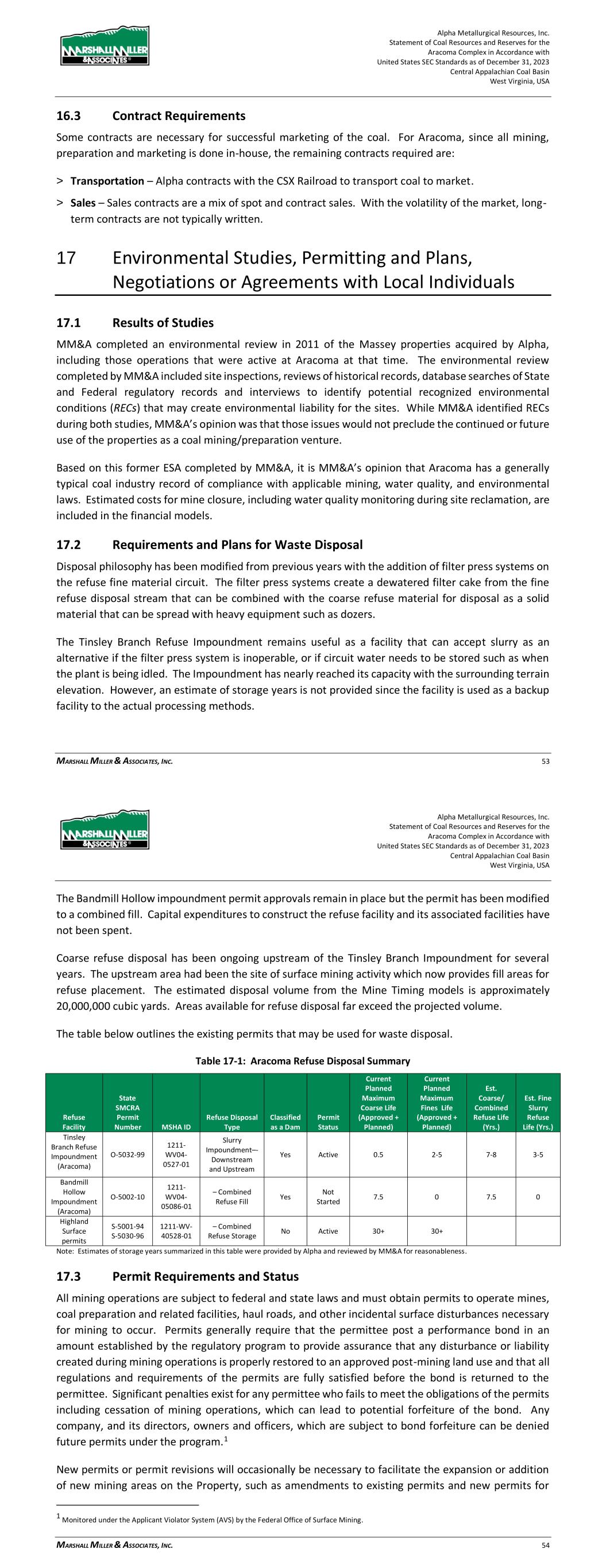 Alpha Metallurgical Resources, Inc. Statement of Coal Resources and Reserves for the Aracoma Complex in Accordance with United States SEC Standards as of December 31, 2023 Central Appalachian Coal Basin West Virginia, USA MARSHALL MILLER & ASSOCIATES, INC. 53 16.3 Contract Requirements Some contracts are necessary for successful marketing of the coal. For Aracoma, since all mining, preparation and marketing is done in-house, the remaining contracts required are: > Transportation – Alpha contracts with the CSX Railroad to transport coal to market. > Sales – Sales contracts are a mix of spot and contract sales. With the volatility of the market, long- term contracts are not typically written. 17 Environmental Studies, Permitting and Plans, Negotiations or Agreements with Local Individuals 17.1 Results of Studies MM&A completed an environmental review in 2011 of the Massey properties acquired by Alpha, including those operations that were active at Aracoma at that time. The environmental review completed by MM&A included site inspections, reviews of historical records, database searches of State and Federal regulatory records and interviews to identify potential recognized environmental conditions (RECs) that may create environmental liability for the sites. While MM&A identified RECs during both studies, MM&A’s opinion was that those issues would not preclude the continued or future use of the properties as a coal mining/preparation venture. Based on this former ESA completed by MM&A, it is MM&A’s opinion that Aracoma has a generally typical coal industry record of compliance with applicable mining, water quality, and environmental laws. Estimated costs for mine closure, including water quality monitoring during site reclamation, are included in the financial models. 17.2 Requirements and Plans for Waste Disposal Disposal philosophy has been modified from previous years with the addition of filter press systems on the refuse fine material circuit. The filter press systems create a dewatered filter cake from the fine refuse disposal stream that can be combined with the coarse refuse material for disposal as a solid material that can be spread with heavy equipment such as dozers. The Tinsley Branch Refuse Impoundment remains useful as a facility that can accept slurry as an alternative if the filter press system is inoperable, or if circuit water needs to be stored such as when the plant is being idled. The Impoundment has nearly reached its capacity with the surrounding terrain elevation. However, an estimate of storage years is not provided since the facility is used as a backup facility to the actual processing methods. Alpha Metallurgical Resources, Inc. Statement of Coal Resources and Reserves for the Aracoma Complex in Accordance with United States SEC Standards as of December 31, 2023 Central Appalachian Coal Basin West Virginia, USA MARSHALL MILLER & ASSOCIATES, INC. 54 The Bandmill Hollow impoundment permit approvals remain in place but the permit has been modified to a combined fill. Capital expenditures to construct the refuse facility and its associated facilities have not been spent. Coarse refuse disposal has been ongoing upstream of the Tinsley Branch Impoundment for several years. The upstream area had been the site of surface mining activity which now provides fill areas for refuse placement. The estimated disposal volume from the Mine Timing models is approximately 20,000,000 cubic yards. Areas available for refuse disposal far exceed the projected volume. The table below outlines the existing permits that may be used for waste disposal. Table 17-1: Aracoma Refuse Disposal Summary Refuse Facility State SMCRA Permit Number MSHA ID Refuse Disposal Type Classified as a Dam Permit Status Current Planned Maximum Coarse Life (Approved + Planned) Current Planned Maximum Fines Life (Approved + Planned) Est. Coarse/ Combined Refuse Life (Yrs.) Est. Fine Slurry Refuse Life (Yrs.) Tinsley Branch Refuse Impoundment (Aracoma) O-5032-99 1211- WV04- 0527-01 Slurry Impoundment–- Downstream and Upstream Yes Active 0.5 2-5 7-8 3-5 Bandmill Hollow Impoundment (Aracoma) O-5002-10 1211- WV04- 05086-01 – Combined Refuse Fill Yes Not Started 7.5 0 7.5 0 Highland Surface permits S-5001-94 S-5030-96 1211-WV- 40528-01 – Combined Refuse Storage No Active 30+ 30+ Note: Estimates of storage years summarized in this table were provided by Alpha and reviewed by MM&A for reasonableness. 17.3 Permit Requirements and Status All mining operations are subject to federal and state laws and must obtain permits to operate mines, coal preparation and related facilities, haul roads, and other incidental surface disturbances necessary for mining to occur. Permits generally require that the permittee post a performance bond in an amount established by the regulatory program to provide assurance that any disturbance or liability created during mining operations is properly restored to an approved post-mining land use and that all regulations and requirements of the permits are fully satisfied before the bond is returned to the permittee. Significant penalties exist for any permittee who fails to meet the obligations of the permits including cessation of mining operations, which can lead to potential forfeiture of the bond. Any company, and its directors, owners and officers, which are subject to bond forfeiture can be denied future permits under the program.1 New permits or permit revisions will occasionally be necessary to facilitate the expansion or addition of new mining areas on the Property, such as amendments to existing permits and new permits for 1 Monitored under the Applicant Violator System (AVS) by the Federal Office of Surface Mining.