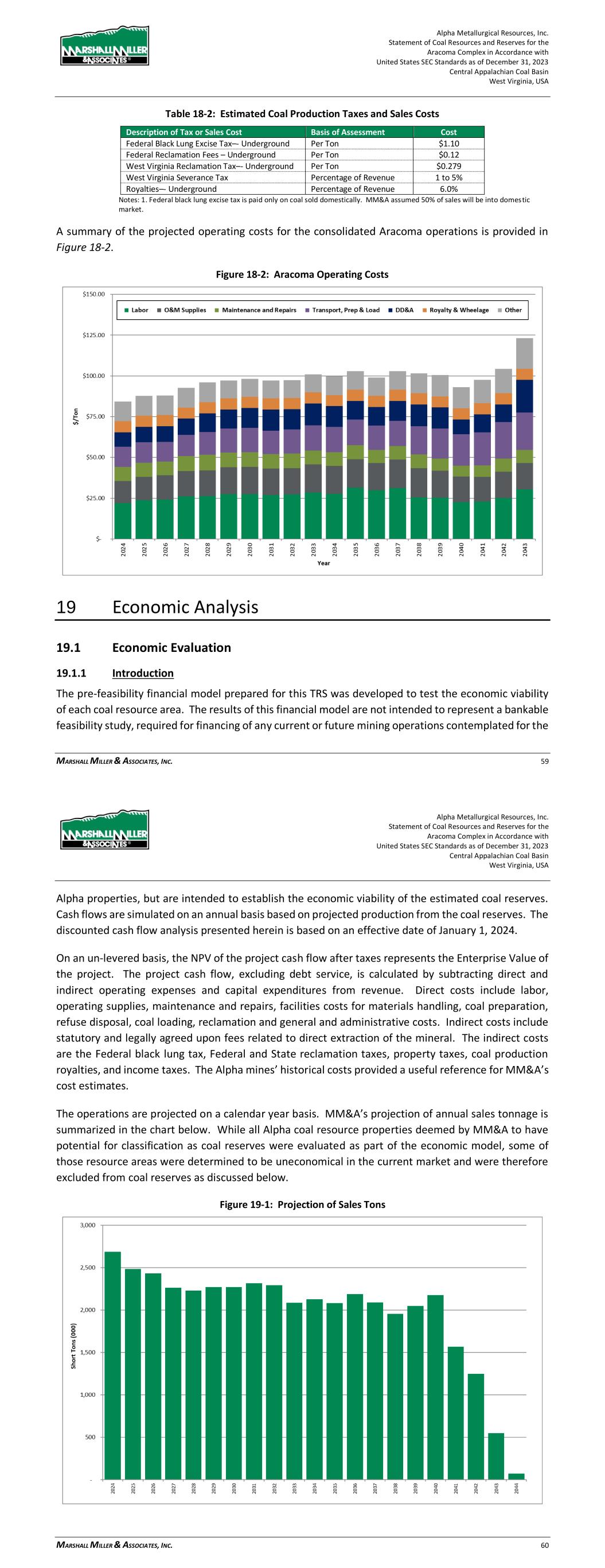 Alpha Metallurgical Resources, Inc. Statement of Coal Resources and Reserves for the Aracoma Complex in Accordance with United States SEC Standards as of December 31, 2023 Central Appalachian Coal Basin West Virginia, USA MARSHALL MILLER & ASSOCIATES, INC. 59 Table 18-2: Estimated Coal Production Taxes and Sales Costs Description of Tax or Sales Cost Basis of Assessment Cost Federal Black Lung Excise Tax–- Underground Per Ton $1.10 Federal Reclamation Fees – Underground Per Ton $0.12 West Virginia Reclamation Tax–- Underground Per Ton $0.279 West Virginia Severance Tax Percentage of Revenue 1 to 5% Royalties–- Underground Percentage of Revenue 6.0% Notes: 1. Federal black lung excise tax is paid only on coal sold domestically. MM&A assumed 50% of sales will be into domestic market. A summary of the projected operating costs for the consolidated Aracoma operations is provided in Figure 18-2. Figure 18-2: Aracoma Operating Costs 19 Economic Analysis 19.1 Economic Evaluation 19.1.1 Introduction The pre-feasibility financial model prepared for this TRS was developed to test the economic viability of each coal resource area. The results of this financial model are not intended to represent a bankable feasibility study, required for financing of any current or future mining operations contemplated for the Alpha Metallurgical Resources, Inc. Statement of Coal Resources and Reserves for the Aracoma Complex in Accordance with United States SEC Standards as of December 31, 2023 Central Appalachian Coal Basin West Virginia, USA MARSHALL MILLER & ASSOCIATES, INC. 60 Alpha properties, but are intended to establish the economic viability of the estimated coal reserves. Cash flows are simulated on an annual basis based on projected production from the coal reserves. The discounted cash flow analysis presented herein is based on an effective date of January 1, 2024. On an un-levered basis, the NPV of the project cash flow after taxes represents the Enterprise Value of the project. The project cash flow, excluding debt service, is calculated by subtracting direct and indirect operating expenses and capital expenditures from revenue. Direct costs include labor, operating supplies, maintenance and repairs, facilities costs for materials handling, coal preparation, refuse disposal, coal loading, reclamation and general and administrative costs. Indirect costs include statutory and legally agreed upon fees related to direct extraction of the mineral. The indirect costs are the Federal black lung tax, Federal and State reclamation taxes, property taxes, coal production royalties, and income taxes. The Alpha mines’ historical costs provided a useful reference for MM&A’s cost estimates. The operations are projected on a calendar year basis. MM&A’s projection of annual sales tonnage is summarized in the chart below. While all Alpha coal resource properties deemed by MM&A to have potential for classification as coal reserves were evaluated as part of the economic model, some of those resource areas were determined to be uneconomical in the current market and were therefore excluded from coal reserves as discussed below. Figure 19-1: Projection of Sales Tons