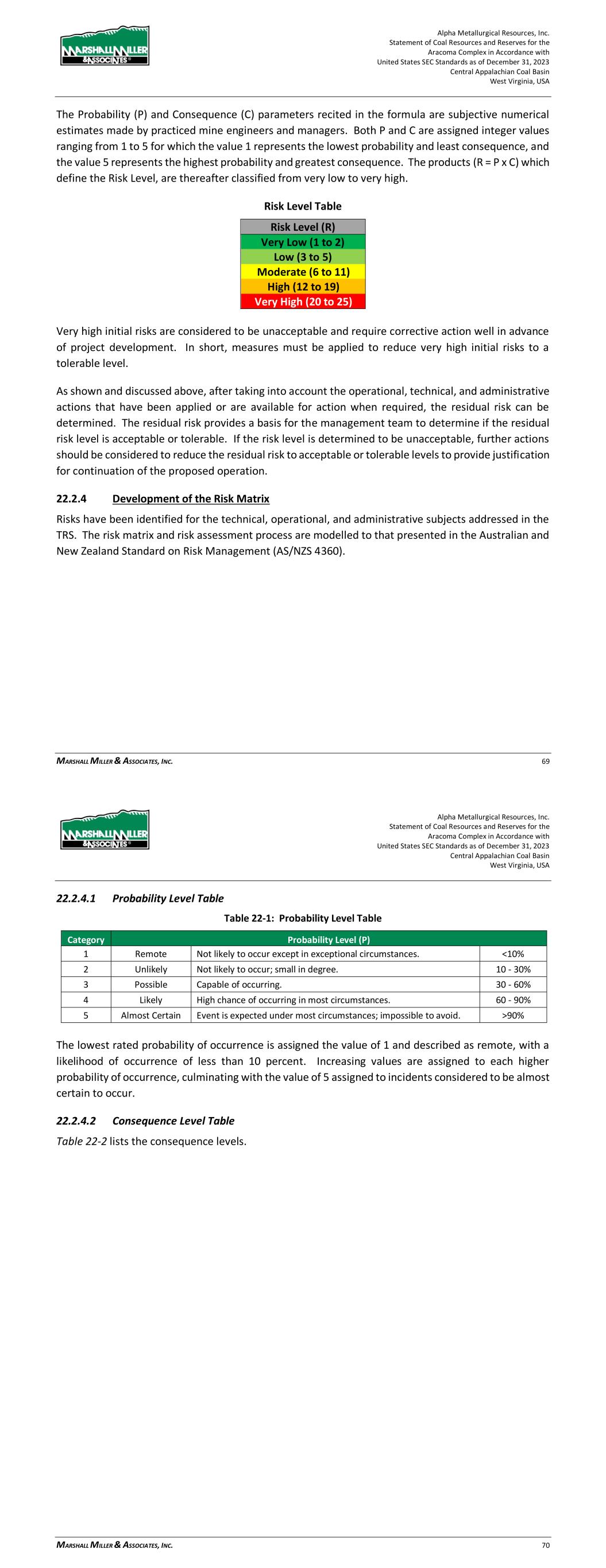 Alpha Metallurgical Resources, Inc. Statement of Coal Resources and Reserves for the Aracoma Complex in Accordance with United States SEC Standards as of December 31, 2023 Central Appalachian Coal Basin West Virginia, USA MARSHALL MILLER & ASSOCIATES, INC. 69 The Probability (P) and Consequence (C) parameters recited in the formula are subjective numerical estimates made by practiced mine engineers and managers. Both P and C are assigned integer values ranging from 1 to 5 for which the value 1 represents the lowest probability and least consequence, and the value 5 represents the highest probability and greatest consequence. The products (R = P x C) which define the Risk Level, are thereafter classified from very low to very high. Risk Level Table Risk Level (R) Very Low (1 to 2) Low (3 to 5) Moderate (6 to 11) High (12 to 19) Very High (20 to 25) Very high initial risks are considered to be unacceptable and require corrective action well in advance of project development. In short, measures must be applied to reduce very high initial risks to a tolerable level. As shown and discussed above, after taking into account the operational, technical, and administrative actions that have been applied or are available for action when required, the residual risk can be determined. The residual risk provides a basis for the management team to determine if the residual risk level is acceptable or tolerable. If the risk level is determined to be unacceptable, further actions should be considered to reduce the residual risk to acceptable or tolerable levels to provide justification for continuation of the proposed operation. 22.2.4 Development of the Risk Matrix Risks have been identified for the technical, operational, and administrative subjects addressed in the TRS. The risk matrix and risk assessment process are modelled to that presented in the Australian and New Zealand Standard on Risk Management (AS/NZS 4360). Alpha Metallurgical Resources, Inc. Statement of Coal Resources and Reserves for the Aracoma Complex in Accordance with United States SEC Standards as of December 31, 2023 Central Appalachian Coal Basin West Virginia, USA MARSHALL MILLER & ASSOCIATES, INC. 70 22.2.4.1 Probability Level Table Table 22-1: Probability Level Table Category Probability Level (P) 1 Remote Not likely to occur except in exceptional circumstances. <10% 2 Unlikely Not likely to occur; small in degree. 10 - 30% 3 Possible Capable of occurring. 30 - 60% 4 Likely High chance of occurring in most circumstances. 60 - 90% 5 Almost Certain Event is expected under most circumstances; impossible to avoid. >90% The lowest rated probability of occurrence is assigned the value of 1 and described as remote, with a likelihood of occurrence of less than 10 percent. Increasing values are assigned to each higher probability of occurrence, culminating with the value of 5 assigned to incidents considered to be almost certain to occur. 22.2.4.2 Consequence Level Table Table 22-2 lists the consequence levels.