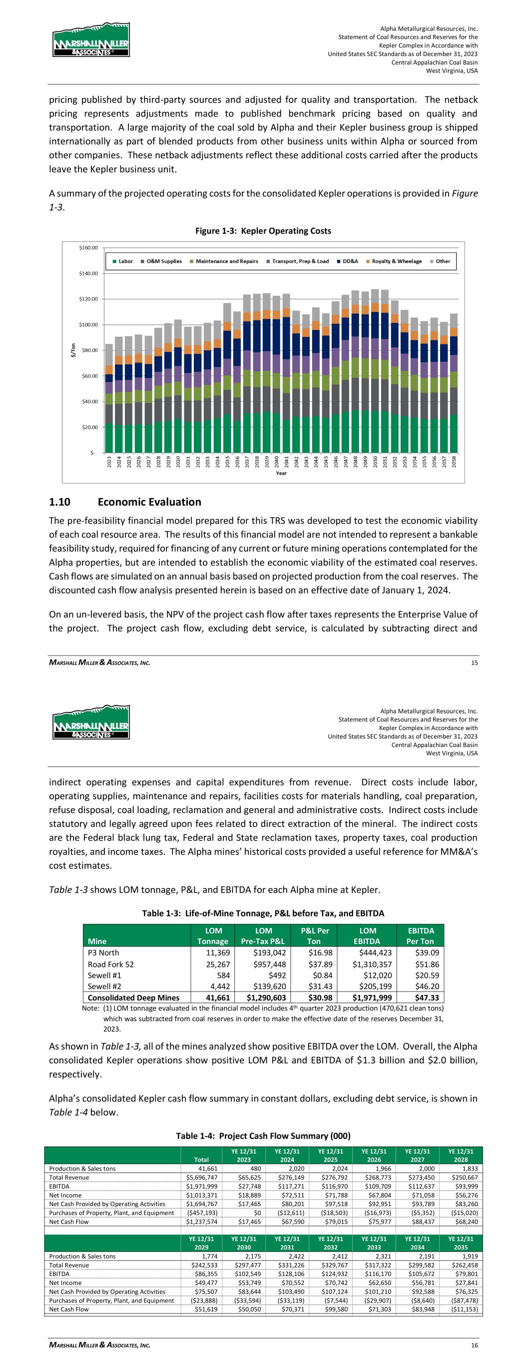 Alpha Metallurgical Resources, Inc. Statement of Coal Resources and Reserves for the Kepler Complex in Accordance with United States SEC Standards as of December 31, 2023 Central Appalachian Coal Basin West Virginia, USA MARSHALL MILLER & ASSOCIATES, INC. 15 pricing published by third-party sources and adjusted for quality and transportation. The netback pricing represents adjustments made to published benchmark pricing based on quality and transportation. A large majority of the coal sold by Alpha and their Kepler business group is shipped internationally as part of blended products from other business units within Alpha or sourced from other companies. These netback adjustments reflect these additional costs carried after the products leave the Kepler business unit. A summary of the projected operating costs for the consolidated Kepler operations is provided in Figure 1-3. Figure 1-3: Kepler Operating Costs 1.10 Economic Evaluation The pre-feasibility financial model prepared for this TRS was developed to test the economic viability of each coal resource area. The results of this financial model are not intended to represent a bankable feasibility study, required for financing of any current or future mining operations contemplated for the Alpha properties, but are intended to establish the economic viability of the estimated coal reserves. Cash flows are simulated on an annual basis based on projected production from the coal reserves. The discounted cash flow analysis presented herein is based on an effective date of January 1, 2024. On an un-levered basis, the NPV of the project cash flow after taxes represents the Enterprise Value of the project. The project cash flow, excluding debt service, is calculated by subtracting direct and Alpha Metallurgical Resources, Inc. Statement of Coal Resources and Reserves for the Kepler Complex in Accordance with United States SEC Standards as of December 31, 2023 Central Appalachian Coal Basin West Virginia, USA MARSHALL MILLER & ASSOCIATES, INC. 16 indirect operating expenses and capital expenditures from revenue. Direct costs include labor, operating supplies, maintenance and repairs, facilities costs for materials handling, coal preparation, refuse disposal, coal loading, reclamation and general and administrative costs. Indirect costs include statutory and legally agreed upon fees related to direct extraction of the mineral. The indirect costs are the Federal black lung tax, Federal and State reclamation taxes, property taxes, coal production royalties, and income taxes. The Alpha mines’ historical costs provided a useful reference for MM&A’s cost estimates. Table 1-3 shows LOM tonnage, P&L, and EBITDA for each Alpha mine at Kepler. Table 1-3: Life-of-Mine Tonnage, P&L before Tax, and EBITDA Mine LOM Tonnage LOM Pre-Tax P&L P&L Per Ton LOM EBITDA EBITDA Per Ton P3 North 11,369 $193,042 $16.98 $444,423 $39.09 Road Fork 52 25,267 $957,448 $37.89 $1,310,357 $51.86 Sewell #1 584 $492 $0.84 $12,020 $20.59 Sewell #2 4,442 $139,620 $31.43 $205,199 $46.20 Consolidated Deep Mines 41,661 $1,290,603 $30.98 $1,971,999 $47.33 Note: (1) LOM tonnage evaluated in the financial model includes 4th quarter 2023 production (470,621 clean tons) which was subtracted from coal reserves in order to make the effective date of the reserves December 31, 2023. As shown in Table 1-3, all of the mines analyzed show positive EBITDA over the LOM. Overall, the Alpha consolidated Kepler operations show positive LOM P&L and EBITDA of $1.3 billion and $2.0 billion, respectively. Alpha’s consolidated Kepler cash flow summary in constant dollars, excluding debt service, is shown in Table 1-4 below. Table 1-4: Project Cash Flow Summary (000) YE 12/31 YE 12/31 YE 12/31 YE 12/31 YE 12/31 YE 12/31 Total 2023 2024 2025 2026 2027 2028 Production & Sales tons 41,661 480 2,020 2,024 1,966 2,000 1,833 Total Revenue $5,696,747 $65,625 $276,149 $276,792 $268,773 $273,450 $250,667 EBITDA $1,971,999 $27,748 $117,271 $116,970 $109,709 $112,637 $93,999 Net Income $1,013,371 $18,889 $72,511 $71,788 $67,804 $71,058 $56,276 Net Cash Provided by Operating Activities $1,694,767 $17,465 $80,201 $97,518 $92,951 $93,789 $83,260 Purchases of Property, Plant, and Equipment ($457,193) $0 ($12,611) ($18,503) ($16,973) ($5,352) ($15,020) Net Cash Flow $1,237,574 $17,465 $67,590 $79,015 $75,977 $88,437 $68,240 YE 12/31 YE 12/31 YE 12/31 YE 12/31 YE 12/31 YE 12/31 YE 12/31 2029 2030 2031 2032 2033 2034 2035 Production & Sales tons 1,774 2,175 2,422 2,412 2,321 2,191 1,919 Total Revenue $242,533 $297,477 $331,226 $329,767 $317,322 $299,582 $262,458 EBITDA $86,355 $102,549 $128,106 $124,932 $116,170 $105,672 $79,801 Net Income $49,477 $53,749 $70,552 $70,742 $62,650 $56,781 $27,841 Net Cash Provided by Operating Activities $75,507 $83,644 $103,490 $107,124 $101,210 $92,588 $76,325 Purchases of Property, Plant, and Equipment ($23,888) ($33,594) ($33,119) ($7,544) ($29,907) ($8,640) ($87,478) Net Cash Flow $51,619 $50,050 $70,371 $99,580 $71,303 $83,948 ($11,153)