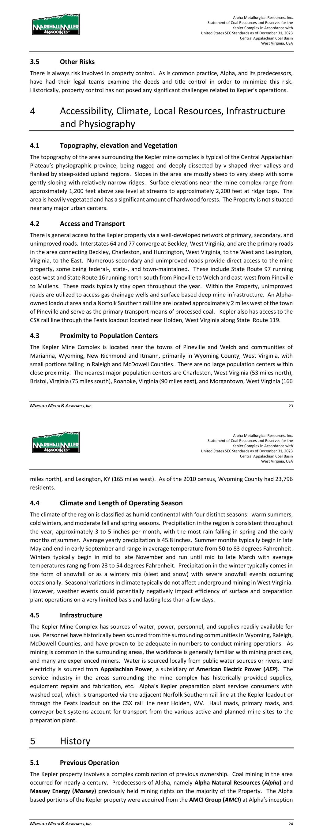 Alpha Metallurgical Resources, Inc. Statement of Coal Resources and Reserves for the Kepler Complex in Accordance with United States SEC Standards as of December 31, 2023 Central Appalachian Coal Basin West Virginia, USA MARSHALL MILLER & ASSOCIATES, INC. 23 3.5 Other Risks There is always risk involved in property control. As is common practice, Alpha, and its predecessors, have had their legal teams examine the deeds and title control in order to minimize this risk. Historically, property control has not posed any significant challenges related to Kepler’s operations. 4 Accessibility, Climate, Local Resources, Infrastructure and Physiography 4.1 Topography, elevation and Vegetation The topography of the area surrounding the Kepler mine complex is typical of the Central Appalachian Plateau’s physiographic province, being rugged and deeply dissected by v-shaped river valleys and flanked by steep-sided upland regions. Slopes in the area are mostly steep to very steep with some gently sloping with relatively narrow ridges. Surface elevations near the mine complex range from approximately 1,200 feet above sea level at streams to approximately 2,200 feet at ridge tops. The area is heavily vegetated and has a significant amount of hardwood forests. The Property is not situated near any major urban centers. 4.2 Access and Transport There is general access to the Kepler property via a well-developed network of primary, secondary, and unimproved roads. Interstates 64 and 77 converge at Beckley, West Virginia, and are the primary roads in the area connecting Beckley, Charleston, and Huntington, West Virginia, to the West and Lexington, Virginia, to the East. Numerous secondary and unimproved roads provide direct access to the mine property, some being federal-, state-, and town-maintained. These include State Route 97 running east-west and State Route 16 running north-south from Pineville to Welch and east-west from Pineville to Mullens. These roads typically stay open throughout the year. Within the Property, unimproved roads are utilized to access gas drainage wells and surface based deep mine infrastructure. An Alpha- owned loadout area and a Norfolk Southern rail line are located approximately 2 miles west of the town of Pineville and serve as the primary transport means of processed coal. Kepler also has access to the CSX rail line through the Feats loadout located near Holden, West Virginia along State Route 119. 4.3 Proximity to Population Centers The Kepler Mine Complex is located near the towns of Pineville and Welch and communities of Marianna, Wyoming, New Richmond and Itmann, primarily in Wyoming County, West Virginia, with small portions falling in Raleigh and McDowell Counties. There are no large population centers within close proximity. The nearest major population centers are Charleston, West Virginia (53 miles north), Bristol, Virginia (75 miles south), Roanoke, Virginia (90 miles east), and Morgantown, West Virginia (166 Alpha Metallurgical Resources, Inc. Statement of Coal Resources and Reserves for the Kepler Complex in Accordance with United States SEC Standards as of December 31, 2023 Central Appalachian Coal Basin West Virginia, USA MARSHALL MILLER & ASSOCIATES, INC. 24 miles north), and Lexington, KY (165 miles west). As of the 2010 census, Wyoming County had 23,796 residents. 4.4 Climate and Length of Operating Season The climate of the region is classified as humid continental with four distinct seasons: warm summers, cold winters, and moderate fall and spring seasons. Precipitation in the region is consistent throughout the year, approximately 3 to 5 inches per month, with the most rain falling in spring and the early months of summer. Average yearly precipitation is 45.8 inches. Summer months typically begin in late May and end in early September and range in average temperature from 50 to 83 degrees Fahrenheit. Winters typically begin in mid to late November and run until mid to late March with average temperatures ranging from 23 to 54 degrees Fahrenheit. Precipitation in the winter typically comes in the form of snowfall or as a wintery mix (sleet and snow) with severe snowfall events occurring occasionally. Seasonal variations in climate typically do not affect underground mining in West Virginia. However, weather events could potentially negatively impact efficiency of surface and preparation plant operations on a very limited basis and lasting less than a few days. 4.5 Infrastructure The Kepler Mine Complex has sources of water, power, personnel, and supplies readily available for use. Personnel have historically been sourced from the surrounding communities in Wyoming, Raleigh, McDowell Counties, and have proven to be adequate in numbers to conduct mining operations. As mining is common in the surrounding areas, the workforce is generally familiar with mining practices, and many are experienced miners. Water is sourced locally from public water sources or rivers, and electricity is sourced from Appalachian Power, a subsidiary of American Electric Power (AEP). The service industry in the areas surrounding the mine complex has historically provided supplies, equipment repairs and fabrication, etc. Alpha’s Kepler preparation plant services consumers with washed coal, which is transported via the adjacent Norfolk Southern rail line at the Kepler loadout or through the Feats loadout on the CSX rail line near Holden, WV. Haul roads, primary roads, and conveyor belt systems account for transport from the various active and planned mine sites to the preparation plant. 5 History 5.1 Previous Operation The Kepler property involves a complex combination of previous ownership. Coal mining in the area occurred for nearly a century. Predecessors of Alpha, namely Alpha Natural Resources (Alpha) and Massey Energy (Massey) previously held mining rights on the majority of the Property. The Alpha based portions of the Kepler property were acquired from the AMCI Group (AMCI)