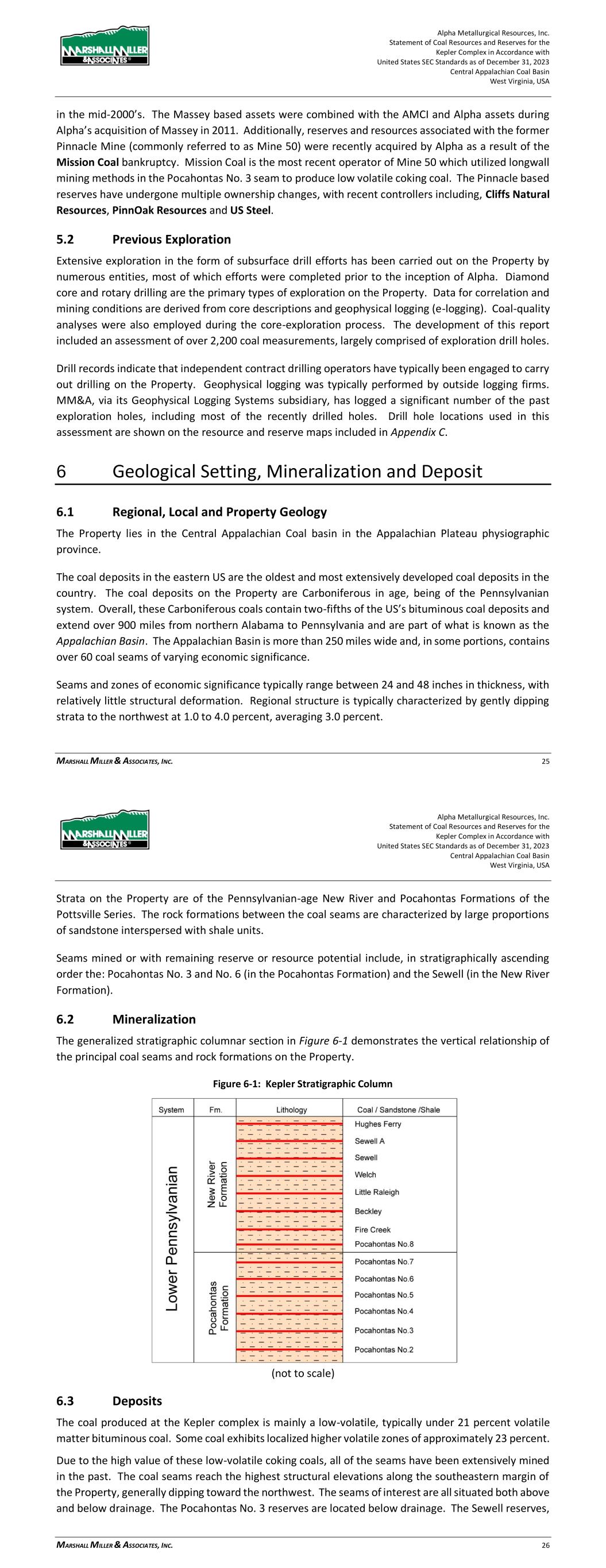 Alpha Metallurgical Resources, Inc. Statement of Coal Resources and Reserves for the Kepler Complex in Accordance with United States SEC Standards as of December 31, 2023 Central Appalachian Coal Basin West Virginia, USA MARSHALL MILLER & ASSOCIATES, INC. 25 in the mid-2000’s. The Massey based assets were combined with the AMCI and Alpha assets during Alpha’s acquisition of Massey in 2011. Additionally, reserves and resources associated with the former Pinnacle Mine (commonly referred to as Mine 50) were recently acquired by Alpha as a result of the Mission Coal bankruptcy. Mission Coal is the most recent operator of Mine 50 which utilized longwall mining methods in the Pocahontas No. 3 seam to produce low volatile coking coal. The Pinnacle based reserves have undergone multiple ownership changes, with recent controllers including, Cliffs Natural Resources, PinnOak Resources and US Steel. 5.2 Previous Exploration Extensive exploration in the form of subsurface drill efforts has been carried out on the Property by numerous entities, most of which efforts were completed prior to the inception of Alpha. Diamond core and rotary drilling are the primary types of exploration on the Property. Data for correlation and mining conditions are derived from core descriptions and geophysical logging (e-logging). Coal-quality analyses were also employed during the core-exploration process. The development of this report included an assessment of over 2,200 coal measurements, largely comprised of exploration drill holes. Drill records indicate that independent contract drilling operators have typically been engaged to carry out drilling on the Property. Geophysical logging was typically performed by outside logging firms. MM&A, via its Geophysical Logging Systems subsidiary, has logged a significant number of the past exploration holes, including most of the recently drilled holes. Drill hole locations used in this assessment are shown on the resource and reserve maps included in Appendix C. 6 Geological Setting, Mineralization and Deposit 6.1 Regional, Local and Property Geology The Property lies in the Central Appalachian Coal basin in the Appalachian Plateau physiographic province. The coal deposits in the eastern US are the oldest and most extensively developed coal deposits in the country. The coal deposits on the Property are Carboniferous in age, being of the Pennsylvanian system. Overall, these Carboniferous coals contain two-fifths of the US’s bituminous coal deposits and extend over 900 miles from northern Alabama to Pennsylvania and are part of what is known as the Appalachian Basin. The Appalachian Basin is more than 250 miles wide and, in some portions, contains over 60 coal seams of varying economic significance. Seams and zones of economic significance typically range between 24 and 48 inches in thickness, with relatively little structural deformation. Regional structure is typically characterized by gently dipping strata to the northwest at 1.0 to 4.0 percent, averaging 3.0 percent. Alpha Metallurgical Resources, Inc. Statement of Coal Resources and Reserves for the Kepler Complex in Accordance with United States SEC Standards as of December 31, 2023 Central Appalachian Coal Basin West Virginia, USA MARSHALL MILLER & ASSOCIATES, INC. 26 Strata on the Property are of the Pennsylvanian-age New River and Pocahontas Formations of the Pottsville Series. The rock formations between the coal seams are characterized by large proportions of sandstone interspersed with shale units. Seams mined or with remaining reserve or resource potential include, in stratigraphically ascending order the: Pocahontas No. 3 and No. 6 (in the Pocahontas Formation) and the Sewell (in the New River Formation). 6.2 Mineralization The generalized stratigraphic columnar section in Figure 6-1 demonstrates the vertical relationship of the principal coal seams and rock formations on the Property. Figure 6-1: Kepler Stratigraphic Column (not to scale) 6.3 Deposits The coal produced at the Kepler complex is mainly a low-volatile, typically under 21 percent volatile matter bituminous coal. Some coal exhibits localized higher volatile zones of approximately 23 percent. Due to the high value of these low-volatile coking coals, all of the seams have been extensively mined in the past. The coal seams reach the highest structural elevations along the southeastern margin of the Property, generally dipping toward the northwest. The seams of interest are all situated both above and below drainage. The Pocahontas No. 3 reserves are located below drainage. The Sewell reserves,