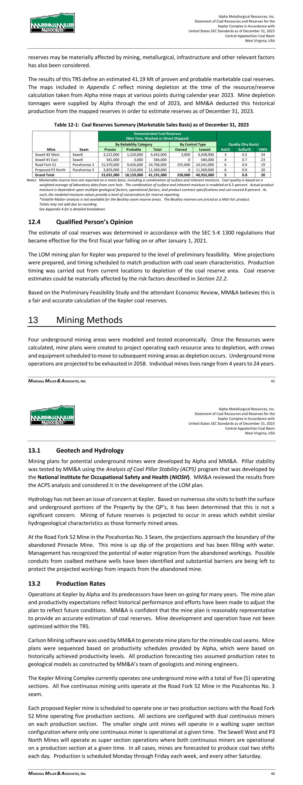 Alpha Metallurgical Resources, Inc. Statement of Coal Resources and Reserves for the Kepler Complex in Accordance with United States SEC Standards as of December 31, 2023 Central Appalachian Coal Basin West Virginia, USA MARSHALL MILLER & ASSOCIATES, INC. 47 As shown in Table 13-1, the four areas planned for underground mines produce coal until 2058. Clean coal production varies directly with coal thickness. Table 13-1: Kepler Complex Underground Mine Production Schedule (x 1,000 Saleable Tons) Mine Name 2023 2024 2025 2026 2027 2028 2029 2030 P3 North 0 0 0 0 0 0 0 0 Road Fork 52 480 2,020 2,024 1,966 2,000 1,833 1,774 1,804 Sewell #1 0 0 0 0 0 0 0 162 Sewell #2 0 0 0 0 0 0 0 209 Total 480 2,020 2,024 1,966 2,000 1,833 1,774 2,175 Mine Name 2031 2032 2033 2034 2035 2036 2037 2038 P3 North 0 0 0 0 39 268 472 472 Road Fork 52 1,977 2,002 1,875 1,707 1,407 1,222 770 406 Sewell #1 185 186 50 0 0 0 0 0 Sewell #2 260 224 395 484 474 481 453 487 Total 2,422 2,412 2,321 2,191 1,919 1,971 1,695 1,365 Mine Name 2039 2040 2041 2042 2043 2044 2045 2046 P3 North 482 507 505 537 540 526 552 503 Road Fork 52 0 0 0 0 0 0 0 0 Sewell #1 0 0 0 0 0 0 0 0 Sewell #2 463 401 111 0 0 0 0 0 Total 945 908 617 537 540 526 552 503 Mine Name 2047 2048 2049 2050 2051 2052 2053 2054 P3 North 470 458 459 462 465 502 528 552 Road Fork 52 0 0 0 0 0 0 0 0 Sewell #1 0 0 0 0 0 0 0 0 Sewell #2 0 0 0 0 0 0 0 0 Total 470 458 459 462 465 502 528 552 Mine Name 2055 2056 2057 2058 2059 2060 2061 2062 P3 North 573 570 570 359 0 0 0 0 Road Fork 52 0 0 0 0 0 0 0 0 P2 0 0 0 0 0 0 0 0 Sewell #1 0 0 0 0 0 0 0 0 Sewell #2 0 0 0 0 0 0 0 0 Total 573 570 570 359 0 0 0 0 13.3 Mining Related Requirements 13.3.1 Underground A mine plan with sequenced mining projections was prepared for each logical mining unit. For each mine plan, the appropriate number of production units is selected for the resource area, and a productivity level assigned, expressed in feet of advance per unit-shift of production. The productivity is based on the equipment and personnel configuration, mining height and expected physical conditions. Alpha Metallurgical Resources, Inc. Statement of Coal Resources and Reserves for the Kepler Complex in Accordance with United States SEC Standards as of December 31, 2023 Central Appalachian Coal Basin West Virginia, USA MARSHALL MILLER & ASSOCIATES, INC. 48 13.4 Required Equipment and Personnel 13.4.1 Underground Mines 13.4.1.1 Road Fork 52 Road Fork 52 started production with a single mining unit in early 2020. Two additional mining units were added during calendar year 2020 from the Road Fork 51 operation. The fourth mining unit was added during the calendar year 2022 and the fifth mining unit was added during the calendar year 2023. Access to the Pocahontas No. 3 seam is gained by a decline slope that reaches to the west of the historic workings. This mine produces metallurgical coal from leased and owned mineral property. Production is scheduled for approximately 250 days each year, which represents production on Monday through Friday. On each day, two production sections are scheduled to produce coal on two shifts. Productivity is planned at the rate of 250 feet of advance per shift of operation for the production section. A total of 270 employees are assigned to the mine. Principal production equipment includes two continuous miners, two roof bolters, four shuttle cars and one scoop for the super sections. Coal is extracted from the production face with the continuous miners and hauled to the mine conveyor in shuttle cars. At the conveyor belt, the coal is discharged from the shuttle cars onto a feeder breaker for transfer onto the conveyor. The conveyors carry the coal to the outside, where it is transported directly to the preparation plant and load-out via conveyor belt. The mine is existing with sufficient infrastructure and surface facilities to service the operation. The mine is located in the Appalachian Basin, which has an extensive history (>100 years) of coal mining. The workforce is existing and is considered to be stable. There are no plans to recruit new workers to staff this operation. Estimated mine access and utility capital expenditures are included in the financial model for the mine. Mining permits are in place and capital construction is in place. Estimated expenditures for mine closure and site reclamation are included in the financial model for each mine or plant site. Expected annual production averages approximately 1,900,000 marketable tons at steady state levels. The mine is scheduled to deplete in 2038. 13.4.1.2 Sewell #1 The Sewell #1 mine assignment is found in the Sewell Seam near the Kepler Processing Facility refuse impoundment. The site would use an existing drift mine faceup to access the reserve. Rehabilitation of the existing workings near the portal area and the establishment of mine seals will allow the mining activity to bypass the old works and start operations along the old workings. Production would be scheduled to begin in 2030. This mine will produce metallurgical coal from leased mineral property.