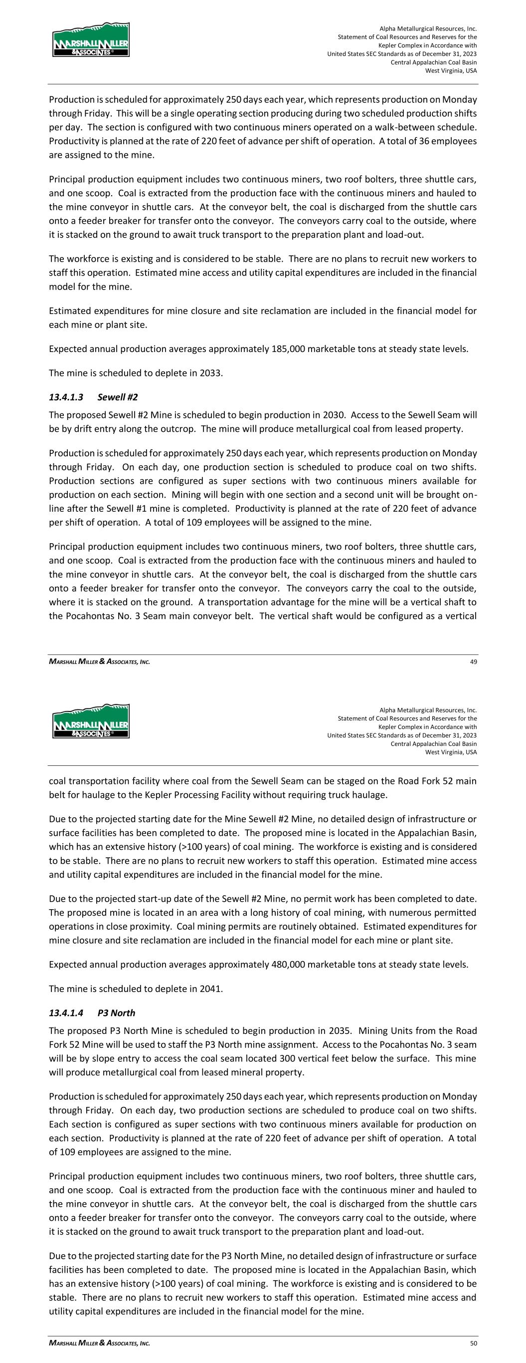 Alpha Metallurgical Resources, Inc. Statement of Coal Resources and Reserves for the Kepler Complex in Accordance with United States SEC Standards as of December 31, 2023 Central Appalachian Coal Basin West Virginia, USA MARSHALL MILLER & ASSOCIATES, INC. 49 Production is scheduled for approximately 250 days each year, which represents production on Monday through Friday. This will be a single operating section producing during two scheduled production shifts per day. The section is configured with two continuous miners operated on a walk-between schedule. Productivity is planned at the rate of 220 feet of advance per shift of operation. A total of 36 employees are assigned to the mine. Principal production equipment includes two continuous miners, two roof bolters, three shuttle cars, and one scoop. Coal is extracted from the production face with the continuous miners and hauled to the mine conveyor in shuttle cars. At the conveyor belt, the coal is discharged from the shuttle cars onto a feeder breaker for transfer onto the conveyor. The conveyors carry coal to the outside, where it is stacked on the ground to await truck transport to the preparation plant and load-out. The workforce is existing and is considered to be stable. There are no plans to recruit new workers to staff this operation. Estimated mine access and utility capital expenditures are included in the financial model for the mine. Estimated expenditures for mine closure and site reclamation are included in the financial model for each mine or plant site. Expected annual production averages approximately 185,000 marketable tons at steady state levels. The mine is scheduled to deplete in 2033. 13.4.1.3 Sewell #2 The proposed Sewell #2 Mine is scheduled to begin production in 2030. Access to the Sewell Seam will be by drift entry along the outcrop. The mine will produce metallurgical coal from leased property. Production is scheduled for approximately 250 days each year, which represents production on Monday through Friday. On each day, one production section is scheduled to produce coal on two shifts. Production sections are configured as super sections with two continuous miners available for production on each section. Mining will begin with one section and a second unit will be brought on- line after the Sewell #1 mine is completed. Productivity is planned at the rate of 220 feet of advance per shift of operation. A total of 109 employees will be assigned to the mine. Principal production equipment includes two continuous miners, two roof bolters, three shuttle cars, and one scoop. Coal is extracted from the production face with the continuous miners and hauled to the mine conveyor in shuttle cars. At the conveyor belt, the coal is discharged from the shuttle cars onto a feeder breaker for transfer onto the conveyor. The conveyors carry the coal to the outside, where it is stacked on the ground. A transportation advantage for the mine will be a vertical shaft to the Pocahontas No. 3 Seam main conveyor belt. The vertical shaft would be configured as a vertical Alpha Metallurgical Resources, Inc. Statement of Coal Resources and Reserves for the Kepler Complex in Accordance with United States SEC Standards as of December 31, 2023 Central Appalachian Coal Basin West Virginia, USA MARSHALL MILLER & ASSOCIATES, INC. 50 coal transportation facility where coal from the Sewell Seam can be staged on the Road Fork 52 main belt for haulage to the Kepler Processing Facility without requiring truck haulage. Due to the projected starting date for the Mine Sewell #2 Mine, no detailed design of infrastructure or surface facilities has been completed to date. The proposed mine is located in the Appalachian Basin, which has an extensive history (>100 years) of coal mining. The workforce is existing and is considered to be stable. There are no plans to recruit new workers to staff this operation. Estimated mine access and utility capital expenditures are included in the financial model for the mine. Due to the projected start-up date of the Sewell #2 Mine, no permit work has been completed to date. The proposed mine is located in an area with a long history of coal mining, with numerous permitted operations in close proximity. Coal mining permits are routinely obtained. Estimated expenditures for mine closure and site reclamation are included in the financial model for each mine or plant site. Expected annual production averages approximately 480,000 marketable tons at steady state levels. The mine is scheduled to deplete in 2041. 13.4.1.4 P3 North The proposed P3 North Mine is scheduled to begin production in 2035. Mining Units from the Road Fork 52 Mine will be used to staff the P3 North mine assignment. Access to the Pocahontas No. 3 seam will be by slope entry to access the coal seam located 300 vertical feet below the surface. This mine will produce metallurgical coal from leased mineral property. Production is scheduled for approximately 250 days each year, which represents production on Monday through Friday. On each day, two production sections are scheduled to produce coal on two shifts. Each section is configured as super sections with two continuous miners available for production on each section. Productivity is planned at the rate of 220 feet of advance per shift of operation. A total of 109 employees are assigned to the mine. Principal production equipment includes two continuous miners, two roof bolters, three shuttle cars, and one scoop. Coal is extracted from the production face with the continuous miner and hauled to the mine conveyor in shuttle cars. At the conveyor belt, the coal is discharged from the shuttle cars onto a feeder breaker for transfer onto the conveyor. The conveyors carry coal to the outside, where it is stacked on the ground to await truck transport to the preparation plant and load-out. Due to the projected starting date for the P3 North Mine, no detailed design of infrastructure or surface facilities 