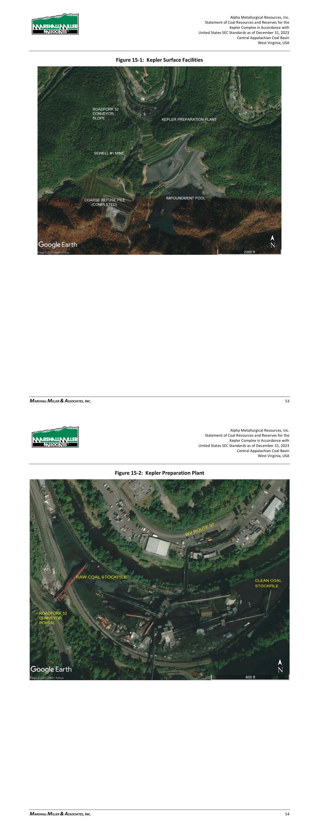 Alpha Metallurgical Resources, Inc. Statement of Coal Resources and Reserves for the Kepler Complex in Accordance with United States SEC Standards as of December 31, 2023 Central Appalachian Coal Basin West Virginia, USA MARSHALL MILLER & ASSOCIATES, INC. 53 Figure 15-1: Kepler Surface Facilities Alpha Metallurgical Resources, Inc. Statement of Coal Resources and Reserves for the Kepler Complex in Accordance with United States SEC Standards as of December 31, 2023 Central Appalachian Coal Basin West Virginia, USA MARSHALL MILLER & ASSOCIATES, INC. 54 Figure 15-2: Kepler Preparation Plant
