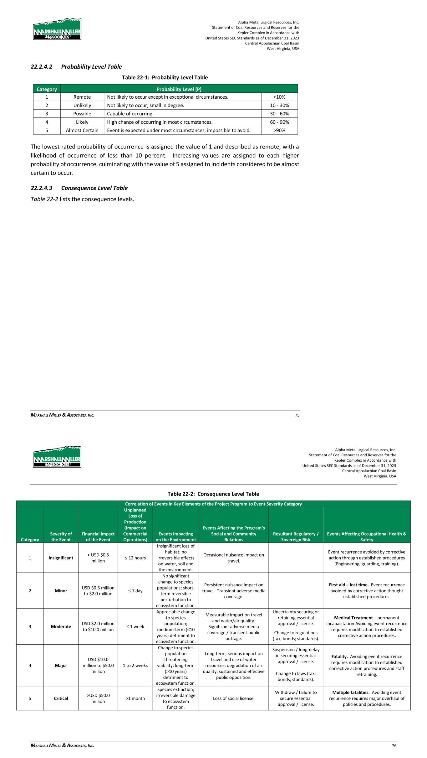 Alpha Metallurgical Resources, Inc. Statement of Coal Resources and Reserves for the Kepler Complex in Accordance with United States SEC Standards as of December 31, 2023 Central Appalachian Coal Basin West Virginia, USA MARSHALL MILLER & ASSOCIATES, INC. 75 22.2.4.2 Probability Level Table Table 22-1: Probability Level Table Category Probability Level (P) 1 Remote Not likely to occur except in exceptional circumstances. <10% 2 Unlikely Not likely to occur; small in degree. 10 - 30% 3 Possible Capable of occurring. 30 - 60% 4 Likely High chance of occurring in most circumstances. 60 - 90% 5 Almost Certain Event is expected under most circumstances; impossible to avoid. >90% The lowest rated probability of occurrence is assigned the value of 1 and described as remote, with a likelihood of occurrence of less than 10 percent. Increasing values are assigned to each higher probability of occurrence, culminating with the value of 5 assigned to incidents considered to be almost certain to occur. 22.2.4.3 Consequence Level Table Table 22-2 lists the consequence levels. Alpha Metallurgical Resources, Inc. Statement of Coal Resources and Reserves for the Kepler Complex in Accordance with United States SEC Standards as of December 31, 2023 Central Appalachian Coal Basin West Virginia, USA MARSHALL MILLER & ASSOCIATES, INC. 76 Table 22-2: Consequence Level Table Correlation of Events in Key Elements of the Project Program to Event Severity Category Category Severity of the Event Financial Impact of the Event Unplanned Loss of Production (Impact on Commercial Operations) Events Impacting on the Environment Events Affecting the Program’s Social and Community Relations Resultant Regulatory / Sovereign Risk Events Affecting Occupational Health & Safety 1 Insignificant < USD $0.5 million ≤ 12 hours Insignificant loss of habitat; no irreversible effects on water, soil and the environment. Occasional nuisance impact on travel. Event recurrence avoided by corrective action through established procedures (Engineering, guarding, training). 2 Minor USD $0.5 million to $2.0 million ≤ 1 day No significant change to species populations; short- term reversible perturbation to ecosystem function. Persistent nuisance impact on travel. Transient adverse media coverage. First aid – lost time. Event recurrence avoided by corrective action thought established procedures. 3 Moderate USD $2.0 million to $10.0 million ≤ 1 week Appreciable change to species population; medium-term (≤10 years) detriment to ecosystem function. Measurable impact on travel and water/air quality. Significant adverse media coverage / transient public outrage. Uncertainty securing or retaining essential approval / license. Medical Treatment – permanent incapacitation Avoiding event recurrence requires modification to established corrective action procedures. Change to regulations (tax; bonds; standards). 4 Major USD $10.0 million to $50.0 million 1 to 2 weeks Change to species population threatening viability; long-term (>10 years) detriment to ecosystem function. Long-term, serious impact on travel and use of water resources; degradation of air quality; sustained and effective public opposition. Suspension / long-delay in securing essential approval / license. Fatality. Avoiding event recurrence requires modification to established corrective action procedures and staff retraining. Change to laws (tax; bonds; standards). 5 Critical >USD $50.0 million >1 month Species extinction; irreversible damage to ecosystem function. Loss of social license. Withdraw / failure to secure essential approval / license. Multiple fatalities. Avoiding event recurrence requires major overhaul of policies and procedures.