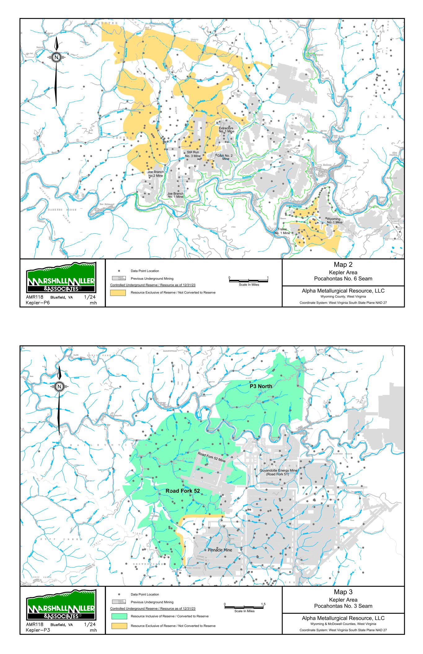 Tralee No. 1 Mine Extractors No. 1 Mine G&A No. 2 Mine Joe Branch No. 1 Mine Wyoming No. 1 Mine Joe Branch No.2 Mine Still Run No. 3 Mine 1 Scale In Miles 0 Data Point Location Map 2 Kepler Area Pocahontas No. 6 Seam Alpha Metallurgical Resource, LLC Wyoming County, West Virginia Coordinate System: West Virginia South State Plane NAD 27 Controlled Underground Reserve / Resource as of 12/31/23 Previous Underground Mining N Resource Exclusive of Reserve / Not Converted to Reserve 20 R R R RR R R R R R R R R RR R 5 Right Off 3 South Mains DH dh dh dh dh well bor e locate d OLD LONGWALL SECTION "F AU LT " 5 10 40 R R 9 10 11 13 14 15 16 17 18 SEAL 2 SEAL 1 SEAL 3 SE AL 4 SE AL 5 SE AL 6 SE AL 7 SE AL 8 D D D D D D D D D R R R R R DD R R R R R R R R R R D R R WT 12 R R R R R R R R R R R R R R R R R RR R R RRRRRR R R R R R R R R R R R R R R R R R R R R R R R R 19 Seals 19-29 22 23 24 25 27 28 29 35 36 373839 40 41 42 43 44 45 Seals 30-34 Seals 35-39 Seals 40-49 R R R R D D R RR R R 20 21 26 34 33 32 31 30 49 WT 48 47 46 DD R WT R D D RR R well bor e locate d 1 5 10 15 20 25 30 R N STE WE GRADE AND R O A D R A IL OLD FO LK NOR UNNEL T Alpha Land and Reserves LLC (Lessee) Heartwood Forestland Fund III, L.P. (Lessor) Pinnacle Mine (Road Fork 51) Guyandotte Energy Mine P3 North Road Fork 52 Road Fork 52 Mine 1.5 Scale In Miles 0 Data Point Location Map 3 Kepler Area Pocahontas No. 3 Seam Alpha Metallurgical Resource, LLC Wyoming & McDowell Counties, West Virginia Coordinate System: West Virginia South State Plane NAD 27 Controlled Underground Reserve / Resource as of 12/31/23 Previous Underground Mining N Resource Exclusive of Reserve / Not Converted to Reserve Resource Inclusive of Reserve / Converted to Reserve