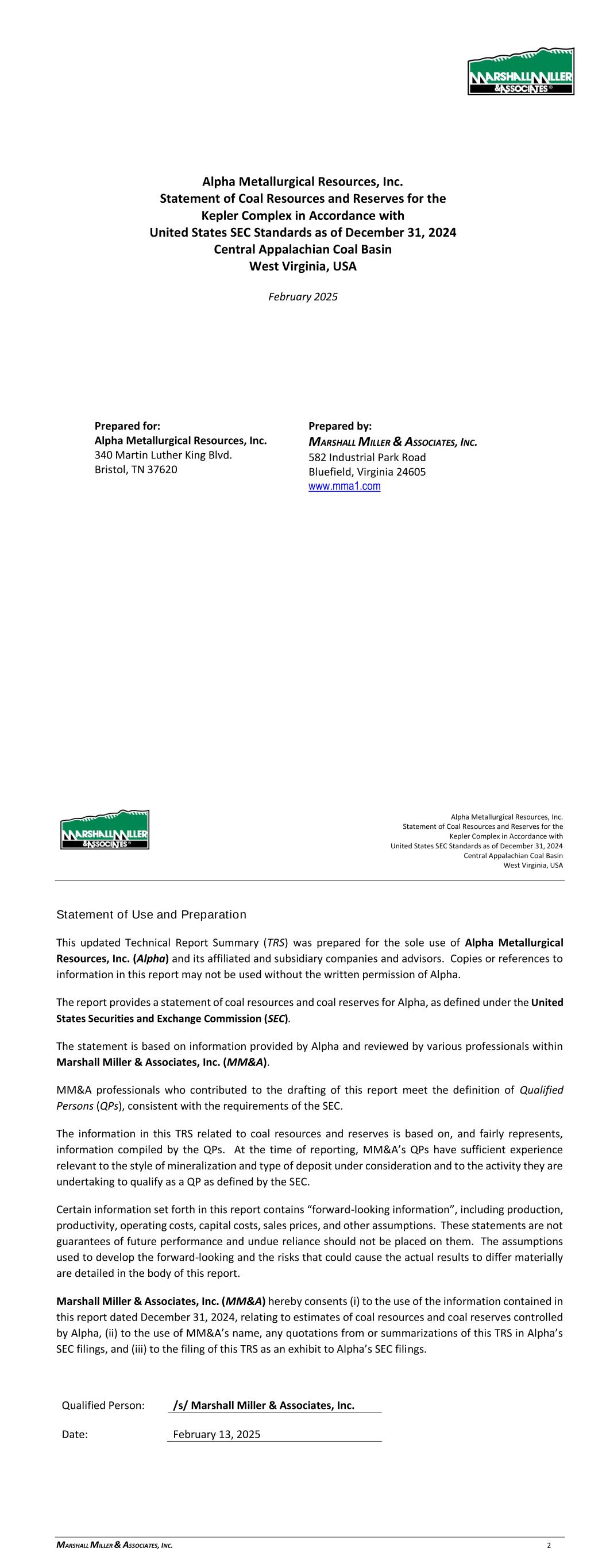 Alpha Metallurgical Resources, Inc. Statement of Coal Resources and Reserves for the Kepler Complex in Accordance with United States SEC Standards as of December 31, 2024 Central Appalachian Coal Basin West Virginia, USA February 2025 Prepared for: Alpha Metallurgical Resources, Inc. 340 Martin Luther King Blvd. Bristol, TN 37620 Prepared by: MARSHALL MILLER & ASSOCIATES, INC. 582 Industrial Park Road Bluefield, Virginia 24605 www.mma1.com Alpha Metallurgical Resources, Inc. Statement of Coal Resources and Reserves for the Kepler Complex in Accordance with United States SEC Standards as of December 31, 2024 Central Appalachian Coal Basin West Virginia, USA MARSHALL MILLER & ASSOCIATES, INC. 2 Statement of Use and Preparation This updated Technical Report Summary (TRS) was prepared for the sole use of Alpha Metallurgical Resources, Inc. (Alpha) and its affiliated and subsidiary companies and advisors. Copies or references to information in this report may not be used without the written permission of Alpha. The report provides a statement of coal resources and coal reserves for Alpha, as defined under the United States Securities and Exchange Commission (SEC). The statement is based on information provided by Alpha and reviewed by various professionals within Marshall Miller & Associates, Inc. (MM&A). MM&A professionals who contributed to the drafting of this report meet the definition of Qualified Persons (QPs), consistent with the requirements of the SEC. The information in this TRS related to coal resources and reserves is based on, and fairly represents, information compiled by the QPs. At the time of reporting, MM&A’s QPs have sufficient experience relevant to the style of mineralization and type of deposit under consideration and to the activity they are undertaking to qualify as a QP as defined by the SEC. Certain information set forth in this report contains “forward-looking information”, including production, productivity, operating costs, capital costs, sales prices, and other assumptions. These statements are not guarantees of future performance and undue reliance should not be placed on them. The assumptions used to develop the forward-looking and the risks that could cause the actual results to differ materially are detailed in the body of this report. Marshall Miller & Associates, Inc. (MM&A) hereby consents (i) to the use of the information contained in this report dated December 31, 2024, relating to estimates of coal resources and coal reserves controlled by Alpha, (ii) to the use of MM&A’s name, any quotations from or summarizations of this TRS in Alpha’s SEC filings, and (iii) to the filing of this TRS as an exhibit to Alpha’s SEC filings. Qualified Person: /s/ Marshall Miller & Associates, Inc. Date: February 13, 2025