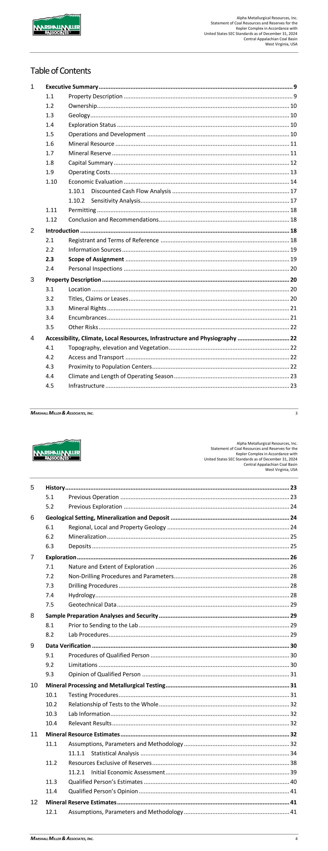 Alpha Metallurgical Resources, Inc. Statement of Coal Resources and Reserves for the Kepler Complex in Accordance with United States SEC Standards as of December 31, 2024 Central Appalachian Coal Basin West Virginia, USA MARSHALL MILLER & ASSOCIATES, INC. 3 Table of Contents 1 Executive Summary .................................................................................................................... 9 1.1 Property Description ..................................................................................................... 9 1.2 Ownership ................................................................................................................... 10 1.3 Geology ....................................................................................................................... 10 1.4 Exploration Status ....................................................................................................... 10 1.5 Operations and Development ..................................................................................... 10 1.6 Mineral Resource ........................................................................................................ 11 1.7 Mineral Reserve .......................................................................................................... 11 1.8 Capital Summary ......................................................................................................... 12 1.9 Operating Costs ........................................................................................................... 13 1.10 Economic Evaluation ................................................................................................... 14 1.10.1 Discounted Cash Flow Analysis ...................................................................... 17 1.10.2 Sensitivity Analysis ......................................................................................... 17 1.11 Permitting ................................................................................................................... 18 1.12 Conclusion and Recommendations .............................................................................. 18 2 Introduction ............................................................................................................................. 18 2.1 Registrant and Terms of Reference ............................................................................. 18 2.2 Information Sources .................................................................................................... 19 2.3 Scope of Assignment .................................................................................................. 19 2.4 Personal Inspections ................................................................................................... 20 3 Property Description ................................................................................................................ 20 3.1 Location ...................................................................................................................... 20 3.2 Titles, Claims or Leases ................................................................................................ 20 3.3 Mineral Rights ............................................................................................................. 21 3.4 Encumbrances ............................................................................................................. 21 3.5 Other Risks .................................................................................................................. 22 4 Accessibility, Climate, Local Resources, Infrastructure and Physiography ............................... 22 4.1 Topography, elevation and Vegetation ........................................................................ 22 4.2 Access and Transport .................................................................................................. 22 4.3 Proximity to Population Centers .................................................................................. 22 4.4 Climate and Length of Operating Season ..................................................................... 23 4.5 Infrastructure .............................................................................................................. 23 Alpha Metallurgical Resources, Inc. Statement of Coal Resources and Reserves for the Kepler Complex in Accordance with United States SEC Standards as of December 31, 2024 Central Appalachian Coal Basin West Virginia, USA MARSHALL MILLER & ASSOCIATES, INC. 4 5 History ...................................................................................................................................... 23 5.1 Previous Operation ..................................................................................................... 23 5.2 Previous Exploration ................................................................................................... 24 6 Geological Setting, Mineralization and Deposit ....................................................................... 24 6.1 Regional, Local and Property Geology ......................................................................... 24 6.2 Mineralization ............................................................................................................. 25 6.3 Deposits ...................................................................................................................... 25 7 Exploration ............................................................................................................................... 26 7.1 Nature and Extent of Exploration ................................................................................ 26 7.2 Non-Drilling Procedures and Parameters ..................................................................... 28 7.3 Drilling Procedures ............................................................