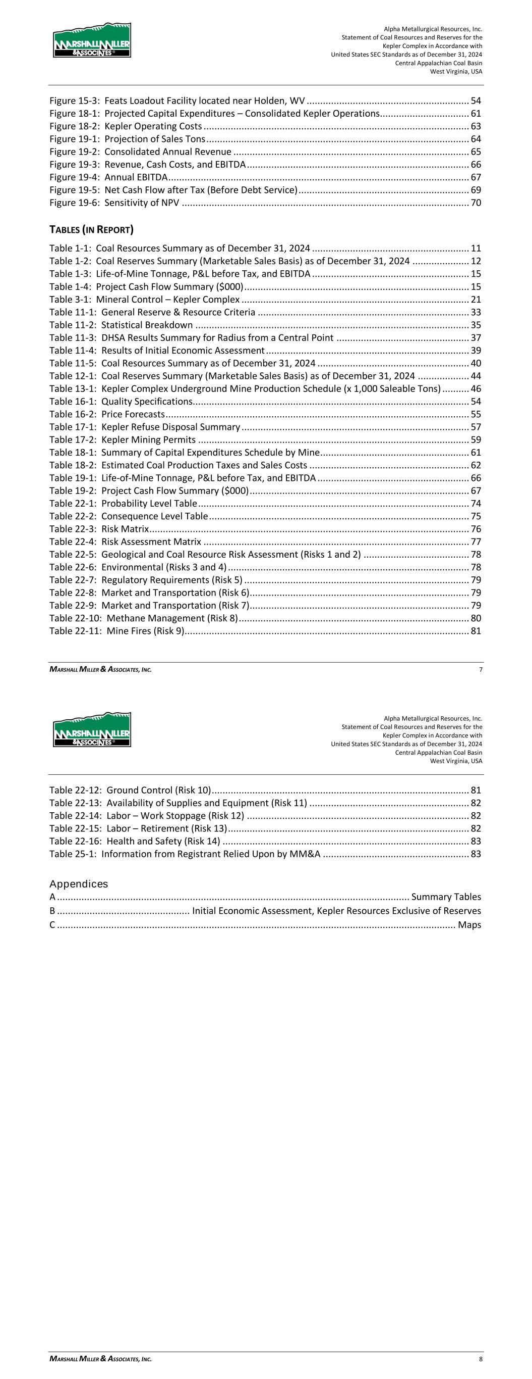 Alpha Metallurgical Resources, Inc. Statement of Coal Resources and Reserves for the Kepler Complex in Accordance with United States SEC Standards as of December 31, 2024 Central Appalachian Coal Basin West Virginia, USA MARSHALL MILLER & ASSOCIATES, INC. 7 Figure 15-3: Feats Loadout Facility located near Holden, WV ............................................................ 54 Figure 18-1: Projected Capital Expenditures – Consolidated Kepler Operations................................. 61 Figure 18-2: Kepler Operating Costs .................................................................................................. 63 Figure 19-1: Projection of Sales Tons ................................................................................................. 64 Figure 19-2: Consolidated Annual Revenue ....................................................................................... 65 Figure 19-3: Revenue, Cash Costs, and EBITDA .................................................................................. 66 Figure 19-4: Annual EBITDA ............................................................................................................... 67 Figure 19-5: Net Cash Flow after Tax (Before Debt Service) ............................................................... 69 Figure 19-6: Sensitivity of NPV .......................................................................................................... 70 TABLES (IN REPORT) Table 1-1: Coal Resources Summary as of December 31, 2024 .......................................................... 11 Table 1-2: Coal Reserves Summary (Marketable Sales Basis) as of December 31, 2024 ..................... 12 Table 1-3: Life-of-Mine Tonnage, P&L before Tax, and EBITDA .......................................................... 15 Table 1-4: Project Cash Flow Summary ($000) ................................................................................... 15 Table 3-1: Mineral Control – Kepler Complex .................................................................................... 21 Table 11-1: General Reserve & Resource Criteria .............................................................................. 33 Table 11-2: Statistical Breakdown ..................................................................................................... 35 Table 11-3: DHSA Results Summary for Radius from a Central Point ................................................. 37 Table 11-4: Results of Initial Economic Assessment ........................................................................... 39 Table 11-5: Coal Resources Summary as of December 31, 2024 ........................................................ 40 Table 12-1: Coal Reserves Summary (Marketable Sales Basis) as of December 31, 2024 ................... 44 Table 13-1: Kepler Complex Underground Mine Production Schedule (x 1,000 Saleable Tons) .......... 46 Table 16-1: Quality Specifications...................................................................................................... 54 Table 16-2: Price Forecasts ................................................................................................................ 55 Table 17-1: Kepler Refuse Disposal Summary .................................................................................... 57 Table 17-2: Kepler Mining Permits .................................................................................................... 59 Table 18-1: Summary of Capital Expenditures Schedule by Mine....................................................... 61 Table 18-2: Estimated Coal Production Taxes and Sales Costs ........................................................... 62 Table 19-1: Life-of-Mine Tonnage, P&L before Tax, and EBITDA ........................................................ 66 Table 19-2: Project Cash Flow Summary ($000) ................................................................................. 67 Table 22-1: Probability Level Table .................................................................................................... 74 Table 22-2: Consequence Level Table ................................................................................................ 75 Table 22-3: Risk Matrix ...................................................................................................................... 76 Table 22-4: Risk Assessment Matrix .................................................................................................. 77 Table 22-5: Geological and Coal Resource Risk Assessment (Risks 1 and 2) ....................................... 78 Table 22-6: Environmental (Risks 3 and 4) ......................................................................................... 78 Table 22-7: Regulatory Requirements (Risk 5) ................................................................................... 79 Table 22-8: Market and Transportation (Risk 6)................................................................................. 79 Table 22-9: Market and Transportation (Risk 7)................................................................................. 79 Table 22-10: Methane Management (Risk 8) ..................................................................................... 80 Table 22-11: Mine Fires (Risk 9)......................................................................................................... 81 Alpha Metallurgical Resources, Inc. Statement of Coal Resources and Reserves for the Kepler Complex in Accordance with United States SEC Standards as of December 31, 2024 Central Appalachian Coal Basin West Virginia, USA MARSHALL MILLER & ASSOCIATES, INC. 8 Table 22-12: Ground Control (Risk 10) ............................................................................................... 81 Table 22-13: Availability of Supplies and Equipment (Risk 11) ........................................................... 82 Table 22-14: Labor – Work Stoppag