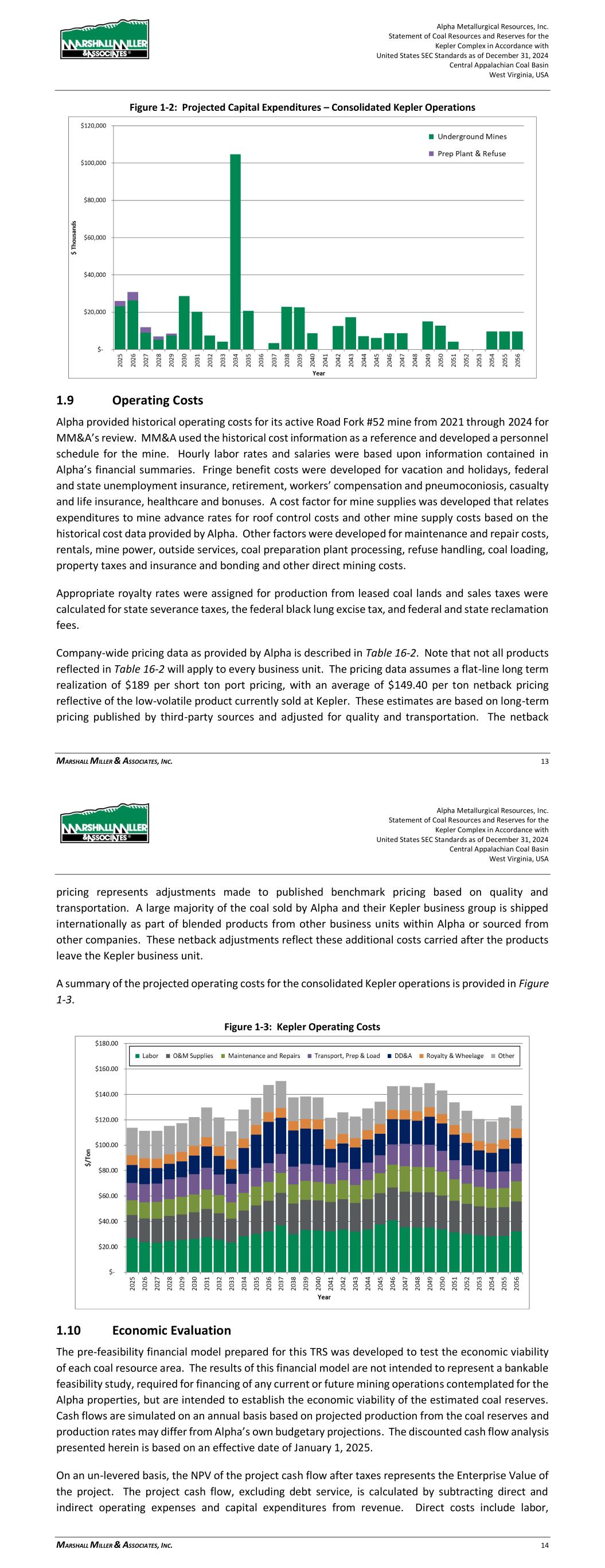 Alpha Metallurgical Resources, Inc. Statement of Coal Resources and Reserves for the Kepler Complex in Accordance with United States SEC Standards as of December 31, 2024 Central Appalachian Coal Basin West Virginia, USA MARSHALL MILLER & ASSOCIATES, INC. 13 Figure 1-2: Projected Capital Expenditures – Consolidated Kepler Operations 1.9 Operating Costs Alpha provided historical operating costs for its active Road Fork #52 mine from 2021 through 2024 for MM&A’s review. MM&A used the historical cost information as a reference and developed a personnel schedule for the mine. Hourly labor rates and salaries were based upon information contained in Alpha’s financial summaries. Fringe benefit costs were developed for vacation and holidays, federal and state unemployment insurance, retirement, workers’ compensation and pneumoconiosis, casualty and life insurance, healthcare and bonuses. A cost factor for mine supplies was developed that relates expenditures to mine advance rates for roof control costs and other mine supply costs based on the historical cost data provided by Alpha. Other factors were developed for maintenance and repair costs, rentals, mine power, outside services, coal preparation plant processing, refuse handling, coal loading, property taxes and insurance and bonding and other direct mining costs. Appropriate royalty rates were assigned for production from leased coal lands and sales taxes were calculated for state severance taxes, the federal black lung excise tax, and federal and state reclamation fees. Company-wide pricing data as provided by Alpha is described in Table 16-2. Note that not all products reflected in Table 16-2 will apply to every business unit. The pricing data assumes a flat-line long term realization of $189 per short ton port pricing, with an average of $149.40 per ton netback pricing reflective of the low-volatile product currently sold at Kepler. These estimates are based on long-term pricing published by third-party sources and adjusted for quality and transportation. The netback Alpha Metallurgical Resources, Inc. Statement of Coal Resources and Reserves for the Kepler Complex in Accordance with United States SEC Standards as of December 31, 2024 Central Appalachian Coal Basin West Virginia, USA MARSHALL MILLER & ASSOCIATES, INC. 14 pricing represents adjustments made to published benchmark pricing based on quality and transportation. A large majority of the coal sold by Alpha and their Kepler business group is shipped internationally as part of blended products from other business units within Alpha or sourced from other companies. These netback adjustments reflect these additional costs carried after the products leave the Kepler business unit. A summary of the projected operating costs for the consolidated Kepler operations is provided in Figure 1-3. Figure 1-3: Kepler Operating Costs 1.10 Economic Evaluation The pre-feasibility financial model prepared for this TRS was developed to test the economic viability of each coal resource area. The results of this financial model are not intended to represent a bankable feasibility study, required for financing of any current or future mining operations contemplated for the Alpha properties, but are intended to establish the economic viability of the estimated coal reserves. Cash flows are simulated on an annual basis based on projected production from the coal reserves and production rates may differ from Alpha’s own budgetary projections. The discounted cash flow analysis presented herein is based on an effective date of January 1, 2025. On an un-levered basis, the NPV of the project cash flow after taxes represents the Enterprise Value of the project. The project cash flow, excluding debt service, is calculated by subtracting direct and indirect operating expenses and capital expenditures from revenue. Direct costs include labor,