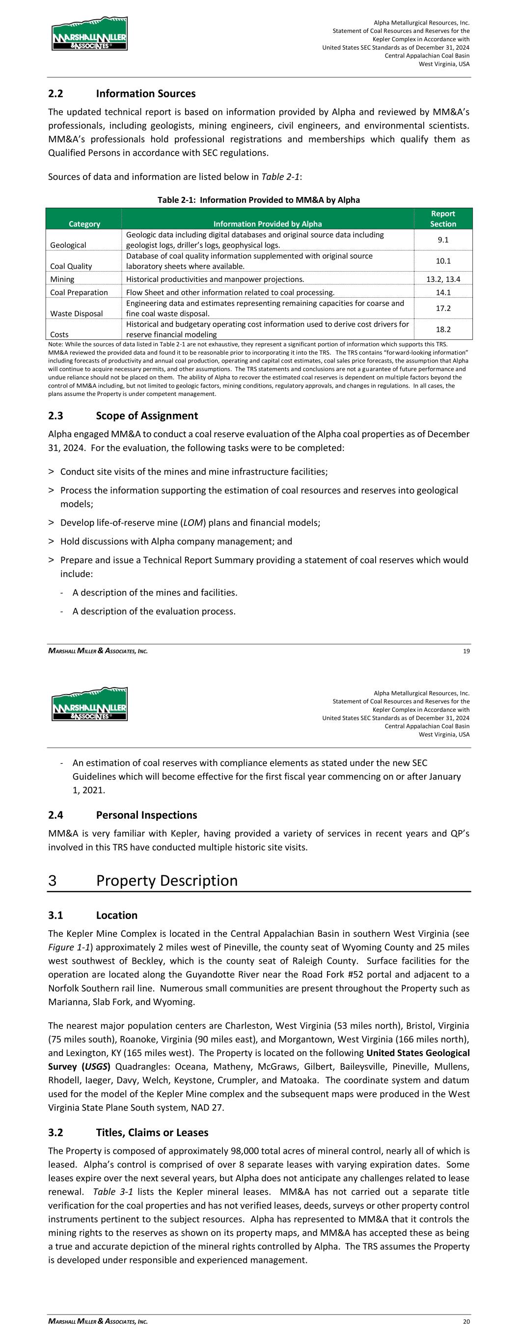Alpha Metallurgical Resources, Inc. Statement of Coal Resources and Reserves for the Kepler Complex in Accordance with United States SEC Standards as of December 31, 2024 Central Appalachian Coal Basin West Virginia, USA MARSHALL MILLER & ASSOCIATES, INC. 19 2.2 Information Sources The updated technical report is based on information provided by Alpha and reviewed by MM&A’s professionals, including geologists, mining engineers, civil engineers, and environmental scientists. MM&A’s professionals hold professional registrations and memberships which qualify them as Qualified Persons in accordance with SEC regulations. Sources of data and information are listed below in Table 2-1: Table 2-1: Information Provided to MM&A by Alpha Category Information Provided by Alpha Report Section Geological Geologic data including digital databases and original source data including geologist logs, driller’s logs, geophysical logs. 9.1 Coal Quality Database of coal quality information supplemented with original source laboratory sheets where available. 10.1 Mining Historical productivities and manpower projections. 13.2, 13.4 Coal Preparation Flow Sheet and other information related to coal processing. 14.1 Waste Disposal Engineering data and estimates representing remaining capacities for coarse and fine coal waste disposal. 17.2 Costs Historical and budgetary operating cost information used to derive cost drivers for reserve financial modeling 18.2 Note: While the sources of data listed in Table 2-1 are not exhaustive, they represent a significant portion of information which supports this TRS. MM&A reviewed the provided data and found it to be reasonable prior to incorporating it into the TRS. The TRS contains “forward-looking information” including forecasts of productivity and annual coal production, operating and capital cost estimates, coal sales price forecasts, the assumption that Alpha will continue to acquire necessary permits, and other assumptions. The TRS statements and conclusions are not a guarantee of future performance and undue reliance should not be placed on them. The ability of Alpha to recover the estimated coal reserves is dependent on multiple factors beyond the control of MM&A including, but not limited to geologic factors, mining conditions, regulatory approvals, and changes in regulations. In all cases, the plans assume the Property is under competent management. 2.3 Scope of Assignment Alpha engaged MM&A to conduct a coal reserve evaluation of the Alpha coal properties as of December 31, 2024. For the evaluation, the following tasks were to be completed: > Conduct site visits of the mines and mine infrastructure facilities; > Process the information supporting the estimation of coal resources and reserves into geological models; > Develop life-of-reserve mine (LOM) plans and financial models; > Hold discussions with Alpha company management; and > Prepare and issue a Technical Report Summary providing a statement of coal reserves which would include: - A description of the mines and facilities. - A description of the evaluation process. Alpha Metallurgical Resources, Inc. Statement of Coal Resources and Reserves for the Kepler Complex in Accordance with United States SEC Standards as of December 31, 2024 Central Appalachian Coal Basin West Virginia, USA MARSHALL MILLER & ASSOCIATES, INC. 20 - An estimation of coal reserves with compliance elements as stated under the new SEC Guidelines which will become effective for the first fiscal year commencing on or after January 1, 2021. 2.4 Personal Inspections MM&A is very familiar with Kepler, having provided a variety of services in recent years and QP’s involved in this TRS have conducted multiple historic site visits. 3 Property Description 3.1 Location The Kepler Mine Complex is located in the Central Appalachian Basin in southern West Virginia (see Figure 1-1) approximately 2 miles west of Pineville, the county seat of Wyoming County and 25 miles west southwest of Beckley, which is the county seat of Raleigh County. Surface facilities for the operation are located along the Guyandotte River near the Road Fork #52 portal and adjacent to a Norfolk Southern rail line. Numerous small communities are present throughout the Property such as Marianna, Slab Fork, and Wyoming. The nearest major population centers are Charleston, West Virginia (53 miles north), Bristol, Virginia (75 miles south), Roanoke, Virginia (90 miles east), and Morgantown, West Virginia (166 miles north), and Lexington, KY (165 miles west). The Property is located on the following United States Geological Survey (USGS) Quadrangles: Oceana, Matheny, McGraws, Gilbert, Baileysville, Pineville, Mullens, Rhodell, Iaeger, Davy, Welch, Keystone, Crumpler, and Matoaka. The coordinate system and datum used for the model of the Kepler Mine complex and the subsequent maps were produced in the West Virginia State Plane South system, NAD 27. 3.2 Titles, Claims or Leases The Property is composed of approximately 98,000 total acres of mineral control, nearly all of which is leased. Alpha’s control is comprised of over 8 separate leases with varying expiration dates. Some leases expire over the next several years, but Alpha does not anticipate any challenges related to lease renewal. Table 3-1 lists the Kepler mineral leases. MM&A has not carried out a separate title verification for the coal properties and has not verified leases, deeds, surveys or other property control instruments pertinent to the subject resources. Alpha has represented to MM&A that it controls the mining rights to the reserves as shown on its property maps, and MM&A has accepted these as being a true and accurate depiction of the mineral rights controlled by Alpha. The TRS assumes the Property is developed under responsible and experienced management.