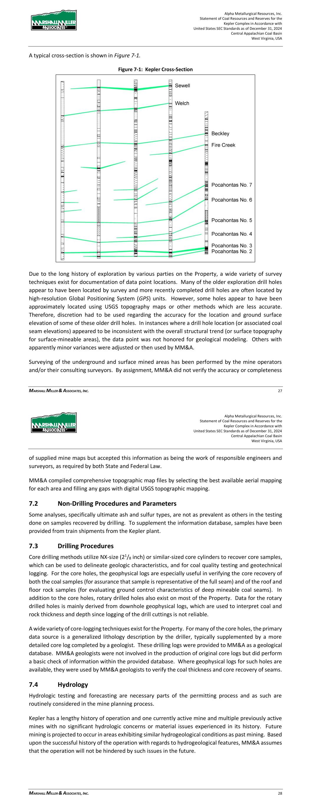 Alpha Metallurgical Resources, Inc. Statement of Coal Resources and Reserves for the Kepler Complex in Accordance with United States SEC Standards as of December 31, 2024 Central Appalachian Coal Basin West Virginia, USA MARSHALL MILLER & ASSOCIATES, INC. 27 A typical cross-section is shown in Figure 7-1. Figure 7-1: Kepler Cross-Section Due to the long history of exploration by various parties on the Property, a wide variety of survey techniques exist for documentation of data point locations. Many of the older exploration drill holes appear to have been located by survey and more recently completed drill holes are often located by high-resolution Global Positioning System (GPS) units. However, some holes appear to have been approximately located using USGS topography maps or other methods which are less accurate. Therefore, discretion had to be used regarding the accuracy for the location and ground surface elevation of some of these older drill holes. In instances where a drill hole location (or associated coal seam elevations) appeared to be inconsistent with the overall structural trend (or surface topography for surface-mineable areas), the data point was not honored for geological modeling. Others with apparently minor variances were adjusted or then used by MM&A. Surveying of the underground and surface mined areas has been performed by the mine operators and/or their consulting surveyors. By assignment, MM&A did not verify the accuracy or completeness Alpha Metallurgical Resources, Inc. Statement of Coal Resources and Reserves for the Kepler Complex in Accordance with United States SEC Standards as of December 31, 2024 Central Appalachian Coal Basin West Virginia, USA MARSHALL MILLER & ASSOCIATES, INC. 28 of supplied mine maps but accepted this information as being the work of responsible engineers and surveyors, as required by both State and Federal Law. MM&A compiled comprehensive topographic map files by selecting the best available aerial mapping for each area and filling any gaps with digital USGS topographic mapping. 7.2 Non-Drilling Procedures and Parameters Some analyses, specifically ultimate ash and sulfur types, are not as prevalent as others in the testing done on samples recovered by drilling. To supplement the information database, samples have been provided from train shipments from the Kepler plant. 7.3 Drilling Procedures Core drilling methods utilize NX-size (21/8 inch) or similar-sized core cylinders to recover core samples, which can be used to delineate geologic characteristics, and for coal quality testing and geotechnical logging. For the core holes, the geophysical logs are especially useful in verifying the core recovery of both the coal samples (for assurance that sample is representative of the full seam) and of the roof and floor rock samples (for evaluating ground control characteristics of deep mineable coal seams). In addition to the core holes, rotary drilled holes also exist on most of the Property. Data for the rotary drilled holes is mainly derived from downhole geophysical logs, which are used to interpret coal and rock thickness and depth since logging of the drill cuttings is not reliable. A wide variety of core-logging techniques exist for the Property. For many of the core holes, the primary data source is a generalized lithology description by the driller, typically supplemented by a more detailed core log completed by a geologist. These drilling logs were provided to MM&A as a geological database. MM&A geologists were not involved in the production of original core logs but did perform a basic check of information within the provided database. Where geophysical logs for such holes are available, they were used by MM&A geologists to verify the coal thickness and core recovery of seams. 7.4 Hydrology Hydrologic testing and forecasting are necessary parts of the permitting process and as such are routinely considered in the mine planning process. Kepler has a lengthy history of operation and one currently active mine and multiple previously active mines with no significant hydrologic concerns or material issues experienced in its history. Future mining is projected to occur in areas exhibiting similar hydrogeological conditions as past mining. Based upon the successful history of the operation with regards to hydrogeological features, MM&A assumes that the operation will not be hindered by such issues in the future.