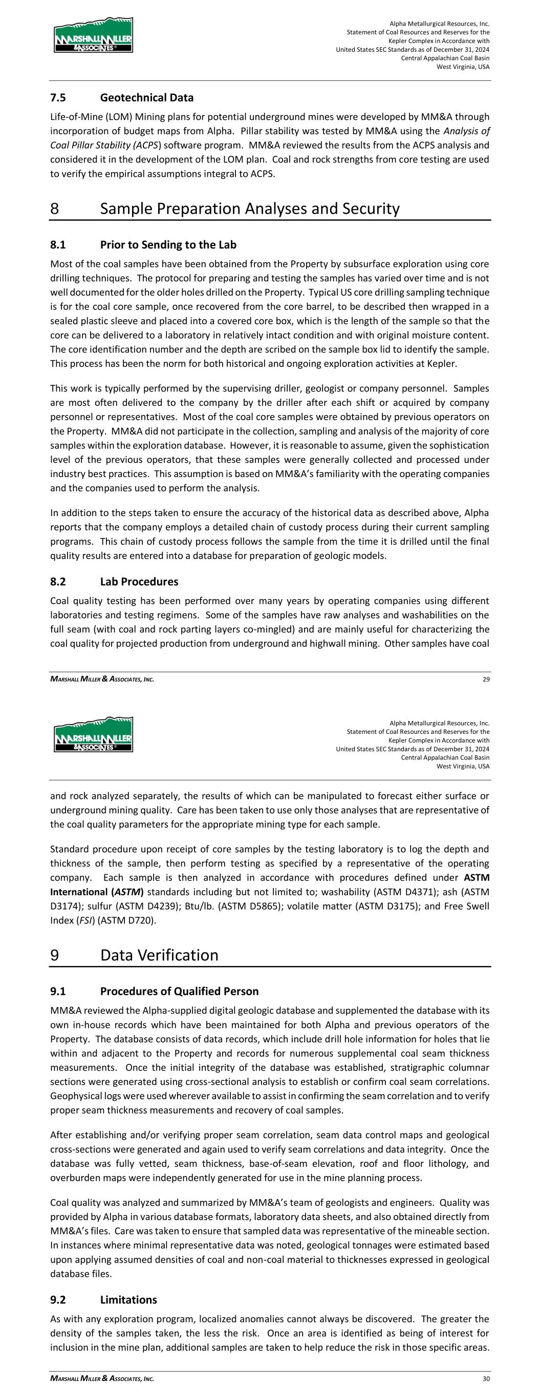 Alpha Metallurgical Resources, Inc. Statement of Coal Resources and Reserves for the Kepler Complex in Accordance with United States SEC Standards as of December 31, 2024 Central Appalachian Coal Basin West Virginia, USA MARSHALL MILLER & ASSOCIATES, INC. 29 7.5 Geotechnical Data Life-of-Mine (LOM) Mining plans for potential underground mines were developed by MM&A through incorporation of budget maps from Alpha. Pillar stability was tested by MM&A using the Analysis of Coal Pillar Stability (ACPS) software program. MM&A reviewed the results from the ACPS analysis and considered it in the development of the LOM plan. Coal and rock strengths from core testing are used to verify the empirical assumptions integral to ACPS. 8 Sample Preparation Analyses and Security 8.1 Prior to Sending to the Lab Most of the coal samples have been obtained from the Property by subsurface exploration using core drilling techniques. The protocol for preparing and testing the samples has varied over time and is not well documented for the older holes drilled on the Property. Typical US core drilling sampling technique is for the coal core sample, once recovered from the core barrel, to be described then wrapped in a sealed plastic sleeve and placed into a covered core box, which is the length of the sample so that the core can be delivered to a laboratory in relatively intact condition and with original moisture content. The core identification number and the depth are scribed on the sample box lid to identify the sample. This process has been the norm for both historical and ongoing exploration activities at Kepler. This work is typically performed by the supervising driller, geologist or company personnel. Samples are most often delivered to the company by the driller after each shift or acquired by company personnel or representatives. Most of the coal core samples were obtained by previous operators on the Property. MM&A did not participate in the collection, sampling and analysis of the majority of core samples within the exploration database. However, it is reasonable to assume, given the sophistication level of the previous operators, that these samples were generally collected and processed under industry best practices. This assumption is based on MM&A’s familiarity with the operating companies and the companies used to perform the analysis. In addition to the steps taken to ensure the accuracy of the historical data as described above, Alpha reports that the company employs a detailed chain of custody process during their current sampling programs. This chain of custody process follows the sample from the time it is drilled until the final quality results are entered into a database for preparation of geologic models. 8.2 Lab Procedures Coal quality testing has been performed over many years by operating companies using different laboratories and testing regimens. Some of the samples have raw analyses and washabilities on the full seam (with coal and rock parting layers co-mingled) and are mainly useful for characterizing the coal quality for projected production from underground and highwall mining. Other samples have coal Alpha Metallurgical Resources, Inc. Statement of Coal Resources and Reserves for the Kepler Complex in Accordance with United States SEC Standards as of December 31, 2024 Central Appalachian Coal Basin West Virginia, USA MARSHALL MILLER & ASSOCIATES, INC. 30 and rock analyzed separately, the results of which can be manipulated to forecast either surface or underground mining quality. Care has been taken to use only those analyses that are representative of the coal quality parameters for the appropriate mining type for each sample. Standard procedure upon receipt of core samples by the testing laboratory is to log the depth and thickness of the sample, then perform testing as specified by a representative of the operating company. Each sample is then analyzed in accordance with procedures defined under ASTM International (ASTM) standards including but not limited to; washability (ASTM D4371); ash (ASTM D3174); sulfur (ASTM D4239); Btu/lb. (ASTM D5865); volatile matter (ASTM D3175); and Free Swell Index (FSI) (ASTM D720). 9 Data Verification 9.1 Procedures of Qualified Person MM&A reviewed the Alpha-supplied digital geologic database and supplemented the database with its own in-house records which have been maintained for both Alpha and previous operators of the Property. The database consists of data records, which include drill hole information for holes that lie within and adjacent to the Property and records for numerous supplemental coal seam thickness measurements. Once the initial integrity of the database was established, stratigraphic columnar sections were generated using cross-sectional analysis to establish or confirm coal seam correlations. Geophysical logs were used wherever available to assist in confirming the seam correlation and to verify proper seam thickness measurements and recovery of coal samples. After establishing and/or verifying proper seam correlation, seam data control maps and geological cross-sections were generated and again used to verify seam correlations and data integrity. Once the database was fully vetted, seam thickness, base-of-seam elevation, roof and floor lithology, and overburden maps were independently generated for use in the mine planning process. Coal quality was analyzed and summarized by MM&A’s team of geologists and engineers. Quality was provided by Alpha in various database formats, laboratory data sheets, and also obtained directly from MM&A’s files. Care was taken to ensure that sampled data was representative of the mineable section. In instances where minimal representative data was noted, geological tonnages were estimated based upon applying assumed densities of coal and non-coal material to thicknesses expressed in geological database files. 9.2 Limitations As with any exploration program, localized anomalies cannot