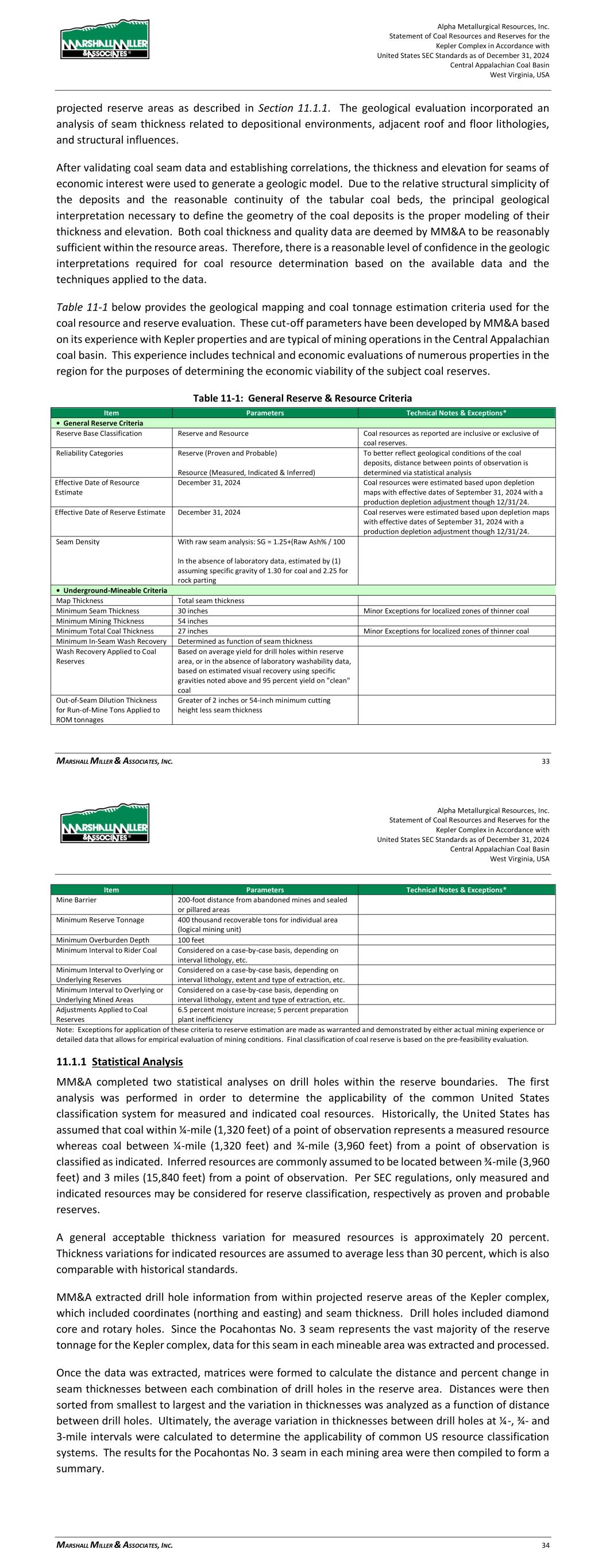 Alpha Metallurgical Resources, Inc. Statement of Coal Resources and Reserves for the Kepler Complex in Accordance with United States SEC Standards as of December 31, 2024 Central Appalachian Coal Basin West Virginia, USA MARSHALL MILLER & ASSOCIATES, INC. 33 projected reserve areas as described in Section 11.1.1. The geological evaluation incorporated an analysis of seam thickness related to depositional environments, adjacent roof and floor lithologies, and structural influences. After validating coal seam data and establishing correlations, the thickness and elevation for seams of economic interest were used to generate a geologic model. Due to the relative structural simplicity of the deposits and the reasonable continuity of the tabular coal beds, the principal geological interpretation necessary to define the geometry of the coal deposits is the proper modeling of their thickness and elevation. Both coal thickness and quality data are deemed by MM&A to be reasonably sufficient within the resource areas. Therefore, there is a reasonable level of confidence in the geologic interpretations required for coal resource determination based on the available data and the techniques applied to the data. Table 11-1 below provides the geological mapping and coal tonnage estimation criteria used for the coal resource and reserve evaluation. These cut-off parameters have been developed by MM&A based on its experience with Kepler properties and are typical of mining operations in the Central Appalachian coal basin. This experience includes technical and economic evaluations of numerous properties in the region for the purposes of determining the economic viability of the subject coal reserves. Table 11-1: General Reserve & Resource Criteria Item Parameters Technical Notes & Exceptions* • General Reserve Criteria Reserve Base Classification Reserve and Resource Coal resources as reported are inclusive or exclusive of coal reserves. Reliability Categories Reserve (Proven and Probable) Resource (Measured, Indicated & Inferred) To better reflect geological conditions of the coal deposits, distance between points of observation is determined via statistical analysis Effective Date of Resource Estimate December 31, 2024 Coal resources were estimated based upon depletion maps with effective dates of September 31, 2024 with a production depletion adjustment though 12/31/24. Effective Date of Reserve Estimate December 31, 2024 Coal reserves were estimated based upon depletion maps with effective dates of September 31, 2024 with a production depletion adjustment though 12/31/24. Seam Density With raw seam analysis: SG = 1.25+(Raw Ash% / 100 In the absence of laboratory data, estimated by (1) assuming specific gravity of 1.30 for coal and 2.25 for rock parting • Underground-Mineable Criteria Map Thickness Total seam thickness Minimum Seam Thickness 30 inches Minor Exceptions for localized zones of thinner coal Minimum Mining Thickness 54 inches Minimum Total Coal Thickness 27 inches Minor Exceptions for localized zones of thinner coal Minimum In-Seam Wash Recovery Determined as function of seam thickness Wash Recovery Applied to Coal Reserves Based on average yield for drill holes within reserve area, or in the absence of laboratory washability data, based on estimated visual recovery using specific gravities noted above and 95 percent yield on "clean" coal Out-of-Seam Dilution Thickness for Run-of-Mine Tons Applied to ROM tonnages Greater of 2 inches or 54-inch minimum cutting height less seam thickness Alpha Metallurgical Resources, Inc. Statement of Coal Resources and Reserves for the Kepler Complex in Accordance with United States SEC Standards as of December 31, 2024 Central Appalachian Coal Basin West Virginia, USA MARSHALL MILLER & ASSOCIATES, INC. 34 Item Parameters Technical Notes & Exceptions* Mine Barrier 200-foot distance from abandoned mines and sealed or pillared areas Minimum Reserve Tonnage 400 thousand recoverable tons for individual area (logical mining unit) Minimum Overburden Depth 100 feet Minimum Interval to Rider Coal Considered on a case-by-case basis, depending on interval lithology, etc. Minimum Interval to Overlying or Underlying Reserves Considered on a case-by-case basis, depending on interval lithology, extent and type of extraction, etc. Minimum Interval to Overlying or Underlying Mined Areas Considered on a case-by-case basis, depending on interval lithology, extent and type of extraction, etc. Adjustments Applied to Coal Reserves 6.5 percent moisture increase; 5 percent preparation plant inefficiency Note: Exceptions for application of these criteria to reserve estimation are made as warranted and demonstrated by either actual mining experience or detailed data that allows for empirical evaluation of mining conditions. Final classification of coal reserve is based on the pre-feasibility evaluation. 11.1.1 Statistical Analysis MM&A completed two statistical analyses on drill holes within the reserve boundaries. The first analysis was performed in order to determine the applicability of the common United States classification system for measured and indicated coal resources. Historically, the United States has assumed that coal within ¼-mile (1,320 feet) of a point of observation represents a measured resource whereas coal between ¼-mile (1,320 feet) and ¾-mile (3,960 feet) from a point of observation is classified as indicated. Inferred resources are commonly assumed to be located between ¾-mile (3,960 feet) and 3 miles (15,840 feet) from a point of observation. Per SEC regulations, only measured and indicated resources may be considered for reserve classification, respectively as proven and probable reserves. A general acceptable thickness variation for measured resources is approximately 20 percent. Thickness variations for indicated resources are assumed to average less than 30 percent, which is also comparable with historical standards. MM&A extracted drill hole in