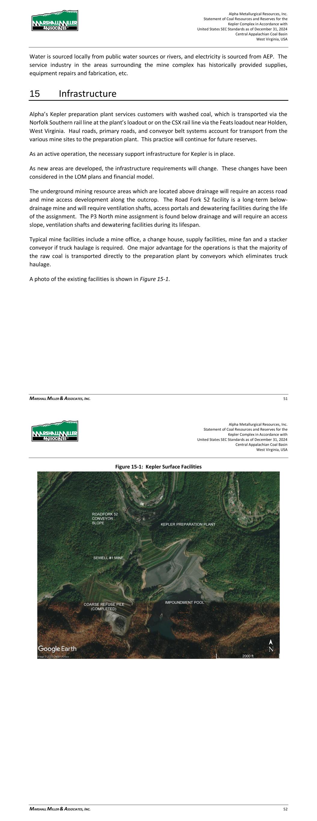 Alpha Metallurgical Resources, Inc. Statement of Coal Resources and Reserves for the Kepler Complex in Accordance with United States SEC Standards as of December 31, 2024 Central Appalachian Coal Basin West Virginia, USA MARSHALL MILLER & ASSOCIATES, INC. 51 Water is sourced locally from public water sources or rivers, and electricity is sourced from AEP. The service industry in the areas surrounding the mine complex has historically provided supplies, equipment repairs and fabrication, etc. 15 Infrastructure Alpha’s Kepler preparation plant services customers with washed coal, which is transported via the Norfolk Southern rail line at the plant’s loadout or on the CSX rail line via the Feats loadout near Holden, West Virginia. Haul roads, primary roads, and conveyor belt systems account for transport from the various mine sites to the preparation plant. This practice will continue for future reserves. As an active operation, the necessary support infrastructure for Kepler is in place. As new areas are developed, the infrastructure requirements will change. These changes have been considered in the LOM plans and financial model. The underground mining resource areas which are located above drainage will require an access road and mine access development along the outcrop. The Road Fork 52 facility is a long-term below- drainage mine and will require ventilation shafts, access portals and dewatering facilities during the life of the assignment. The P3 North mine assignment is found below drainage and will require an access slope, ventilation shafts and dewatering facilities during its lifespan. Typical mine facilities include a mine office, a change house, supply facilities, mine fan and a stacker conveyor if truck haulage is required. One major advantage for the operations is that the majority of the raw coal is transported directly to the preparation plant by conveyors which eliminates truck haulage. A photo of the existing facilities is shown in Figure 15-1. Alpha Metallurgical Resources, Inc. Statement of Coal Resources and Reserves for the Kepler Complex in Accordance with United States SEC Standards as of December 31, 2024 Central Appalachian Coal Basin West Virginia, USA MARSHALL MILLER & ASSOCIATES, INC. 52 Figure 15-1: Kepler Surface Facilities