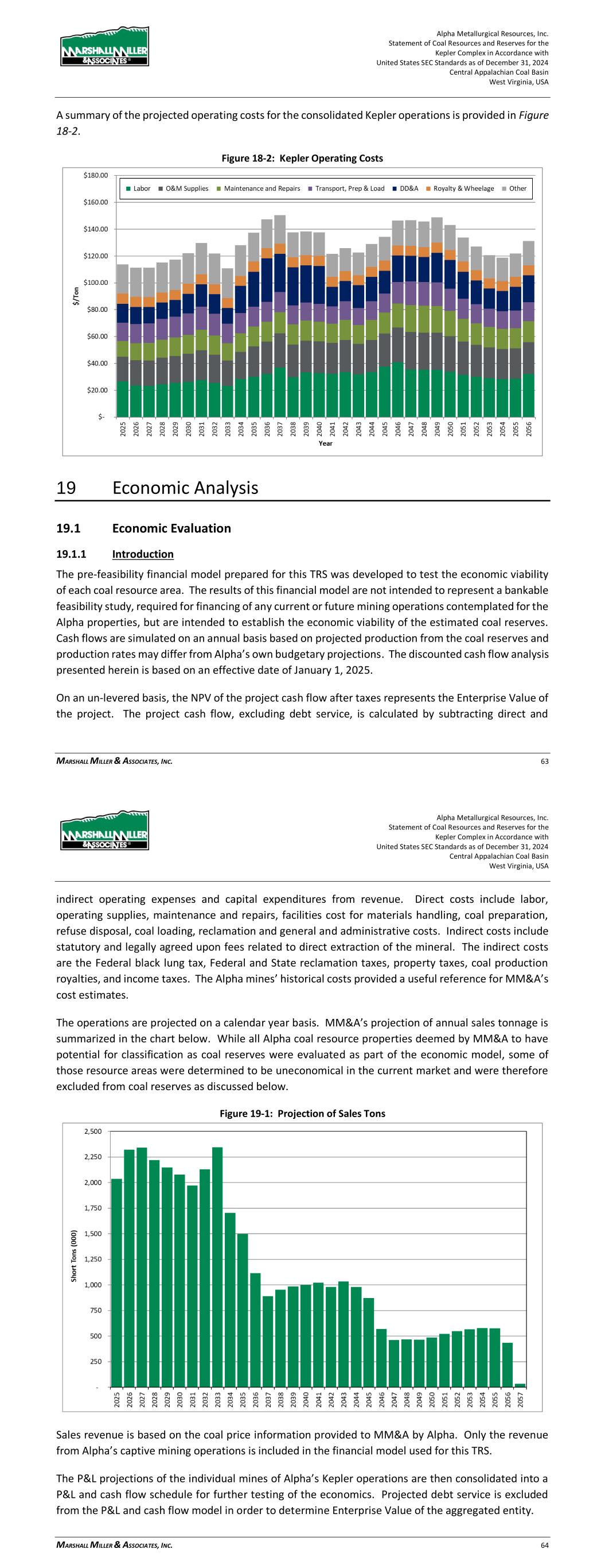 Alpha Metallurgical Resources, Inc. Statement of Coal Resources and Reserves for the Kepler Complex in Accordance with United States SEC Standards as of December 31, 2024 Central Appalachian Coal Basin West Virginia, USA MARSHALL MILLER & ASSOCIATES, INC. 63 A summary of the projected operating costs for the consolidated Kepler operations is provided in Figure 18-2. Figure 18-2: Kepler Operating Costs 19 Economic Analysis 19.1 Economic Evaluation 19.1.1 Introduction The pre-feasibility financial model prepared for this TRS was developed to test the economic viability of each coal resource area. The results of this financial model are not intended to represent a bankable feasibility study, required for financing of any current or future mining operations contemplated for the Alpha properties, but are intended to establish the economic viability of the estimated coal reserves. Cash flows are simulated on an annual basis based on projected production from the coal reserves and production rates may differ from Alpha’s own budgetary projections. The discounted cash flow analysis presented herein is based on an effective date of January 1, 2025. On an un-levered basis, the NPV of the project cash flow after taxes represents the Enterprise Value of the project. The project cash flow, excluding debt service, is calculated by subtracting direct and Alpha Metallurgical Resources, Inc. Statement of Coal Resources and Reserves for the Kepler Complex in Accordance with United States SEC Standards as of December 31, 2024 Central Appalachian Coal Basin West Virginia, USA MARSHALL MILLER & ASSOCIATES, INC. 64 indirect operating expenses and capital expenditures from revenue. Direct costs include labor, operating supplies, maintenance and repairs, facilities cost for materials handling, coal preparation, refuse disposal, coal loading, reclamation and general and administrative costs. Indirect costs include statutory and legally agreed upon fees related to direct extraction of the mineral. The indirect costs are the Federal black lung tax, Federal and State reclamation taxes, property taxes, coal production royalties, and income taxes. The Alpha mines’ historical costs provided a useful reference for MM&A’s cost estimates. The operations are projected on a calendar year basis. MM&A’s projection of annual sales tonnage is summarized in the chart below. While all Alpha coal resource properties deemed by MM&A to have potential for classification as coal reserves were evaluated as part of the economic model, some of those resource areas were determined to be uneconomical in the current market and were therefore excluded from coal reserves as discussed below. Figure 19-1: Projection of Sales Tons Sales revenue is based on the coal price information provided to MM&A by Alpha. Only the revenue from Alpha’s captive mining operations is included in the financial model used for this TRS. The P&L projections of the individual mines of Alpha’s Kepler operations are then consolidated into a P&L and cash flow schedule for further testing of the economics. Projected debt service is excluded from the P&L and cash flow model in order to determine Enterprise Value of the aggregated entity.