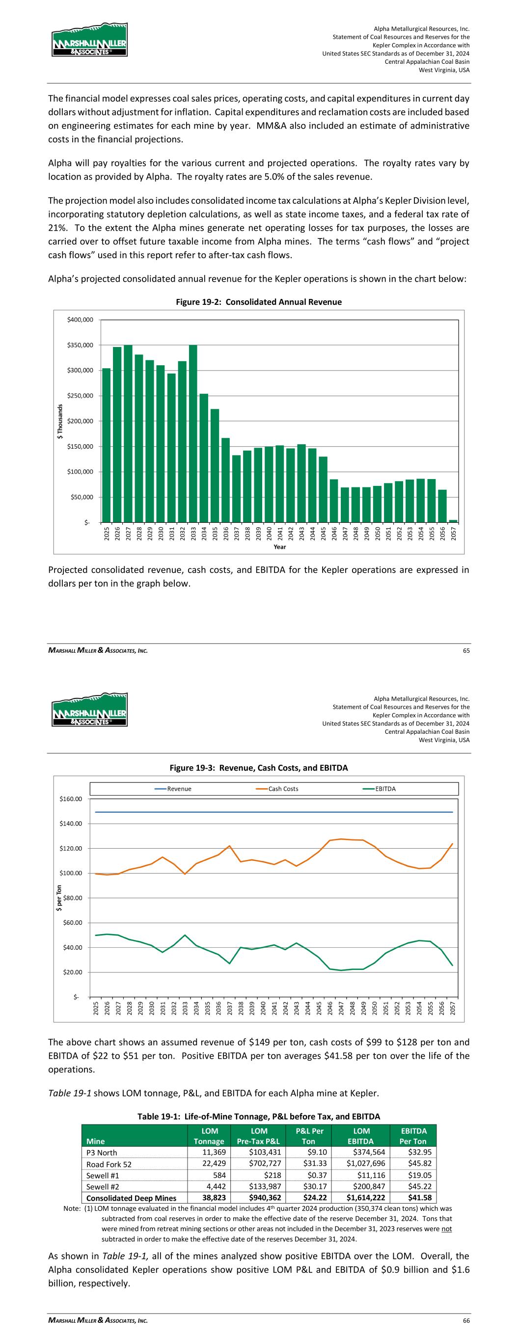 Alpha Metallurgical Resources, Inc. Statement of Coal Resources and Reserves for the Kepler Complex in Accordance with United States SEC Standards as of December 31, 2024 Central Appalachian Coal Basin West Virginia, USA MARSHALL MILLER & ASSOCIATES, INC. 65 The financial model expresses coal sales prices, operating costs, and capital expenditures in current day dollars without adjustment for inflation. Capital expenditures and reclamation costs are included based on engineering estimates for each mine by year. MM&A also included an estimate of administrative costs in the financial projections. Alpha will pay royalties for the various current and projected operations. The royalty rates vary by location as provided by Alpha. The royalty rates are 5.0% of the sales revenue. The projection model also includes consolidated income tax calculations at Alpha’s Kepler Division level, incorporating statutory depletion calculations, as well as state income taxes, and a federal tax rate of 21%. To the extent the Alpha mines generate net operating losses for tax purposes, the losses are carried over to offset future taxable income from Alpha mines. The terms “cash flows” and “project cash flows” used in this report refer to after-tax cash flows. Alpha’s projected consolidated annual revenue for the Kepler operations is shown in the chart below: Figure 19-2: Consolidated Annual Revenue Projected consolidated revenue, cash costs, and EBITDA for the Kepler operations are expressed in dollars per ton in the graph below. Alpha Metallurgical Resources, Inc. Statement of Coal Resources and Reserves for the Kepler Complex in Accordance with United States SEC Standards as of December 31, 2024 Central Appalachian Coal Basin West Virginia, USA MARSHALL MILLER & ASSOCIATES, INC. 66 Figure 19-3: Revenue, Cash Costs, and EBITDA The above chart shows an assumed revenue of $149 per ton, cash costs of $99 to $128 per ton and EBITDA of $22 to $51 per ton. Positive EBITDA per ton averages $41.58 per ton over the life of the operations. Table 19-1 shows LOM tonnage, P&L, and EBITDA for each Alpha mine at Kepler. Table 19-1: Life-of-Mine Tonnage, P&L before Tax, and EBITDA Mine LOM Tonnage LOM Pre-Tax P&L P&L Per Ton LOM EBITDA EBITDA Per Ton P3 North 11,369 $103,431 $9.10 $374,564 $32.95 Road Fork 52 22,429 $702,727 $31.33 $1,027,696 $45.82 Sewell #1 584 $218 $0.37 $11,116 $19.05 Sewell #2 4,442 $133,987 $30.17 $200,847 $45.22 Consolidated Deep Mines 38,823 $940,362 $24.22 $1,614,222 $41.58 Note: (1) LOM tonnage evaluated in the financial model includes 4th quarter 2024 production (350,374 clean tons) which was subtracted from coal reserves in order to make the effective date of the reserve December 31, 2024. Tons that were mined from retreat mining sections or other areas not included in the December 31, 2023 reserves were not subtracted in order to make the effective date of the reserves December 31, 2024. As shown in Table 19-1, all of the mines analyzed show positive EBITDA over the LOM. Overall, the Alpha consolidated Kepler operations show positive LOM P&L and EBITDA of $0.9 billion and $1.6 billion, respectively.