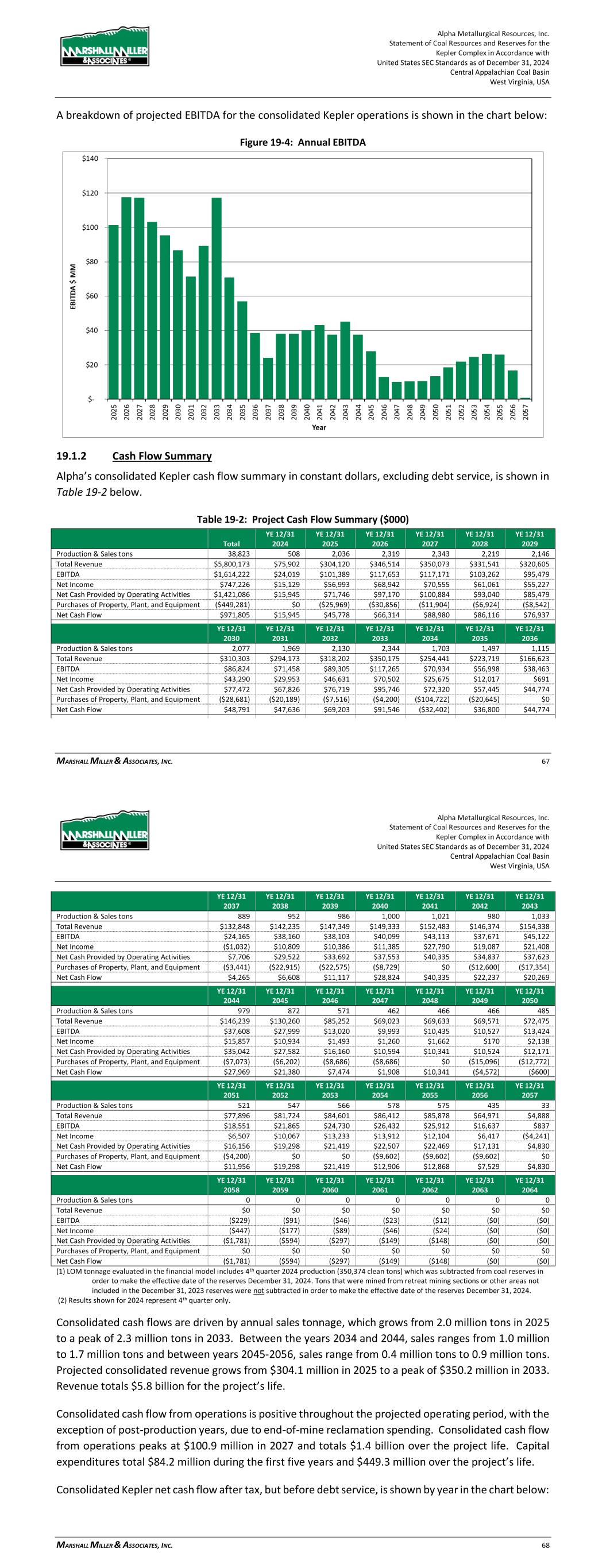 Alpha Metallurgical Resources, Inc. Statement of Coal Resources and Reserves for the Kepler Complex in Accordance with United States SEC Standards as of December 31, 2024 Central Appalachian Coal Basin West Virginia, USA MARSHALL MILLER & ASSOCIATES, INC. 67 A breakdown of projected EBITDA for the consolidated Kepler operations is shown in the chart below: Figure 19-4: Annual EBITDA 19.1.2 Cash Flow Summary Alpha’s consolidated Kepler cash flow summary in constant dollars, excluding debt service, is shown in Table 19-2 below. Table 19-2: Project Cash Flow Summary ($000) YE 12/31 YE 12/31 YE 12/31 YE 12/31 YE 12/31 YE 12/31 Total 2024 2025 2026 2027 2028 2029 Production & Sales tons 38,823 508 2,036 2,319 2,343 2,219 2,146 Total Revenue $5,800,173 $75,902 $304,120 $346,514 $350,073 $331,541 $320,605 EBITDA $1,614,222 $24,019 $101,389 $117,653 $117,171 $103,262 $95,479 Net Income $747,226 $15,129 $56,993 $68,942 $70,555 $61,061 $55,227 Net Cash Provided by Operating Activities $1,421,086 $15,945 $71,746 $97,170 $100,884 $93,040 $85,479 Purchases of Property, Plant, and Equipment ($449,281) $0 ($25,969) ($30,856) ($11,904) ($6,924) ($8,542) Net Cash Flow $971,805 $15,945 $45,778 $66,314 $88,980 $86,116 $76,937 YE 12/31 YE 12/31 YE 12/31 YE 12/31 YE 12/31 YE 12/31 YE 12/31 2030 2031 2032 2033 2034 2035 2036 Production & Sales tons 2,077 1,969 2,130 2,344 1,703 1,497 1,115 Total Revenue $310,303 $294,173 $318,202 $350,175 $254,441 $223,719 $166,623 EBITDA $86,824 $71,458 $89,305 $117,265 $70,934 $56,998 $38,463 Net Income $43,290 $29,953 $46,631 $70,502 $25,675 $12,017 $691 Net Cash Provided by Operating Activities $77,472 $67,826 $76,719 $95,746 $72,320 $57,445 $44,774 Purchases of Property, Plant, and Equipment ($28,681) ($20,189) ($7,516) ($4,200) ($104,722) ($20,645) $0 Net Cash Flow $48,791 $47,636 $69,203 $91,546 ($32,402) $36,800 $44,774 Alpha Metallurgical Resources, Inc. Statement of Coal Resources and Reserves for the Kepler Complex in Accordance with United States SEC Standards as of December 31, 2024 Central Appalachian Coal Basin West Virginia, USA MARSHALL MILLER & ASSOCIATES, INC. 68 YE 12/31 YE 12/31 YE 12/31 YE 12/31 YE 12/31 YE 12/31 YE 12/31 2037 2038 2039 2040 2041 2042 2043 Production & Sales tons 889 952 986 1,000 1,021 980 1,033 Total Revenue $132,848 $142,235 $147,349 $149,333 $152,483 $146,374 $154,338 EBITDA $24,165 $38,160 $38,103 $40,099 $43,113 $37,671 $45,122 Net Income ($1,032) $10,809 $10,386 $11,385 $27,790 $19,087 $21,408 Net Cash Provided by Operating Activities $7,706 $29,522 $33,692 $37,553 $40,335 $34,837 $37,623 Purchases of Property, Plant, and Equipment ($3,441) ($22,915) ($22,575) ($8,729) $0 ($12,600) ($17,354) Net Cash Flow $4,265 $6,608 $11,117 $28,824 $40,335 $22,237 $20,269 YE 12/31 YE 12/31 YE 12/31 YE 12/31 YE 12/31 YE 12/31 YE 12/31 2044 2045 2046 2047 2048 2049 2050 Production & Sales tons 979 872 571 462 466 466 485 Total Revenue $146,239 $130,260 $85,252 $69,023 $69,633 $69,571 $72,475 EBITDA $37,608 $27,999 $13,020 $9,993 $10,435 $10,527 $13,424 Net Income $15,857 $10,934 $1,493 $1,260 $1,662 $170 $2,138 Net Cash Provided by Operating Activities $35,042 $27,582 $16,160 $10,594 $10,341 $10,524 $12,171 Purchases of Property, Plant, and Equipment ($7,073) ($6,202) ($8,686) ($8,686) $0 ($15,096) ($12,772) Net Cash Flow $27,969 $21,380 $7,474 $1,908 $10,341 ($4,572) ($600) YE 12/31 YE 12/31 YE 12/31 YE 12/31 YE 12/31 YE 12/31 YE 12/31 2051 2052 2053 2054 2055 2056 2057 Production & Sales tons 521 547 566 578 575 435 33 Total Revenue $77,896 $81,724 $84,601 $86,412 $85,878 $64,971 $4,888 EBITDA $18,551 $21,865 $24,730 $26,432 $25,912 $16,637 $837 Net Income $6,507 $10,067 $13,233 $13,912 $12,104 $6,417 ($4,241) Net Cash Provided by Operating Activities $16,156 $19,298 $21,419 $22,507 $22,469 $17,131 $4,830 Purchases of Property, Plant, and Equipment ($4,200) $0 $0 ($9,602) ($9,602) ($9,602) $0 Net Cash Flow $11,956 $19,298 $21,419 $12,906 $12,868 $7,529 $4,830 YE 12/31 YE 12/31 YE 12/31 YE 12/31 YE 12/31 YE 12/31 YE 12/31 2058 2059 2060 2061 2062 2063 2064 Production & Sales tons 0 0 0 0 0 0 0 Total Revenue $0 $0 $0 $0 $0 $0 $0 EBITDA ($229) ($91) ($46) ($23) ($12) ($0) ($0) Net Income ($447) ($177) ($89) ($46) ($24) ($0) ($0) Net Cash Provided by Operating Activities ($1,781) ($594) ($297) ($149) ($148) ($0) ($0) Purchases of Property, Plant, and Equipment $0 $0 $0 $0 $0 $0 $0 Net Cash Flow ($1,781) ($594) ($297) ($149) ($148) ($0) ($0) (1) LOM tonnage evaluated in the financial model includes 4th quarter 2024 production (350,374 clean tons) which was subtracted from coal reserves in order to make the effective date of the reserves December 31, 2024. Tons that were mined from retreat mining sections or other areas not included in the December 31, 2023 reserves were not subtracted in order to make the effective date of the reserves December 31, 2024. (2) Results shown for 2024 represent 4th quarter only. Consolidated cash flows are driven by annual sales tonnage, which grows from 2.0 million tons in 2025 to a peak of 2.3 million tons in 2033. Between the years 2034 and 2044, sales ranges from 1.0 million to 1.7 million tons and between years 2045-2056, sales range from 0.4 million tons to 0.9 million tons. Projected consolidated revenue grows from $304.1 million in 2025 to a peak of $350.2 million in 2033. Revenue totals $5.8 billion for the project’s life. Consolidated cash flow from operations is positive throughout the projected operating period, with the exception of post-production years, due to end-of-mine reclamation spending. Consolidated cash flow from operations peaks at $100.9 million in 2027 and totals $1.4 billion over the project life. Capital expenditures total $84.2 million during the first five years and $449.3 million over the project’s life. Consolidated Kepler net cash flow after tax, but before debt service, is shown by year in the chart below: