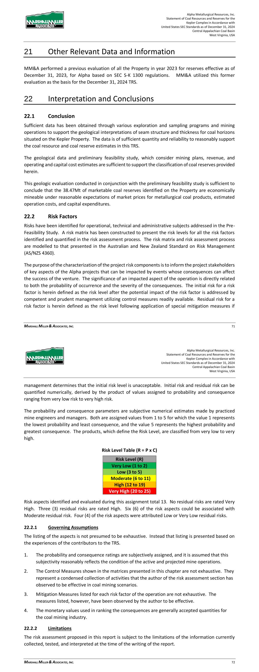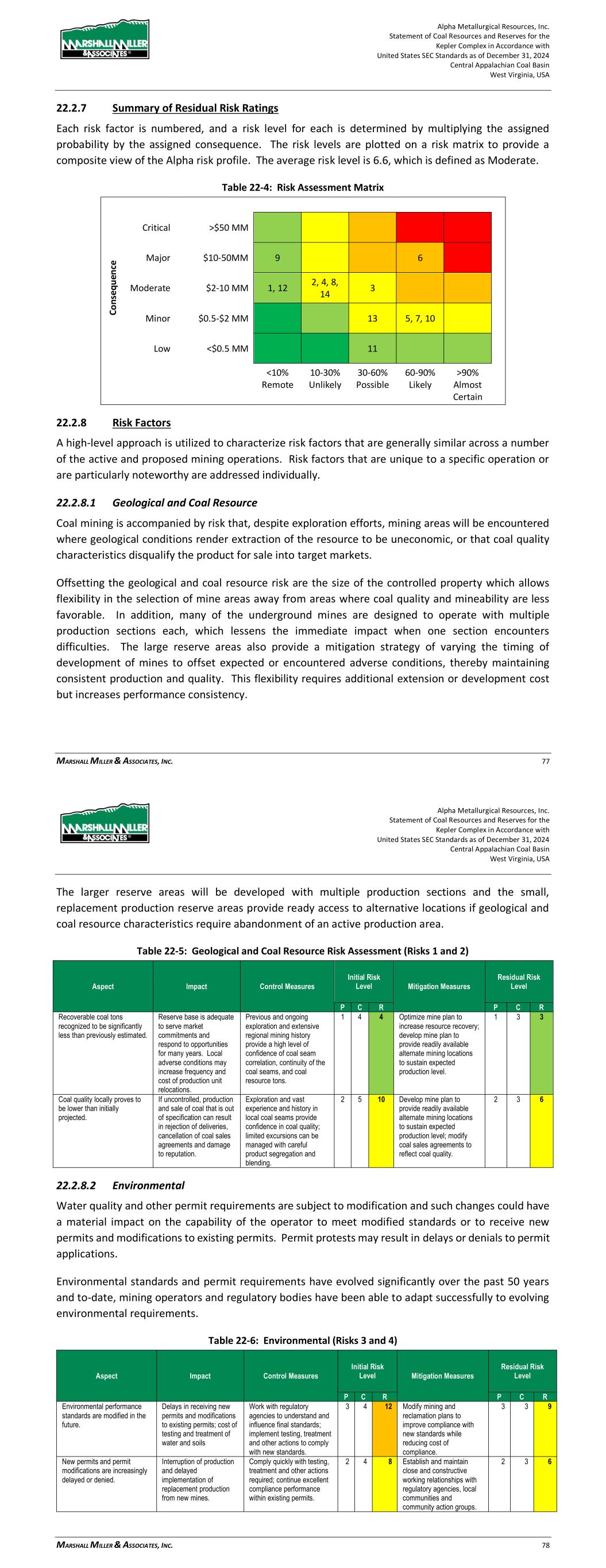 Alpha Metallurgical Resources, Inc. Statement of Coal Resources and Reserves for the Kepler Complex in Accordance with United States SEC Standards as of December 31, 2024 Central Appalachian Coal Basin West Virginia, USA MARSHALL MILLER & ASSOCIATES, INC. 77 22.2.7 Summary of Residual Risk Ratings Each risk factor is numbered, and a risk level for each is determined by multiplying the assigned probability by the assigned consequence. The risk levels are plotted on a risk matrix to provide a composite view of the Alpha risk profile. The average risk level is 6.6, which is defined as Moderate. Table 22-4: Risk Assessment Matrix C o n se q u en ce Critical >$50 MM Major $10-50MM 9 6 Moderate $2-10 MM 1, 12 2, 4, 8, 14 3 Minor $0.5-$2 MM 13 5, 7, 10 Low <$0.5 MM 11 <10% 10-30% 30-60% 60-90% >90% Remote Unlikely Possible Likely Almost Certain 22.2.8 Risk Factors A high-level approach is utilized to characterize risk factors that are generally similar across a number of the active and proposed mining operations. Risk factors that are unique to a specific operation or are particularly noteworthy are addressed individually. 22.2.8.1 Geological and Coal Resource Coal mining is accompanied by risk that, despite exploration efforts, mining areas will be encountered where geological conditions render extraction of the resource to be uneconomic, or that coal quality characteristics disqualify the product for sale into target markets. Offsetting the geological and coal resource risk are the size of the controlled property which allows flexibility in the selection of mine areas away from areas where coal quality and mineability are less favorable. In addition, many of the underground mines are designed to operate with multiple production sections each, which lessens the immediate impact when one section encounters difficulties. The large reserve areas also provide a mitigation strategy of varying the timing of development of mines to offset expected or encountered adverse conditions, thereby maintaining consistent production and quality. This flexibility requires additional extension or development cost but increases performance consistency. Alpha Metallurgical Resources, Inc. Statement of Coal Resources and Reserves for the Kepler Complex in Accordance with United States SEC Standards as of December 31, 2024 Central Appalachian Coal Basin West Virginia, USA MARSHALL MILLER & ASSOCIATES, INC. 78 The larger reserve areas will be developed with multiple production sections and the small, replacement production reserve areas provide ready access to alternative locations if geological and coal resource characteristics require abandonment of an active production area. Table 22-5: Geological and Coal Resource Risk Assessment (Risks 1 and 2) Aspect Impact Control Measures Initial Risk Level Mitigation Measures Residual Risk Level P C R P C R Recoverable coal tons recognized to be significantly less than previously estimated. Reserve base is adequate to serve market commitments and respond to opportunities for many years. Local adverse conditions may increase frequency and cost of production unit relocations. Previous and ongoing exploration and extensive regional mining history provide a high level of confidence of coal seam correlation, continuity of the coal seams, and coal resource tons. 1 4 4 Optimize mine plan to increase resource recovery; develop mine plan to provide readily available alternate mining locations to sustain expected production level. 1 3 3 Coal quality locally proves to be lower than initially projected. If uncontrolled, production and sale of coal that is out of specification can result in rejection of deliveries, cancellation of coal sales agreements and damage to reputation. Exploration and vast experience and history in local coal seams provide confidence in coal quality; limited excursions can be managed with careful product segregation and blending. 2 5 10 Develop mine plan to provide readily available alternate mining locations to sustain expected production level; modify coal sales agreements to reflect coal quality. 2 3 6 22.2.8.2 Environmental Water quality and other permit requirements are subject to modification and such changes could have a material impact on the capability of the operator to meet modified standards or to receive new permits and modifications to existing permits. Permit protests may result in delays or denials to permit applications. Environmental standards and permit requirements have evolved significantly over the past 50 years and to-date, mining operators and regulatory bodies have been able to adapt successfully to evolving environmental requirements. Table 22-6: Environmental (Risks 3 and 4) Aspect Impact Control Measures Initial Risk Level Mitigation Measures Residual Risk Level P C R P C R Environmental performance standards are modified in the future. Delays in receiving new permits and modifications to existing permits; cost of testing and treatment of water and soils Work with regulatory agencies to understand and influence final standards; implement testing, treatment and other actions to comply with new standards. 3 4 12 Modify mining and reclamation plans to improve compliance with new standards while reducing cost of compliance. 3 3 9 New permits and permit modifications are increasingly delayed or denied. Interruption of production and delayed implementation of replacement production from new mines. Comply quickly with testing, treatment and other actions required; continue excellent compliance performance within existing permits. 2 4 8 Establish and maintain close and constructive working relationships with regulatory agencies, local communities and community action groups. 2 3 6