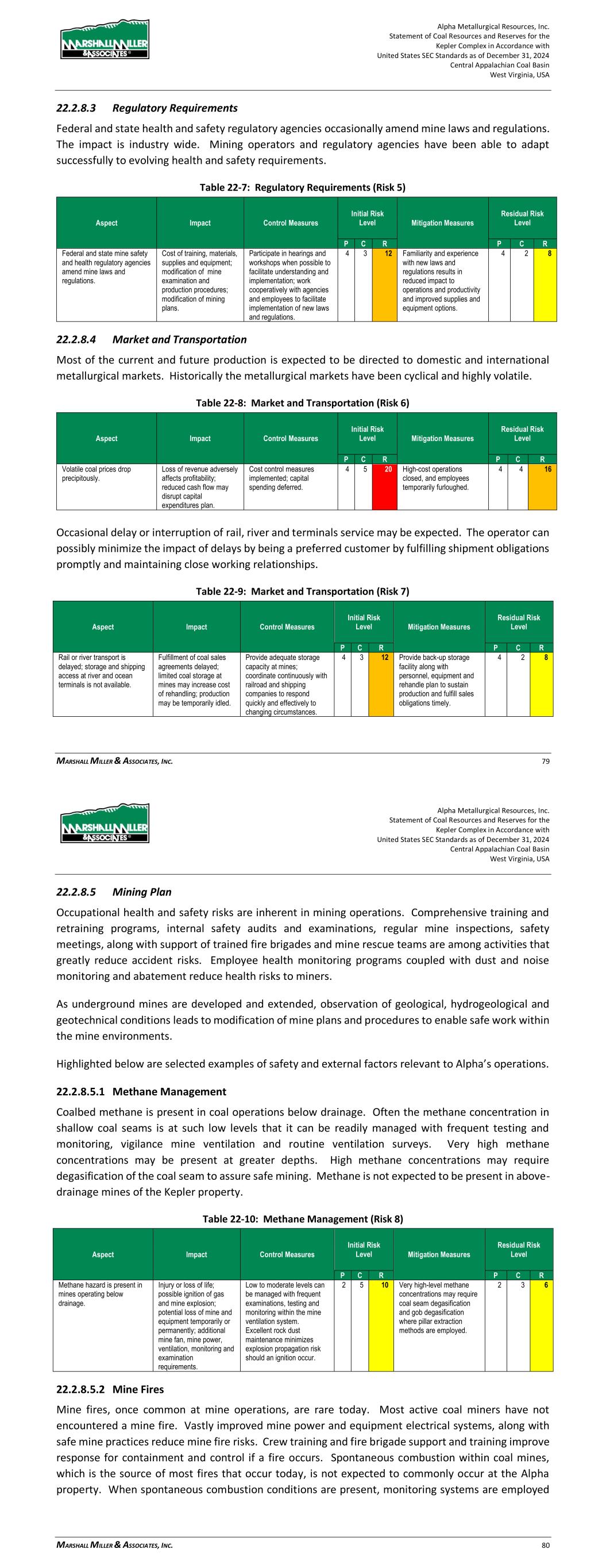 Alpha Metallurgical Resources, Inc. Statement of Coal Resources and Reserves for the Kepler Complex in Accordance with United States SEC Standards as of December 31, 2024 Central Appalachian Coal Basin West Virginia, USA MARSHALL MILLER & ASSOCIATES, INC. 81 for early detection and mine plans are designed to facilitate isolation, containment and rapid extinguishment. Table 22-11: Mine Fires (Risk 9) Aspect Impact Control Measures Initial Risk Level Mitigation Measures Residual Risk Level P C R P C R Mine fire at underground operation or plant stockpile fire. Injury or loss of life; potential loss of mine temporarily or permanently; damage to equipment and mine infrastructure. Inspection and maintenance of mine power, equipment and mine infrastructure; good housekeeping; frequent examination of conveyor belt entries; prompt removal of accumulations of combustible materials. 1 5 5 If spontaneous combustion conditions are present, enhanced monitoring and examination procedures will be implemented; mine design will incorporate features to facilitate isolation, containment and extinguishment of spontaneous combustion locations. 1 4 4 22.2.8.5.3 Ground Control Underground mining exposes miners to the risks of roof falls and rib rolls. Ground control-based risks can be mitigated through effective roof control plans which are supplemented with a strong understanding of future geotechnical conditions. Foremen and crews should be trained to examine the roof, rib and floor conditions and identify pending and immediate hazards. Multiple publicly available software programs can be used to assess pillar sizing and stability. Table 22-12: Ground Control (Risk 10) Aspect Impact Control Measures Initial Risk Level Mitigation Measures Residual Risk Level P C R P C R Ground control issues cause roof failures, rib rolls, floor heave, etc. Injury or loss of life; catastrophic damage to equipment; production interruption. Regular inspection for change and signs of failure. Dynamic design of roof control plan and safety measures to honor observed conditions and exploration- based information; conservative pillar design. 4 3 12 Multiple operating sections to mitigate any lost production; availability of new working areas in case abandonment of section is required; availability of alternative roof control technologies in case of abrupt changes in mining conditions. 4 2 8 22.2.8.5.4 Availability of Supplies and Equipment The industry has periodically experienced difficulty receiving timely delivery of mine supplies and equipment. Availability issues often accompanied boom periods for coal demand. Any future delivery of supplies and equipment delays are expected to be temporary with limited impact on production. Alpha Metallurgical Resources, Inc. Statement of Coal Resources and Reserves for the Kepler Complex in Accordance with United States SEC Standards as of December 31, 2024 Central Appalachian Coal Basin West Virginia, USA MARSHALL MILLER & ASSOCIATES, INC. 82 Table 22-13: Availability of Supplies and Equipment (Risk 11) Aspect Impact Control Measures Initial Risk Level Mitigation Measures Residual Risk Level P C R P C R Disruption of availability for supplies and equipment. Temporary interruption of production. Force majeure provision in coal sales agreements to limit liability for delayed or lost sales. 3 2 6 Work closely with customers to assure delayed coal delivery rather than cancelled sales; monitor external conditions and increase inventory of critical supplies; accelerate delivery of equipment when possible. 3 1 3 22.2.8.5.5 Labor Work stoppage due to labor protests are considered to be unlikely and accompanied by limited impact should it occur. Strong employee relations and communications limit the exposure to outside protesters. Loss of supervisors and skilled employees to retirement is inevitable; the impact can be lessened with succession planning, training and mentorship of new employees. Table 22-14: Labor – Work Stoppage (Risk 12) Aspect Impact Control Measures Initial Risk Level Mitigation Measures Residual Risk Level P C R P C R Work stoppage due to slowdowns or secondary boycott activity. Loss of production and coal sales; damaged customer and employee relations; reputation loss. Maintain excellent employee relations and communications; maintain frequent customer communications. 2 3 6 Develop plan for employee communications and legal support to minimize impact of secondary boycott activities. 1 3 3 Table 22-15: Labor – Retirement (Risk 13) Aspect Impact Control Measures Initial Risk Level Mitigation Measures Residual Risk Level P C R P C R Retirement of supervisors and skilled employees. Loss of leadership and critical skills to sustain high levels of safety, maintenance and productivity. Monitor demographics closely and maintain communications with employees who are approaching retirement age; maintain employee selection and training programs. 3 3 9 Maintain selection of candidates and implementation of in-house or third-party training for electricians and mechanics; develop employee mentoring program. 3 2 6 22.2.8.6 Comprehensive Health and Safety While largely incorporated in mine plan-based risk factors, effective health and safety programs reduce the risk of accidents, associated loss of production and fines. Currently, coal mining and processing