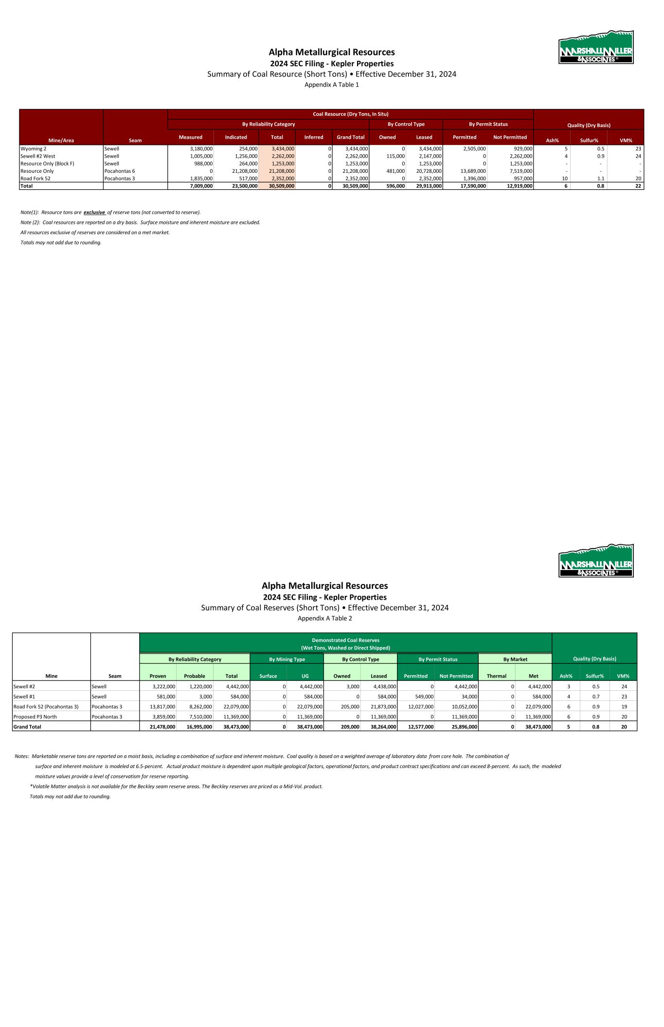 Alpha Metallurgical Resources 2024 SEC Filing - Kepler Properties Summary of Coal Resource (Short Tons) • Effective December 31, 2024 Appendix A Table 1 Mine/Area Seam Measured Indicated Total Inferred Grand Total Owned Leased Permitted Not Permitted Ash% Sulfur% VM% Wyoming 2 Sewell 3,180,000 254,000 3,434,000 0 3,434,000 0 3,434,000 2,505,000 929,000 5 0.5 23 Sewell #2 West Sewell 1,005,000 1,256,000 2,262,000 0 2,262,000 115,000 2,147,000 0 2,262,000 4 0.9 24 Resource Only (Block F) Sewell 988,000 264,000 1,253,000 0 1,253,000 0 1,253,000 0 1,253,000 - - - Resource Only Pocahontas 6 0 21,208,000 21,208,000 0 21,208,000 481,000 20,728,000 13,689,000 7,519,000 - - - Road Fork 52 Pocahontas 3 1,835,000 517,000 2,352,000 0 2,352,000 0 2,352,000 1,396,000 957,000 10 1.1 20 Total 7,009,000 23,500,000 30,509,000 0 30,509,000 596,000 29,913,000 17,590,000 12,919,000 6 0.8 22 Note(1): Resource tons are exclusive of reserve tons (not converted to reserve). Note (2): Coal resources are reported on a dry basis. Surface moisture and inherent moisture are excluded. All resources exclusive of reserves are considered on a met market. Totals may not add due to rounding. Quality (Dry Basis) Coal Resource (Dry Tons, In Situ) By Reliability Category By Control Type By Permit Status Alpha Metallurgical Resources 2024 SEC Filing - Kepler Properties Summary of Coal Reserves (Short Tons) • Effective December 31, 2024 Appendix A Table 2 By Reliability Category By Mining Type By Control Type By Permit Status By Market Mine Seam Proven Probable Total Surface UG Owned Leased Permitted Not Permitted Thermal Met Ash% Sulfur% VM% Sewell #2 Sewell 3,222,000 1,220,000 4,442,000 0 4,442,000 3,000 4,438,000 0 4,442,000 0 4,442,000 3 0.5 24 Sewell #1 Sewell 581,000 3,000 584,000 0 584,000 0 584,000 549,000 34,000 0 584,000 4 0.7 23 Road Fork 52 (Pocahontas 3) Pocahontas 3 13,817,000 8,262,000 22,079,000 0 22,079,000 205,000 21,873,000 12,027,000 10,052,000 0 22,079,000 6 0.9 19 Proposed P3 North Pocahontas 3 3,859,000 7,510,000 11,369,000 0 11,369,000 0 11,369,000 0 11,369,000 0 11,369,000 6 0.9 20 Grand Total 21,478,000 16,995,000 38,473,000 0 38,473,000 209,000 38,264,000 12,577,000 25,896,000 0 38,473,000 5 0.8 20 Notes: Marketable reserve tons are reported on a moist basis, including a combination of surface and inherent moisture. Coal quality is based on a weighted average of laboratory data from core hole. The combination of surface and inherent moisture is modeled at 6.5-percent. Actual product moisture is dependent upon multiple geological factors, operational factors, and product contract specifications and can exceed 8-percent. As such, the modeled moisture values provide a level of conservatism for reserve reporting. *Volatile Matter analysis is not available for the Beckley seam reserve areas. The Beckley reserves are priced as a Mid-Vol. product. Totals may not add due to rounding. Quality (Dry Basis) Demonstrated Coal Reserves (Wet Tons, Washed or Direct Shipped)