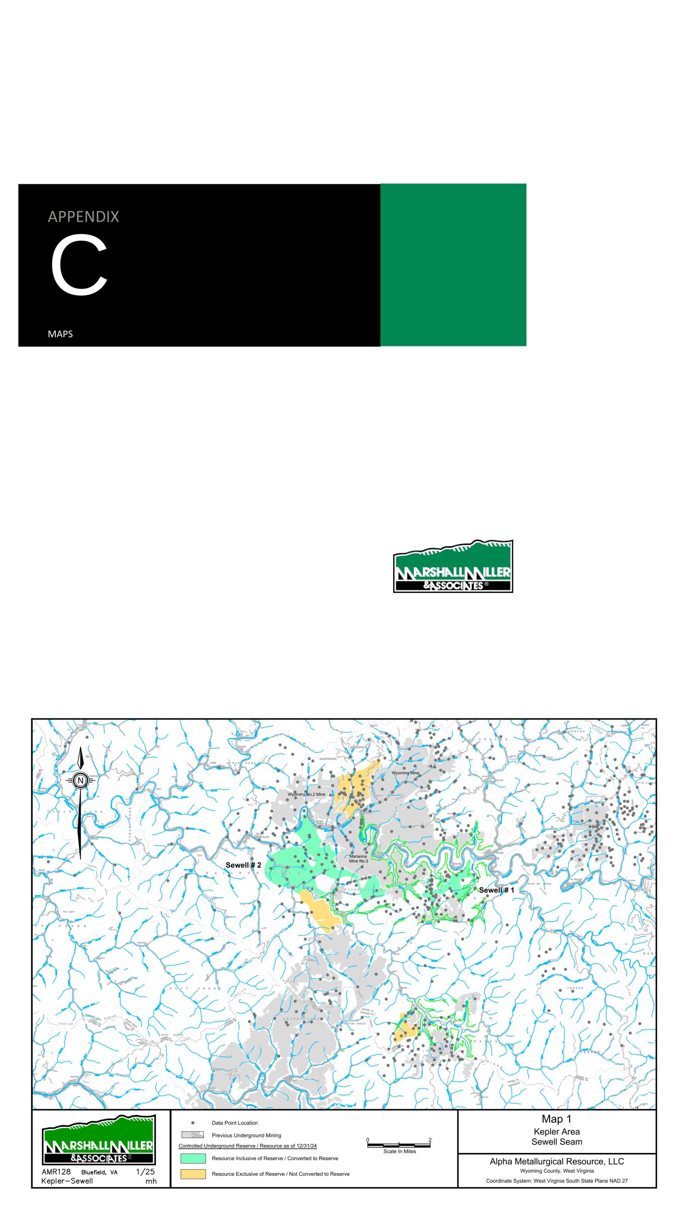 APPENDIX C MAPS 11-1-18 R N STE WE GRADE AND R O A D R A IL OLD FO LK NOR UNNEL T Park Trailer Marianna Mine No.3 Wyoming Mine Strip OLD PORTALS 11-9-18 12-1-18 T panel U panel Sealed Area Sealed Area Sealed Area Sealed Area Wyoming No.2 Mine ER N ST WE O LD AN D NO RF O LK Sewell # 2 Sewell # 1 2 Scale In Miles 0 Data Point Location Map 1 Kepler Area Sewell Seam Alpha Metallurgical Resource, LLC Wyoming County, West Virginia Coordinate System: West Virginia South State Plane NAD 27 Controlled Underground Reserve / Resource as of 12/31/24 Previous Underground Mining N Resource Exclusive of Reserve / Not Converted to Reserve Resource Inclusive of Reserve / Converted to Reserve