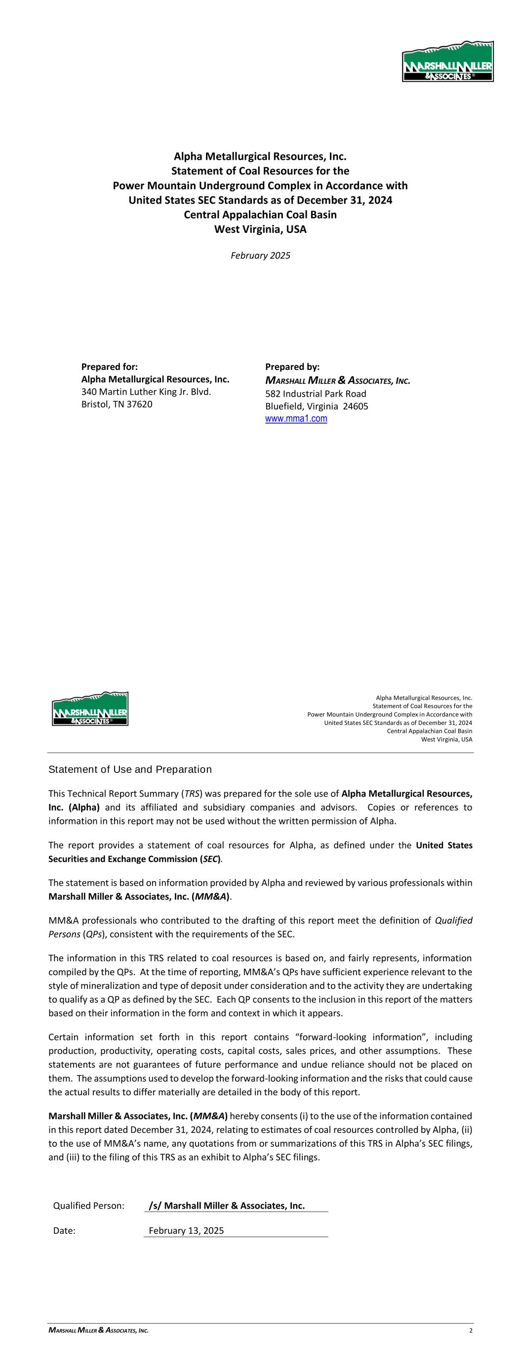 Alpha Metallurgical Resources, Inc. Statement of Coal Resources for the Power Mountain Underground Complex in Accordance with United States SEC Standards as of December 31, 2024 Central Appalachian Coal Basin West Virginia, USA February 2025 Prepared for: Alpha Metallurgical Resources, Inc. 340 Martin Luther King Jr. Blvd. Bristol, TN 37620 Prepared by: MARSHALL MILLER & ASSOCIATES, INC. 582 Industrial Park Road Bluefield, Virginia 24605 www.mma1.com Alpha Metallurgical Resources, Inc. Statement of Coal Resources for the Power Mountain Underground Complex in Accordance with United States SEC Standards as of December 31, 2024 Central Appalachian Coal Basin West Virginia, USA MARSHALL MILLER & ASSOCIATES, INC. 2 Statement of Use and Preparation This Technical Report Summary (TRS) was prepared for the sole use of Alpha Metallurgical Resources, Inc. (Alpha) and its affiliated and subsidiary companies and advisors. Copies or references to information in this report may not be used without the written permission of Alpha. The report provides a statement of coal resources for Alpha, as defined under the United States Securities and Exchange Commission (SEC). The statement is based on information provided by Alpha and reviewed by various professionals within Marshall Miller & Associates, Inc. (MM&A). MM&A professionals who contributed to the drafting of this report meet the definition of Qualified Persons (QPs), consistent with the requirements of the SEC. The information in this TRS related to coal resources is based on, and fairly represents, information compiled by the QPs. At the time of reporting, MM&A’s QPs have sufficient experience relevant to the style of mineralization and type of deposit under consideration and to the activity they are undertaking to qualify as a QP as defined by the SEC. Each QP consents to the inclusion in this report of the matters based on their information in the form and context in which it appears. Certain information set forth in this report contains “forward-looking information”, including production, productivity, operating costs, capital costs, sales prices, and other assumptions. These statements are not guarantees of future performance and undue reliance should not be placed on them. The assumptions used to develop the forward-looking information and the risks that could cause the actual results to differ materially are detailed in the body of this report. Marshall Miller & Associates, Inc. (MM&A) hereby consents (i) to the use of the information contained in this report dated December 31, 2024, relating to estimates of coal resources controlled by Alpha, (ii) to the use of MM&A’s name, any quotations from or summarizations of this TRS in Alpha’s SEC filings, and (iii) to the filing of this TRS as an exhibit to Alpha’s SEC filings. Qualified Person: /s/ Marshall Miller & Associates, Inc. Date: February 13, 2025