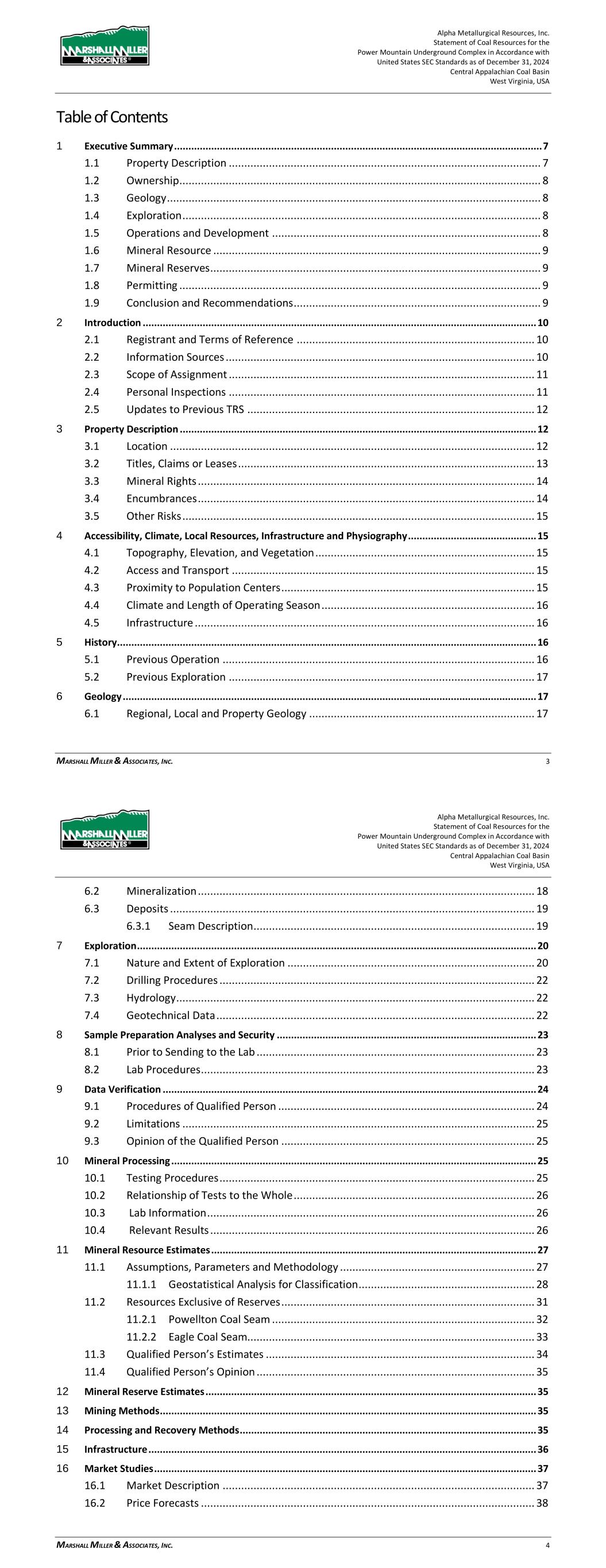 Alpha Metallurgical Resources, Inc. Statement of Coal Resources for the Power Mountain Underground Complex in Accordance with United States SEC Standards as of December 31, 2024 Central Appalachian Coal Basin West Virginia, USA MARSHALL MILLER & ASSOCIATES, INC. 5 17 Environmental Studies, Permitting and Plans ....................................................................................... 38 17.1 Environmental Permit Requirements and Status ......................................................... 38 18 Capital and Operating Costs .................................................................................................................. 40 19 Economic Analysis ................................................................................................................................. 40 20 Adjacent Properties .............................................................................................................................. 40 21 Other Relevant Data and Information ................................................................................................... 40 22 Interpretation and Conclusions ............................................................................................................. 40 23 Recommendations ................................................................................................................................ 41 24 References ............................................................................................................................................ 41 25 Reliance on Information Provided by Registrant ................................................................................... 41 FIGURES (IN REPORT) Figure 1-1: Property Location Map ...................................................................................................... 7 Figure 3-1: Property Location Map .................................................................................................... 13 Figure 6-1: Extent of Appalachian Basin (modified after USGS 1625-C) .............................................. 18 Figure 6-2: Power Mountain Generalized Stratigraphic Column ........................................................ 19 Figure 7-1: Power Mountain Cross-Section ........................................................................................ 21 Figure 11-1: Histogram of the Total Seam Thickness for the Powellton Seam Present in the Property .......................................................................................................................... 29 Figure 11-2: Scatter Plot of the Total Seam Thickness for the Powellton Seam Present in the Property .......................................................................................................................... 29 Figure 11-3: Variogram of the Total Seam Thickness for the Powellton Seam .................................... 30 Figure 11-4: Result of DHSA for the Powellton Seam Present in the Property .................................... 31 Figure 11-5: Power Mountain Coal Reserves ..................................................................................... 32 Figure 11-6: Results of Initial Economic Assessment .......................................................................... 34 Figure 15-1: Power Mountain Facilities ............................................................................................. 36 TABLES (IN REPORT) Table 1-1: Coal Resources Summary as of December 31, 2024 ............................................................ 9 Table 2-1: Information from Registrant Incorporated into Study ....................................................... 11 Table 3-1: Mineral Control – Power Mountain Complex .................................................................... 14 Table 10-1: Average Washed Coal Quality at 1.50 Float by Resource Area ................................ 26 Table 10-2: Average Raw Coal Quality (Dry Basis) by Resource Area .......................................... 26 Table 11-1: General Resource Evaluation Criteria .............................................................................. 28 Table 11-2: DHSA Results Summary for Radius from a Central Point ................................................. 31 Table 11-3: Results of Initial Economic Assessment ($/ton) ............................................................... 34 Table 11-4: Coal Resources Summary as of December 31, 2024 ........................................................ 35 Table 16-1: Dry Quality Specifications ............................................................................................... 38 Alpha Metallurgical Resources, Inc. Statement of Coal Resources for the Power Mountain Underground Complex in Accordance with United States SEC Standards as of December 31, 2024 Central Appalachian Coal Basin West Virginia, USA MARSHALL MILLER & ASSOCIATES, INC. 6 Table 16-2: Price Forecast ................................................................................................................. 38 Table 17-1: Mining Permits with the Subject Property ...................................................................... 39 Table 25-1: Information from Registrant Relied Upon by MM&A ...................................................... 41 Appendices A .................................................................................................................................... Summary Table B ............................................................. Initial Economic Assessment Resources Exclusive of Reserves C .................................................................................................................................... Resource Maps