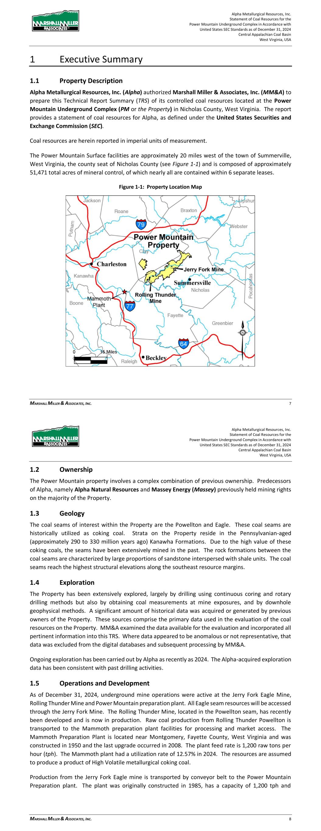Alpha Metallurgical Resources, Inc. Statement of Coal Resources for the Power Mountain Underground Complex in Accordance with United States SEC Standards as of December 31, 2024 Central Appalachian Coal Basin West Virginia, USA MARSHALL MILLER & ASSOCIATES, INC. 7 1 Executive Summary 1.1 Property Description Alpha Metallurgical Resources, Inc. (Alpha) authorized Marshall Miller & Associates, Inc. (MM&A) to prepare this Technical Report Summary (TRS) of its controlled coal resources located at the Power Mountain Underground Complex (PM or the Property) in Nicholas County, West Virginia. The report provides a statement of coal resources for Alpha, as defined under the United States Securities and Exchange Commission (SEC). Coal resources are herein reported in imperial units of measurement. The Power Mountain Surface facilities are approximately 20 miles west of the town of Summerville, West Virginia, the county seat of Nicholas County (see Figure 1-1) and is composed of approximately 51,471 total acres of mineral control, of which nearly all are contained within 6 separate leases. Figure 1-1: Property Location Map Alpha Metallurgical Resources, Inc. Statement of Coal Resources for the Power Mountain Underground Complex in Accordance with United States SEC Standards as of December 31, 2024 Central Appalachian Coal Basin West Virginia, USA MARSHALL MILLER & ASSOCIATES, INC. 8 1.2 Ownership The Power Mountain property involves a complex combination of previous ownership. Predecessors of Alpha, namely Alpha Natural Resources and Massey Energy (Massey) previously held mining rights on the majority of the Property. 1.3 Geology The coal seams of interest within the Property are the Powellton and Eagle. These coal seams are historically utilized as coking coal. Strata on the Property reside in the Pennsylvanian-aged (approximately 290 to 330 million years ago) Kanawha Formations. Due to the high value of these coking coals, the seams have been extensively mined in the past. The rock formations between the coal seams are characterized by large proportions of sandstone interspersed with shale units. The coal seams reach the highest structural elevations along the southeast resource margins. 1.4 Exploration The Property has been extensively explored, largely by drilling using continuous coring and rotary drilling methods but also by obtaining coal measurements at mine exposures, and by downhole geophysical methods. A significant amount of historical data was acquired or generated by previous owners of the Property. These sources comprise the primary data used in the evaluation of the coal resources on the Property. MM&A examined the data available for the evaluation and incorporated all pertinent information into this TRS. Where data appeared to be anomalous or not representative, that data was excluded from the digital databases and subsequent processing by MM&A. Ongoing exploration has been carried out by Alpha as recently as 2024. The Alpha-acquired exploration data has been consistent with past drilling activities. 1.5 Operations and Development As of December 31, 2024, underground mine operations were active at the Jerry Fork Eagle Mine, Rolling Thunder Mine and Power Mountain preparation plant. All Eagle seam resources will be accessed through the Jerry Fork Mine. The Rolling Thunder Mine, located in the Powellton seam, has recently been developed and is now in production. Raw coal production from Rolling Thunder Powellton is transported to the Mammoth preparation plant facilities for processing and market access. The Mammoth Preparation Plant is located near Montgomery, Fayette County, West Virginia and was constructed in 1950 and the last upgrade occurred in 2008. The plant feed rate is 1,200 raw tons per hour (tph). The Mammoth plant had a utilization rate of 12.57% in 2024. The resources are assumed to produce a product of High Volatile metallurgical coking coal. Production from the Jerry Fork Eagle mine is transported by conveyor belt to the Power Mountain Preparation plant. The plant was originally constructed in 1985, has a capacity of 1,200 tph and