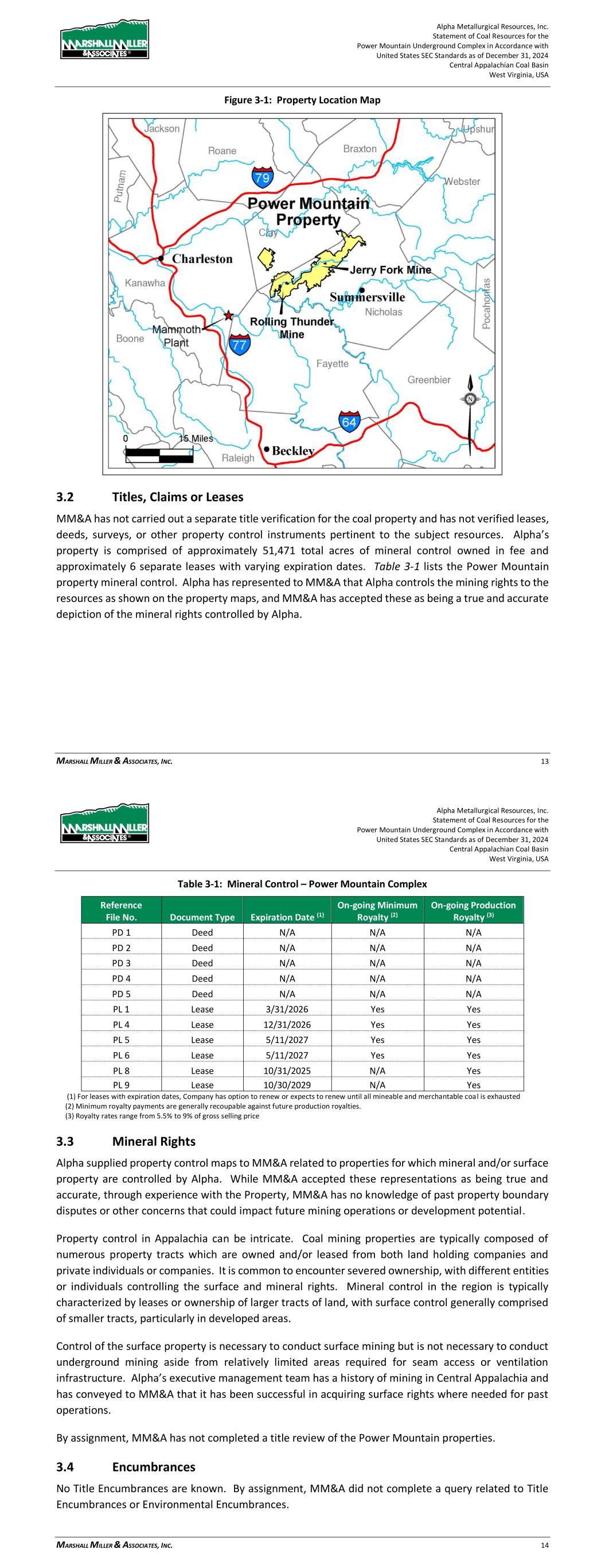 Alpha Metallurgical Resources, Inc. Statement of Coal Resources for the Power Mountain Underground Complex in Accordance with United States SEC Standards as of December 31, 2024 Central Appalachian Coal Basin West Virginia, USA MARSHALL MILLER & ASSOCIATES, INC. 13 Figure 3-1: Property Location Map 3.2 Titles, Claims or Leases MM&A has not carried out a separate title verification for the coal property and has not verified leases, deeds, surveys, or other property control instruments pertinent to the subject resources. Alpha’s property is comprised of approximately 51,471 total acres of mineral control owned in fee and approximately 6 separate leases with varying expiration dates. Table 3-1 lists the Power Mountain property mineral control. Alpha has represented to MM&A that Alpha controls the mining rights to the resources as shown on the property maps, and MM&A has accepted these as being a true and accurate depiction of the mineral rights controlled by Alpha. Alpha Metallurgical Resources, Inc. Statement of Coal Resources for the Power Mountain Underground Complex in Accordance with United States SEC Standards as of December 31, 2024 Central Appalachian Coal Basin West Virginia, USA MARSHALL MILLER & ASSOCIATES, INC. 14 Table 3-1: Mineral Control – Power Mountain Complex Reference File No. Document Type Expiration Date (1) On-going Minimum Royalty (2) On-going Production Royalty (3) PD 1 Deed N/A N/A N/A PD 2 Deed N/A N/A N/A PD 3 Deed N/A N/A N/A PD 4 Deed N/A N/A N/A PD 5 Deed N/A N/A N/A PL 1 Lease 3/31/2026 Yes Yes PL 4 Lease 12/31/2026 Yes Yes PL 5 Lease 5/11/2027 Yes Yes PL 6 Lease 5/11/2027 Yes Yes PL 8 Lease 10/31/2025 N/A Yes PL 9 Lease 10/30/2029 N/A Yes (1) For leases with expiration dates, Company has option to renew or expects to renew until all mineable and merchantable coal is exhausted (2) Minimum royalty payments are generally recoupable against future production royalties. (3) Royalty rates range from 5.5% to 9% of gross selling price 3.3 Mineral Rights Alpha supplied property control maps to MM&A related to properties for which mineral and/or surface property are controlled by Alpha. While MM&A accepted these representations as being true and accurate, through experience with the Property, MM&A has no knowledge of past property boundary disputes or other concerns that could impact future mining operations or development potential. Property control in Appalachia can be intricate. Coal mining properties are typically composed of numerous property tracts which are owned and/or leased from both land holding companies and private individuals or companies. It is common to encounter severed ownership, with different entities or individuals controlling the surface and mineral rights. Mineral control in the region is typically characterized by leases or ownership of larger tracts of land, with surface control generally comprised of smaller tracts, particularly in developed areas. Control of the surface property is necessary to conduct surface mining but is not necessary to conduct underground mining aside from relatively limited areas required for seam access or ventilation infrastructure. Alpha’s executive management team has a history of mining in Central Appalachia and has conveyed to MM&A that it has been successful in acquiring surface rights where needed for past operations. By assignment, MM&A has not completed a title review of the Power Mountain properties. 3.4 Encumbrances No Title Encumbrances are known. By assignment, MM&A did not complete a query related to Title Encumbrances or Environmental Encumbrances.