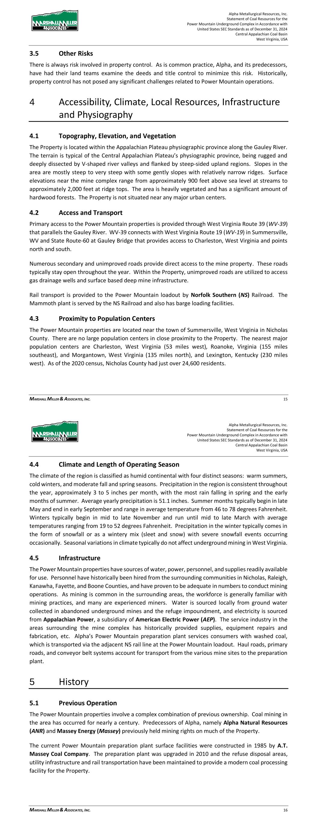 Alpha Metallurgical Resources, Inc. Statement of Coal Resources for the Power Mountain Underground Complex in Accordance with United States SEC Standards as of December 31, 2024 Central Appalachian Coal Basin West Virginia, USA MARSHALL MILLER & ASSOCIATES, INC. 15 3.5 Other Risks There is always risk involved in property control. As is common practice, Alpha, and its predecessors, have had their land teams examine the deeds and title control to minimize this risk. Historically, property control has not posed any significant challenges related to Power Mountain operations. 4 Accessibility, Climate, Local Resources, Infrastructure and Physiography 4.1 Topography, Elevation, and Vegetation The Property is located within the Appalachian Plateau physiographic province along the Gauley River. The terrain is typical of the Central Appalachian Plateau’s physiographic province, being rugged and deeply dissected by V-shaped river valleys and flanked by steep-sided upland regions. Slopes in the area are mostly steep to very steep with some gently slopes with relatively narrow ridges. Surface elevations near the mine complex range from approximately 900 feet above sea level at streams to approximately 2,000 feet at ridge tops. The area is heavily vegetated and has a significant amount of hardwood forests. The Property is not situated near any major urban centers. 4.2 Access and Transport Primary access to the Power Mountain properties is provided through West Virginia Route 39 (WV-39) that parallels the Gauley River. WV-39 connects with West Virginia Route 19 (WV-19) in Summersville, WV and State Route-60 at Gauley Bridge that provides access to Charleston, West Virginia and points north and south. Numerous secondary and unimproved roads provide direct access to the mine property. These roads typically stay open throughout the year. Within the Property, unimproved roads are utilized to access gas drainage wells and surface based deep mine infrastructure. Rail transport is provided to the Power Mountain loadout by Norfolk Southern (NS) Railroad. The Mammoth plant is served by the NS Railroad and also has barge loading facilities. 4.3 Proximity to Population Centers The Power Mountain properties are located near the town of Summersville, West Virginia in Nicholas County. There are no large population centers in close proximity to the Property. The nearest major population centers are Charleston, West Virginia (53 miles west), Roanoke, Virginia (155 miles southeast), and Morgantown, West Virginia (135 miles north), and Lexington, Kentucky (230 miles west). As of the 2020 census, Nicholas County had just over 24,600 residents. Alpha Metallurgical Resources, Inc. Statement of Coal Resources for the Power Mountain Underground Complex in Accordance with United States SEC Standards as of December 31, 2024 Central Appalachian Coal Basin West Virginia, USA MARSHALL MILLER & ASSOCIATES, INC. 16 4.4 Climate and Length of Operating Season The climate of the region is classified as humid continental with four distinct seasons: warm summers, cold winters, and moderate fall and spring seasons. Precipitation in the region is consistent throughout the year, approximately 3 to 5 inches per month, with the most rain falling in spring and the early months of summer. Average yearly precipitation is 51.1 inches. Summer months typically begin in late May and end in early September and range in average temperature from 46 to 78 degrees Fahrenheit. Winters typically begin in mid to late November and run until mid to late March with average temperatures ranging from 19 to 52 degrees Fahrenheit. Precipitation in the winter typically comes in the form of snowfall or as a wintery mix (sleet and snow) with severe snowfall events occurring occasionally. Seasonal variations in climate typically do not affect underground mining in West Virginia. 4.5 Infrastructure The Power Mountain properties have sources of water, power, personnel, and supplies readily available for use. Personnel have historically been hired from the surrounding communities in Nicholas, Raleigh, Kanawha, Fayette, and Boone Counties, and have proven to be adequate in numbers to conduct mining operations. As mining is common in the surrounding areas, the workforce is generally familiar with mining practices, and many are experienced miners. Water is sourced locally from ground water collected in abandoned underground mines and the refuge impoundment, and electricity is sourced from Appalachian Power, a subsidiary of American Electric Power (AEP). The service industry in the areas surrounding the mine complex has historically provided supplies, equipment repairs and fabrication, etc. Alpha’s Power Mountain preparation plant services consumers with washed coal, which is transported via the adjacent NS rail line at the Power Mountain loadout. Haul roads, primary roads, and conveyor belt systems account for transport from the various mine sites to the preparation plant. 5 History 5.1 Previous Operation The Power Mountain properties involve a complex combination of previous ownership. Coal mining in the area has occurred for nearly a century. Predecessors of Alpha, namely Alpha Natural Resources (ANR) and Massey Energy (Massey) previously held mining rights on much of the Property. The current Power Mountain preparation plant surface facilities were constructed in 1985 by A.T. Massey Coal Company. The preparation plant was upgraded in 2010 and the refuse disposal areas, utility infrastructure and rail transportation have been maintained to provide a modern coal processing facility for the Property.